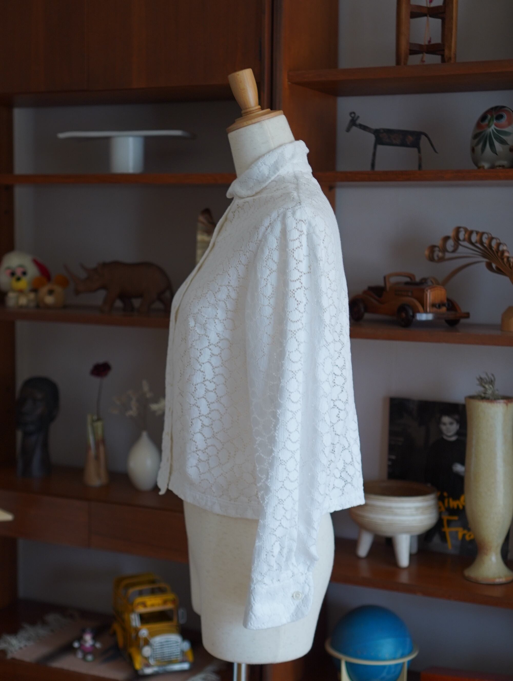 ぽこぽことしたちいさなボタンと花びらのようなチャームポイントなレースシャツ。やわらかなコットン素材で肌あたりもやさしく、着回しがたのしくなるような一着。カジュアルにも、ちょっとおめかしにも着回せる、嬉しいブラウスです。普段S∼Mサイズを着用される方におすすめいたします。/vintage blossom sheer lace blouse