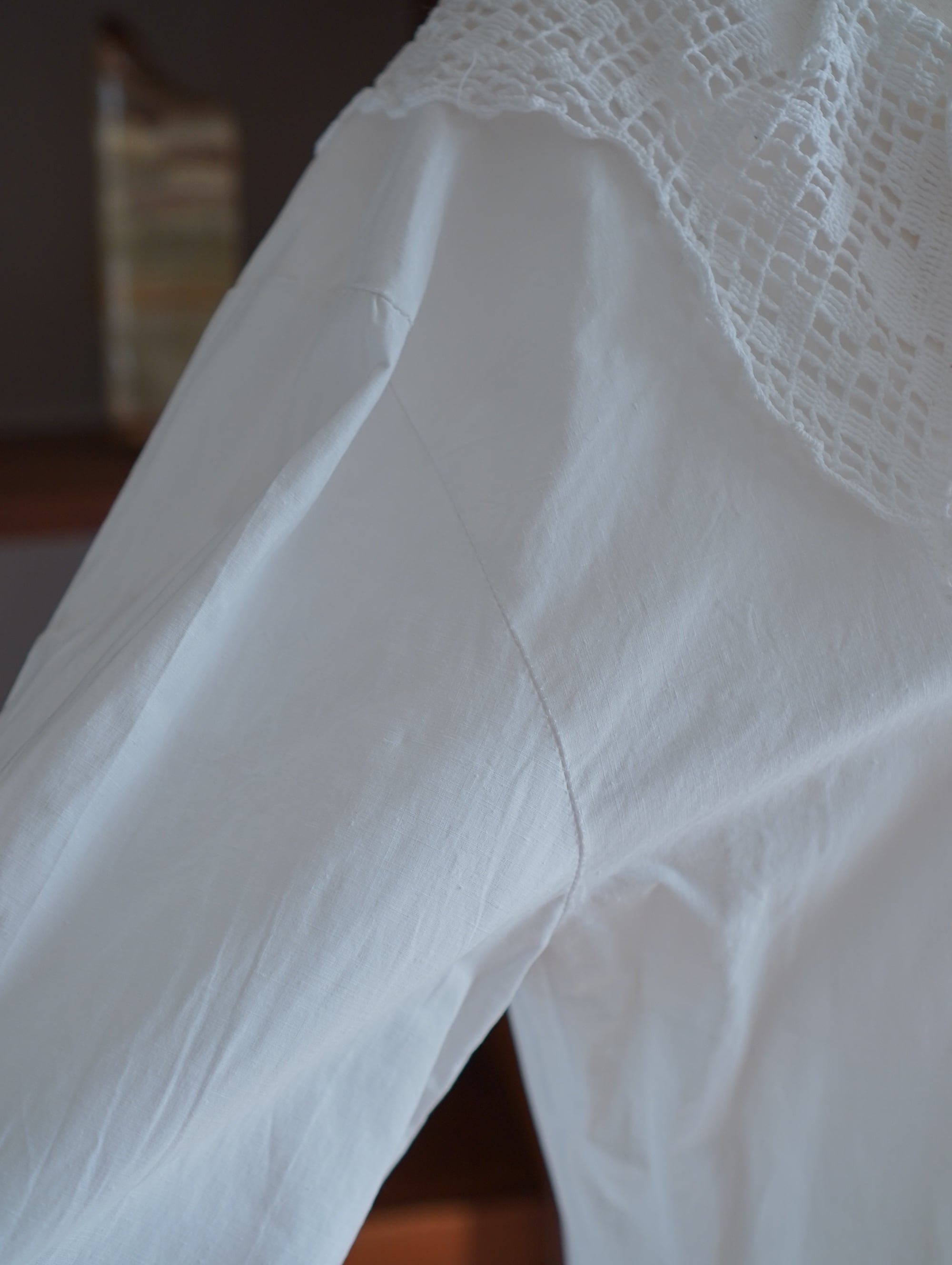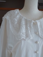 おおきめのレース襟がチャームポイントな、アンティークのホワイトコットンドレス。襟・袖口・ポケット・裾にあしらわれた手編みクロシェレースがきゅんポイント。しっかりとしたコットンの質感と、ころんとしたシェル風ボタンも、キュートです。ベストやジャケット、ニットと重ねて襟を見せてあげてもキュートです。/vintage crochet collar dress with shell buttons