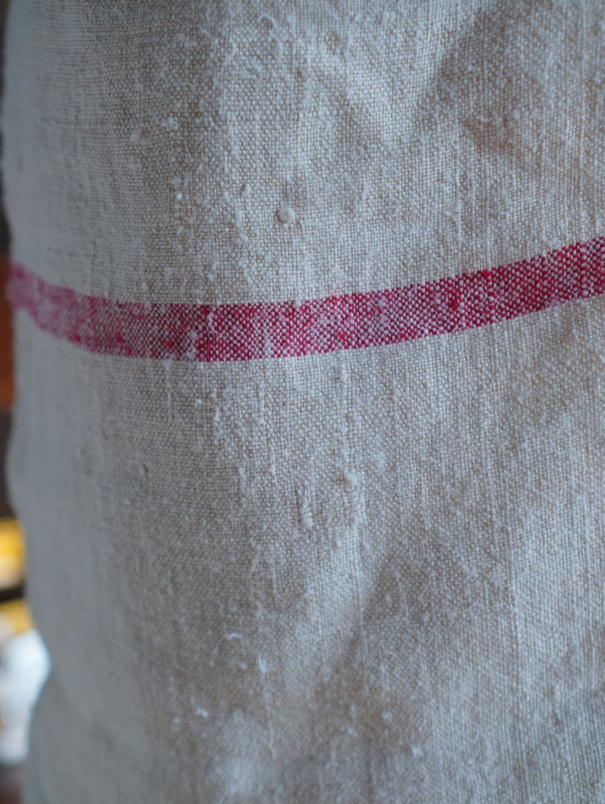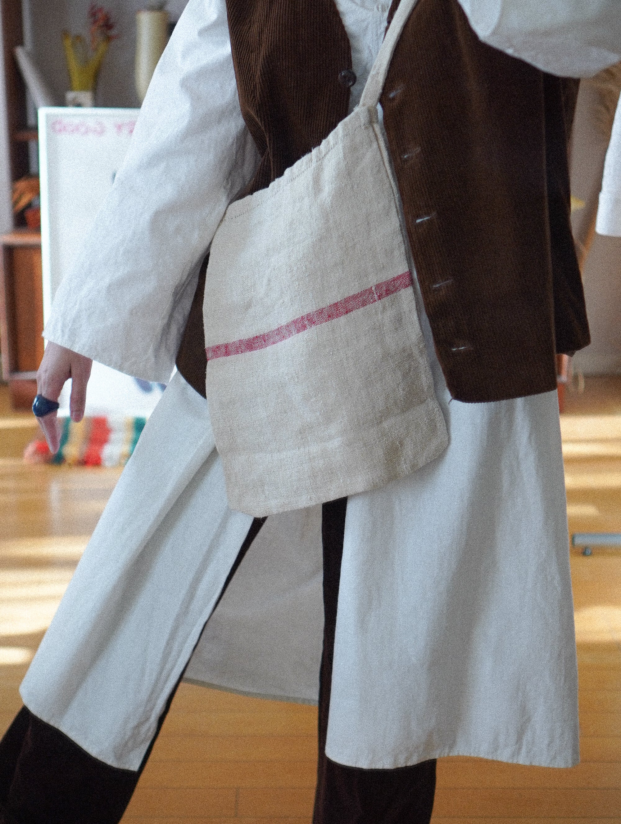 心温まる、ぬくもりたっぷりのハンドメイドのショルダーバッグ。ザラっとした風合いが魅力の手織りリネンに、赤のラインがきゅんと可愛いアクセント。生地はアンティークリネンを再利用しており、経年ならではのムラやネップも味わいのひとつ。肩掛けにちょうど良いストラップの長さで、軽やかに持ち歩けます。/handmade romanian Linen Shoulder Bag – Red Stripe/small