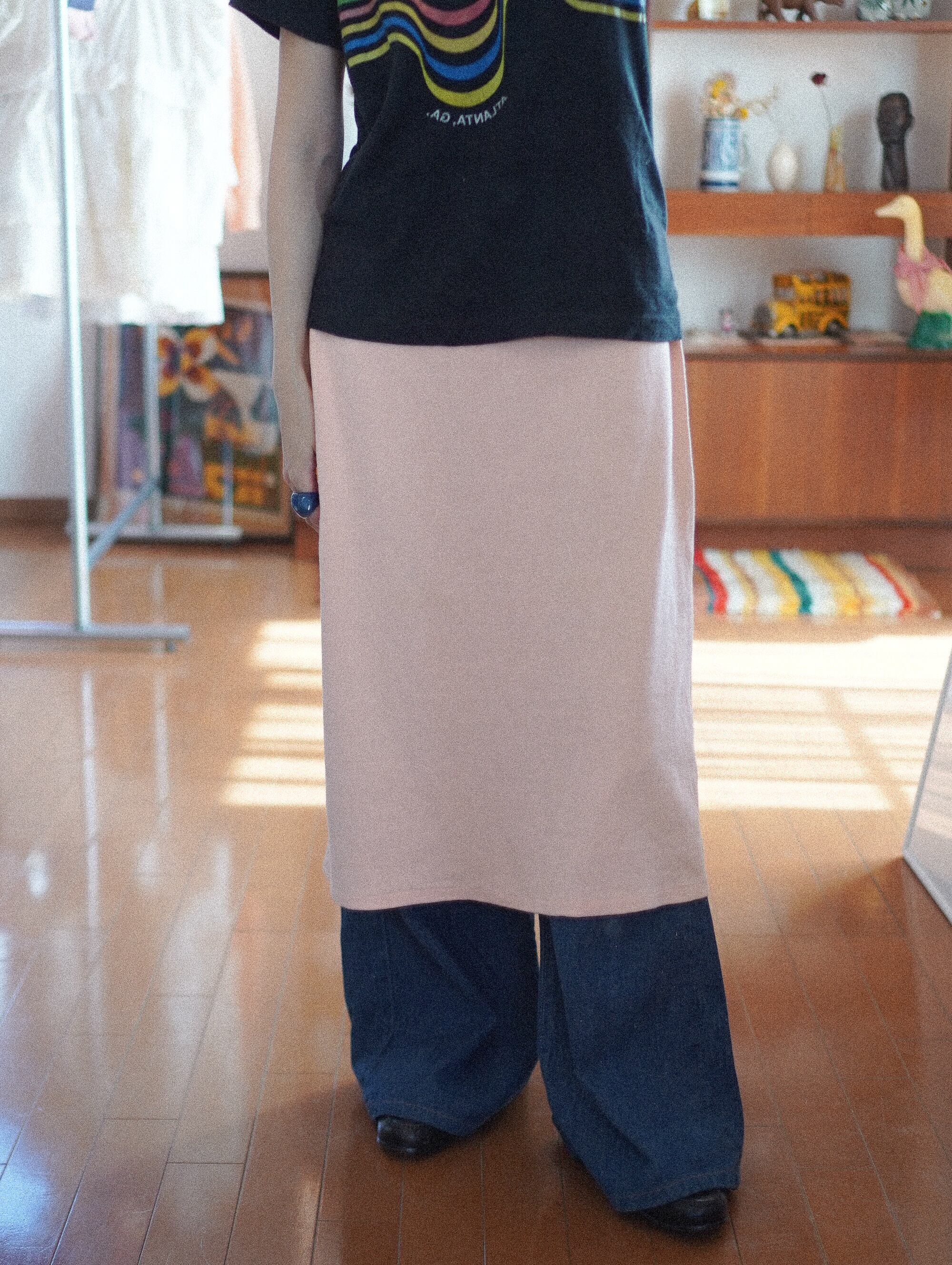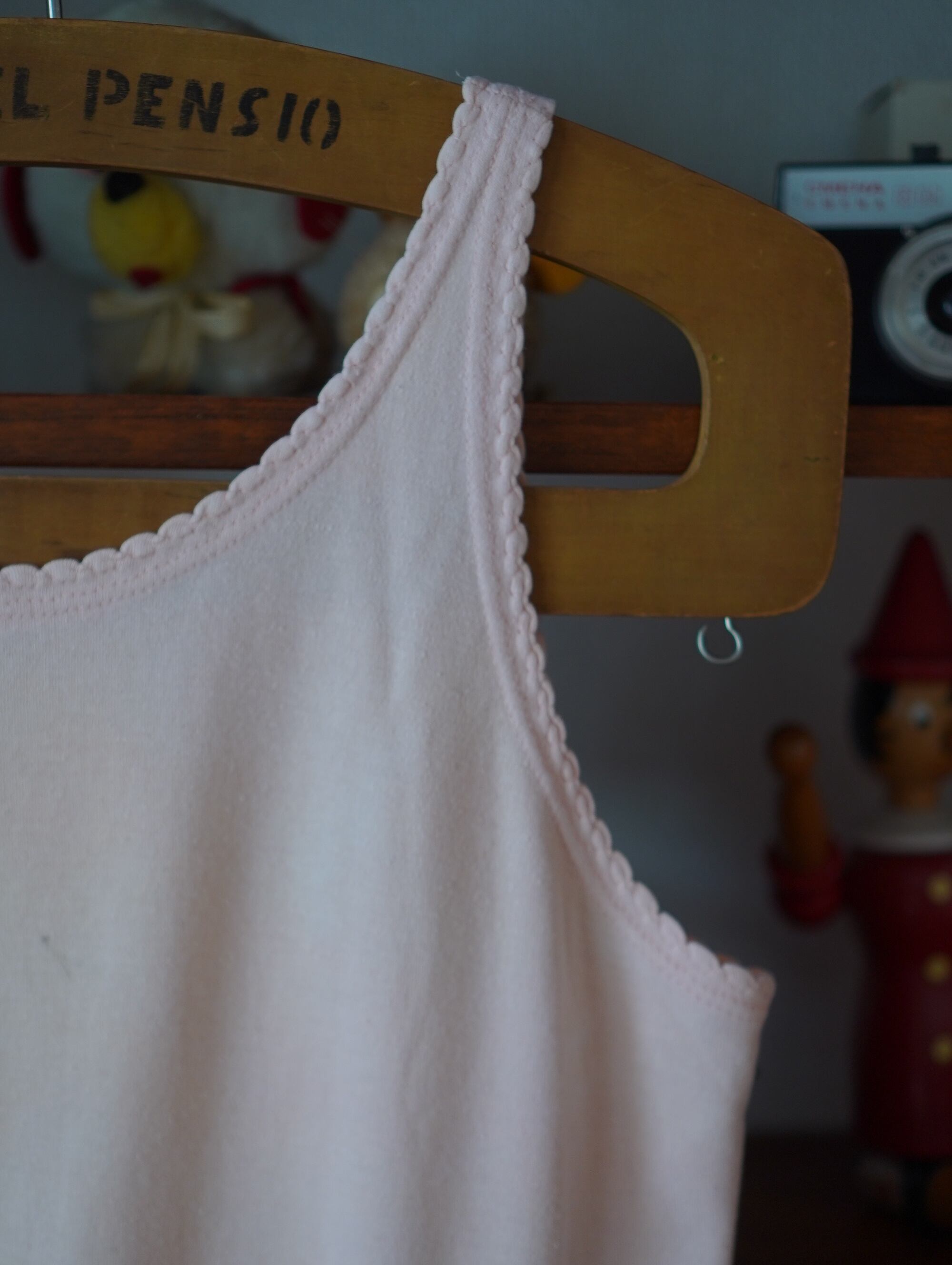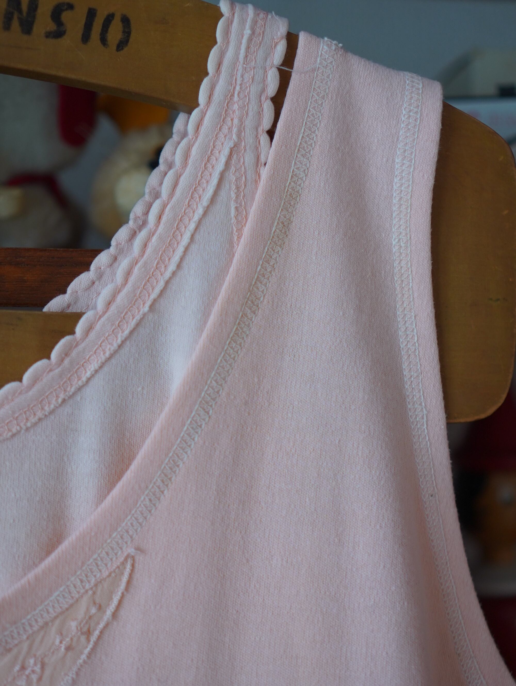 やさしいコットンの肌ざわりと、ほどよくからだにフィットして馴染んでくれるタンクトップとワンピースのセット。本来はインナーとしてつくられたヴィンテージの肌着ワンピースですが、膝下までしっかり届く丈感が魅力で、今なら一枚でワンピースとしても着たくなっちゃうようなときめき高まる一枚。色味は1930s〜40sによく見られるピーチピンク。ディテールからは50s〜60s前半頃と推定されます。首元には繊細なチュール刺繍があしらわれていて、シンプルながらもほんのりクラシカル。お部屋ではもちろん、夏にはteeと合わせたり、そのまま1枚でもさらりとお楽しみいただけます。-50s~60s vintage tank&one piece set