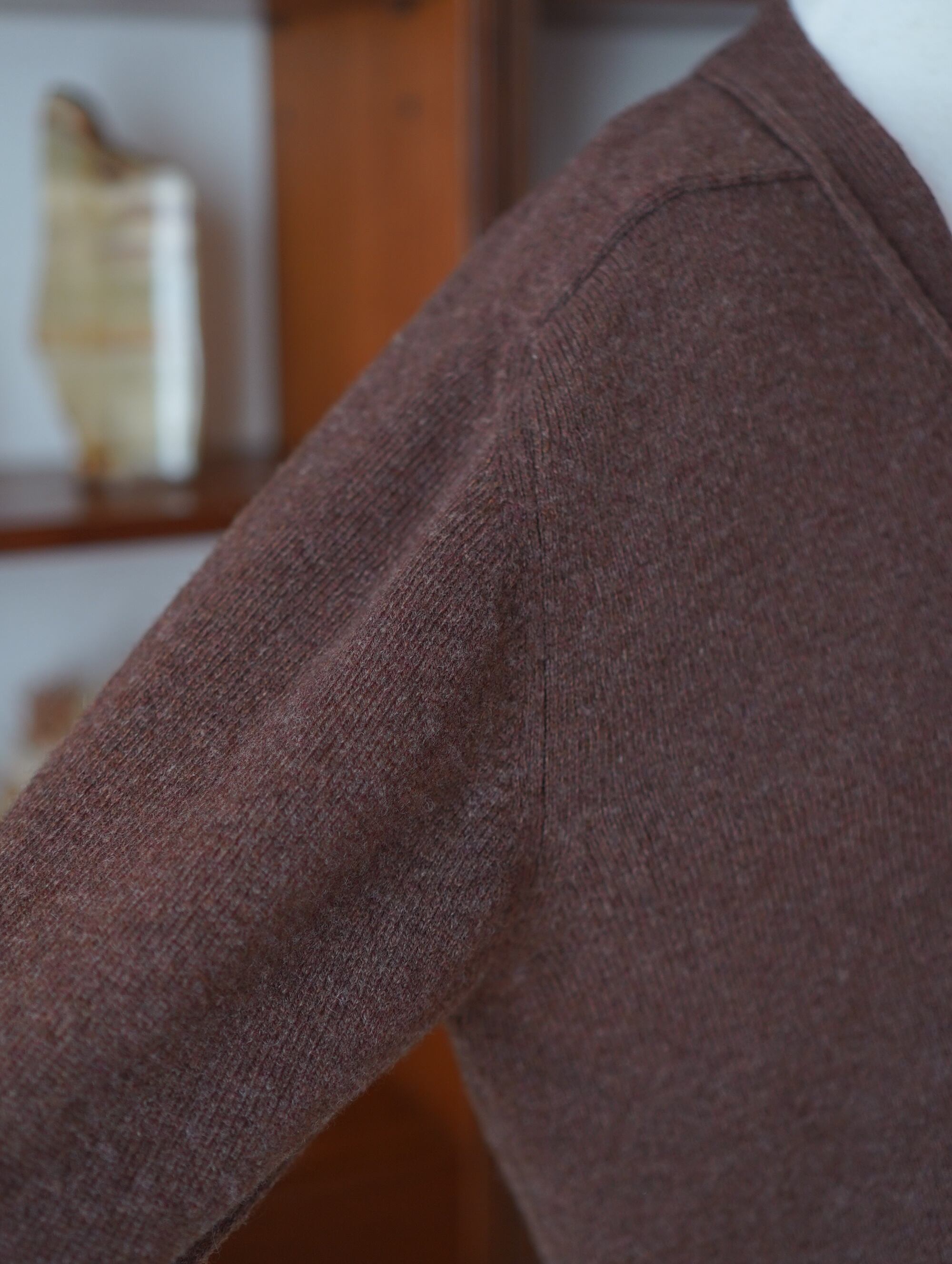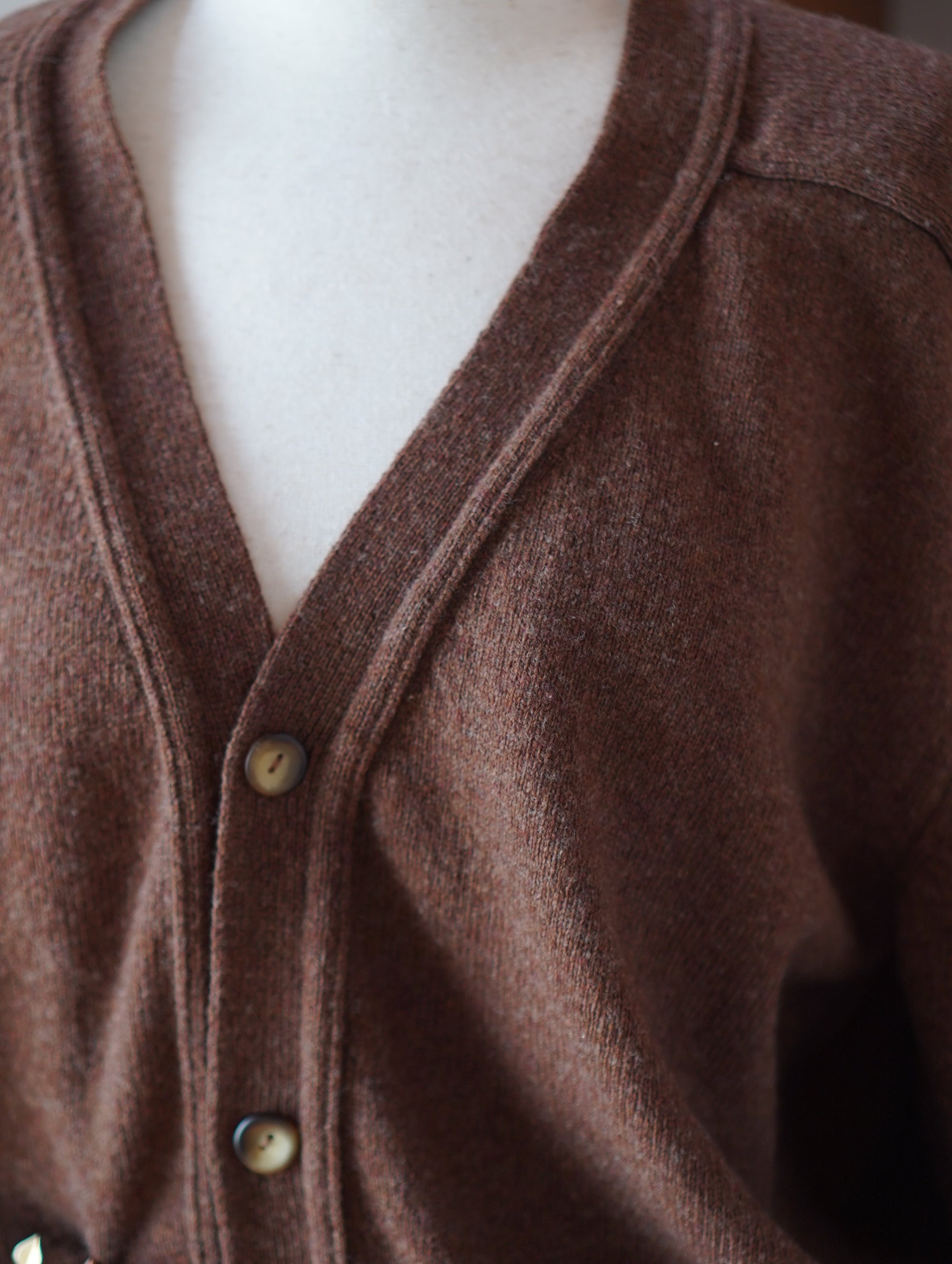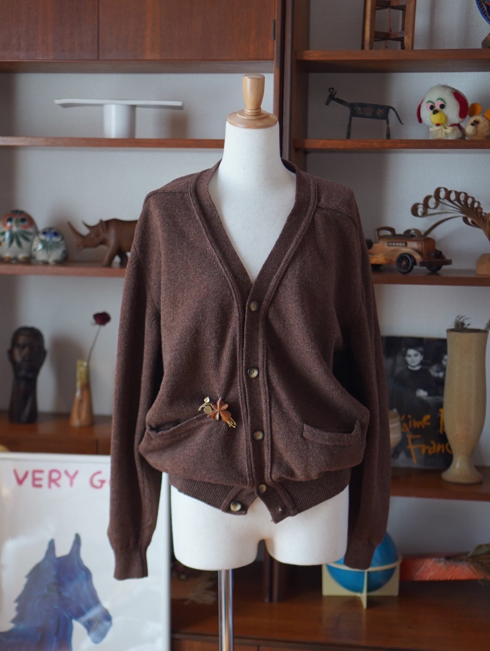 ウールマークタグ付き・ヴァージンウール100%の、とろっと柔らかな風合いとチョコレートブラウンカラーがキュートなフランス製のカーディガン。少し丸みのある肩と、ゆったりとした身幅のバランスが、どんなスタイリングにもすっと馴染んでくれます。コートの中にも着やすい軽やかさで、春先まで長く活躍してくれそうです。蚤の市で出会ったヴィンテージのブローチもいっしょに。-brown wool cardigan with broach