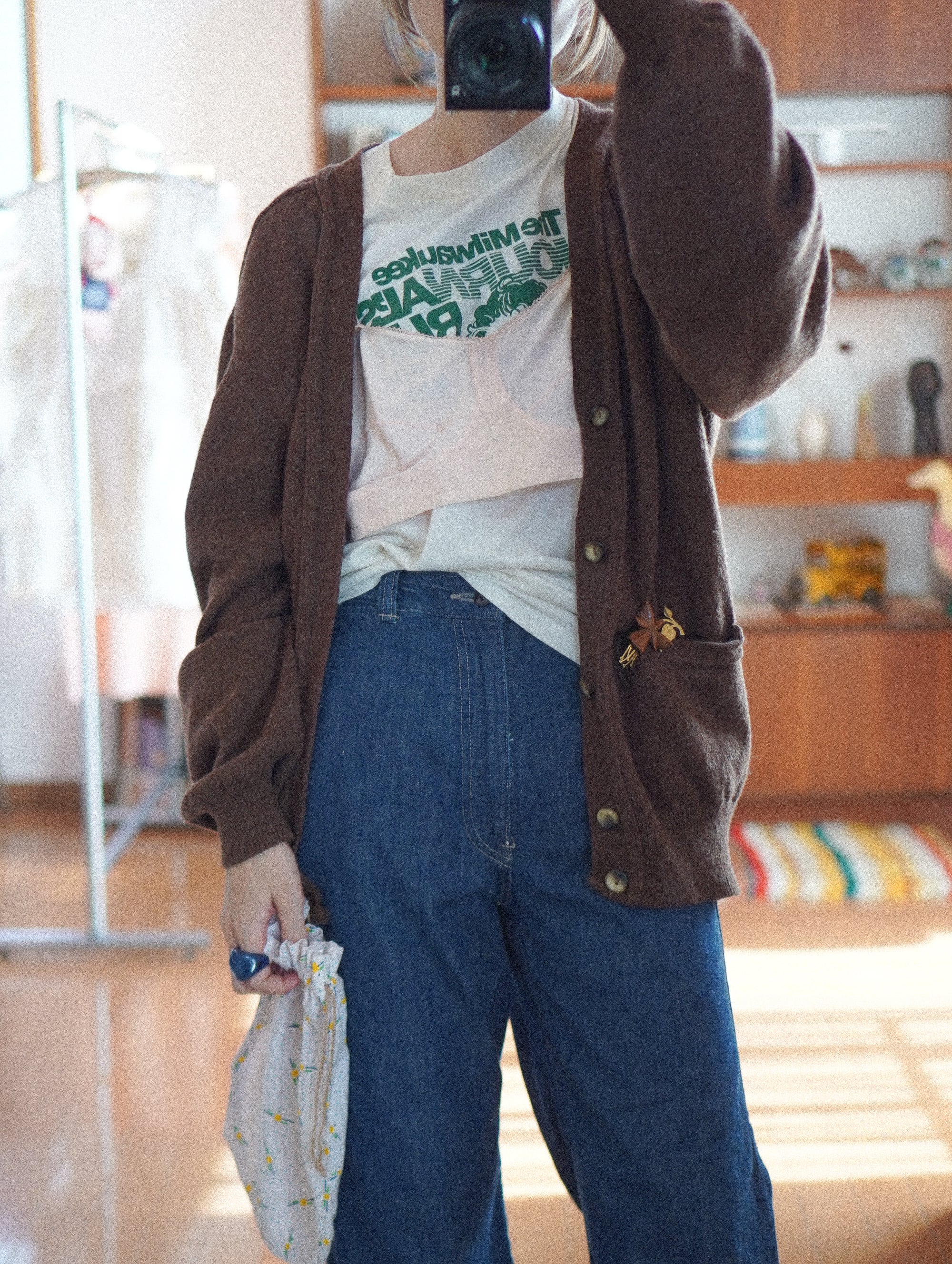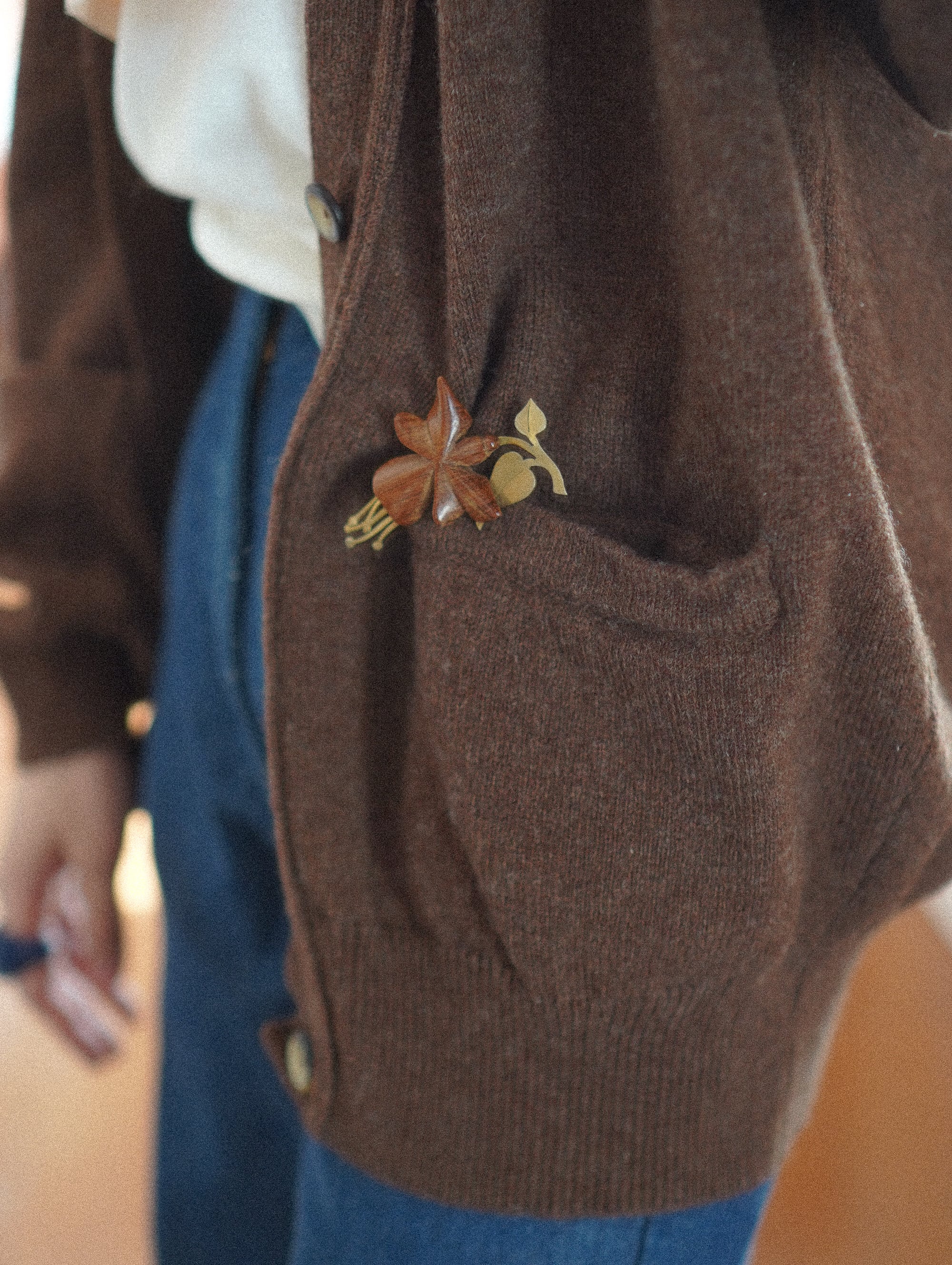 brown wool cardigan with broach