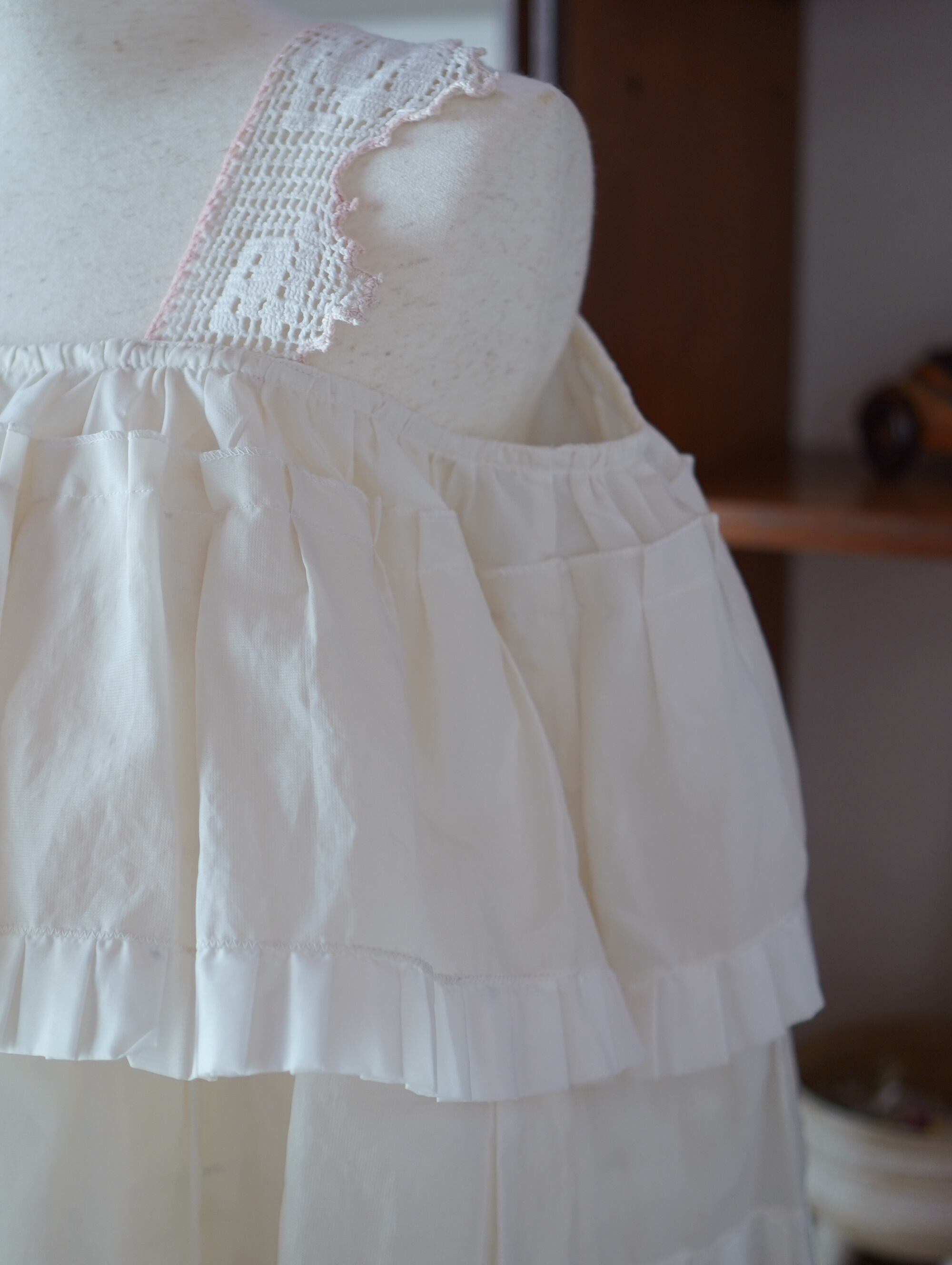 ハンガリーで出会ったふるいティアードスカートと、クロシェレースを合わせて、リメイクした一点もののトップス。中にカットソーやシャツを合わせたり、上からスウェットを羽織って、ちらっとレースを見せてあげたり、夏はそのまま1枚で、デニムと合わせてヘルシーに着てもキュートな1着です。どの角度から見ても愛おしいフォルムできゅんとします。繊細な生地のため、手洗いを推奨します。/-reworked tiered ruffle blouse from hungarian vintage skirt × crochet strap