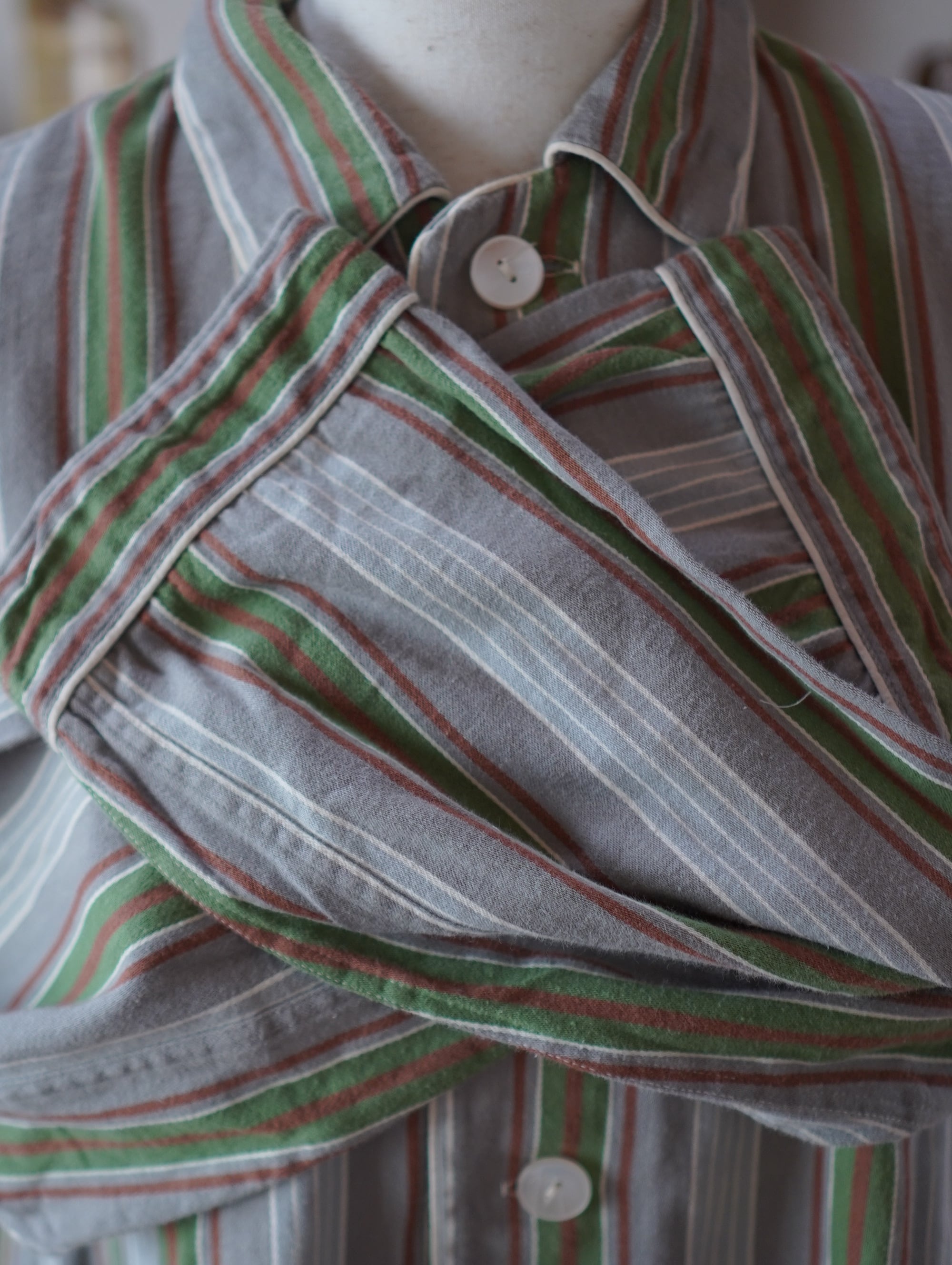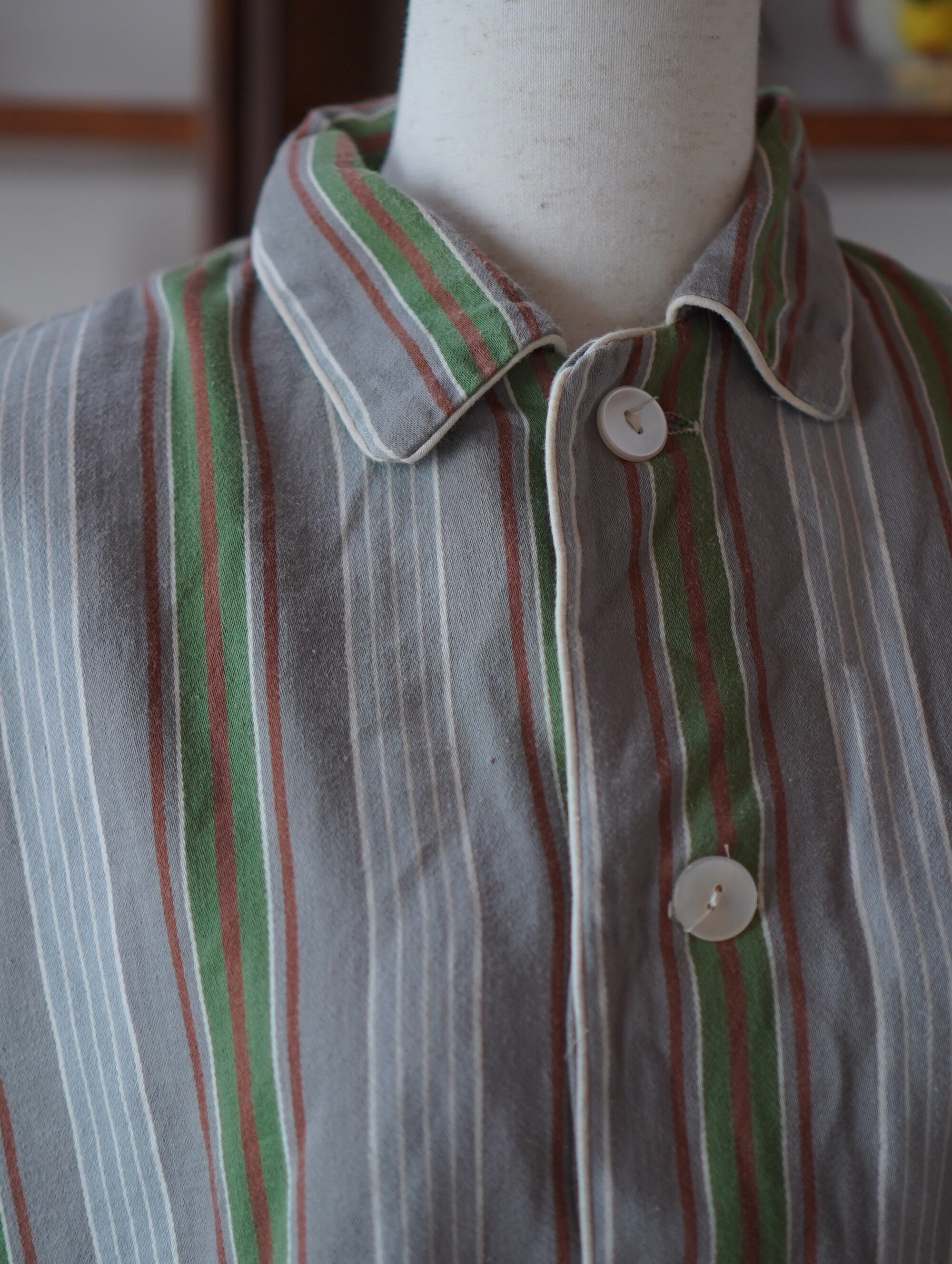 アイスブルーとブルーグレー、小豆色、そしてアンティークファブリックに見られるセージグリーンがひそやかに溶け込んだストライプがシックでクールな、50sごろの空気をまとったパジャマセットアップ。
