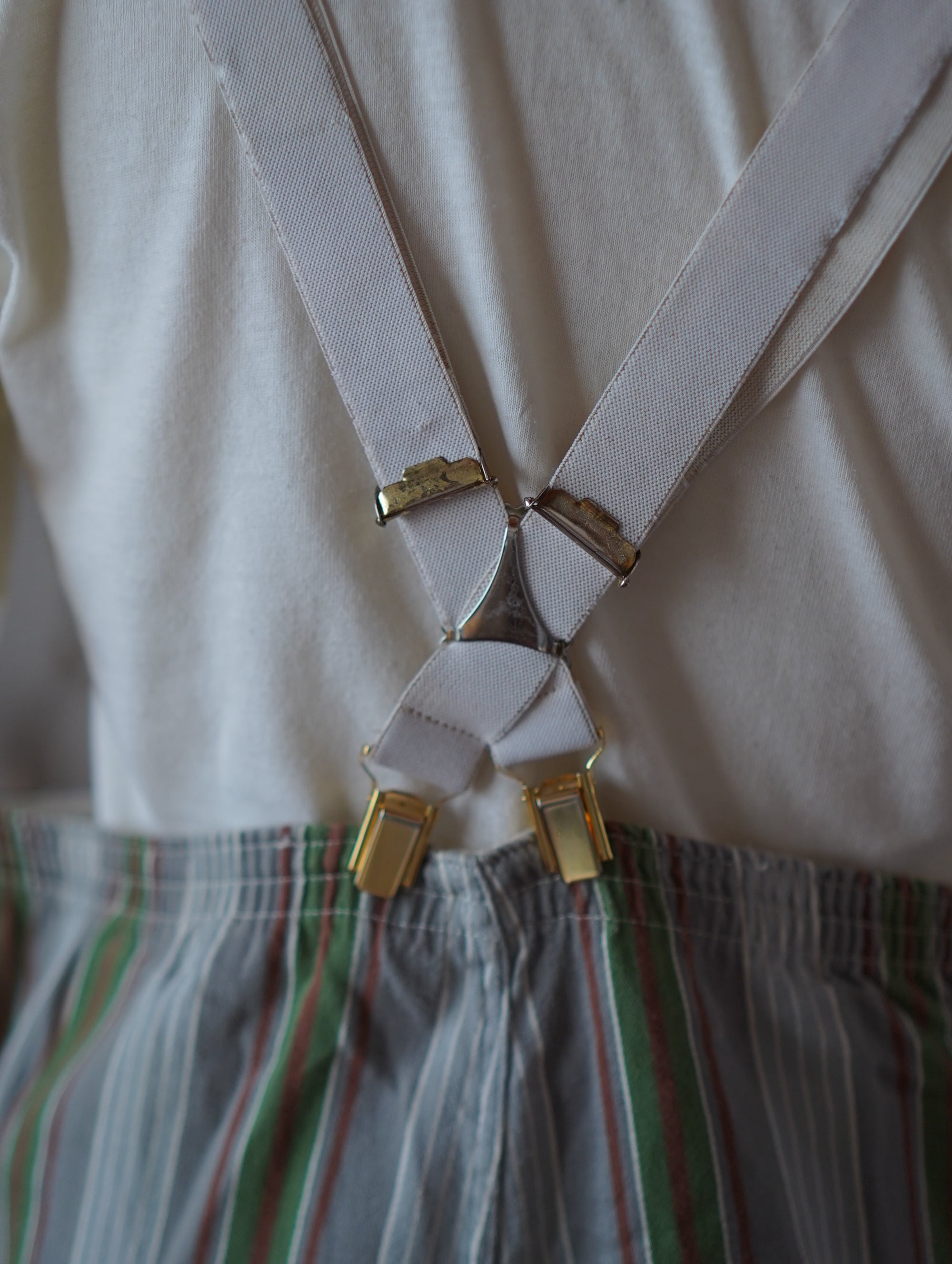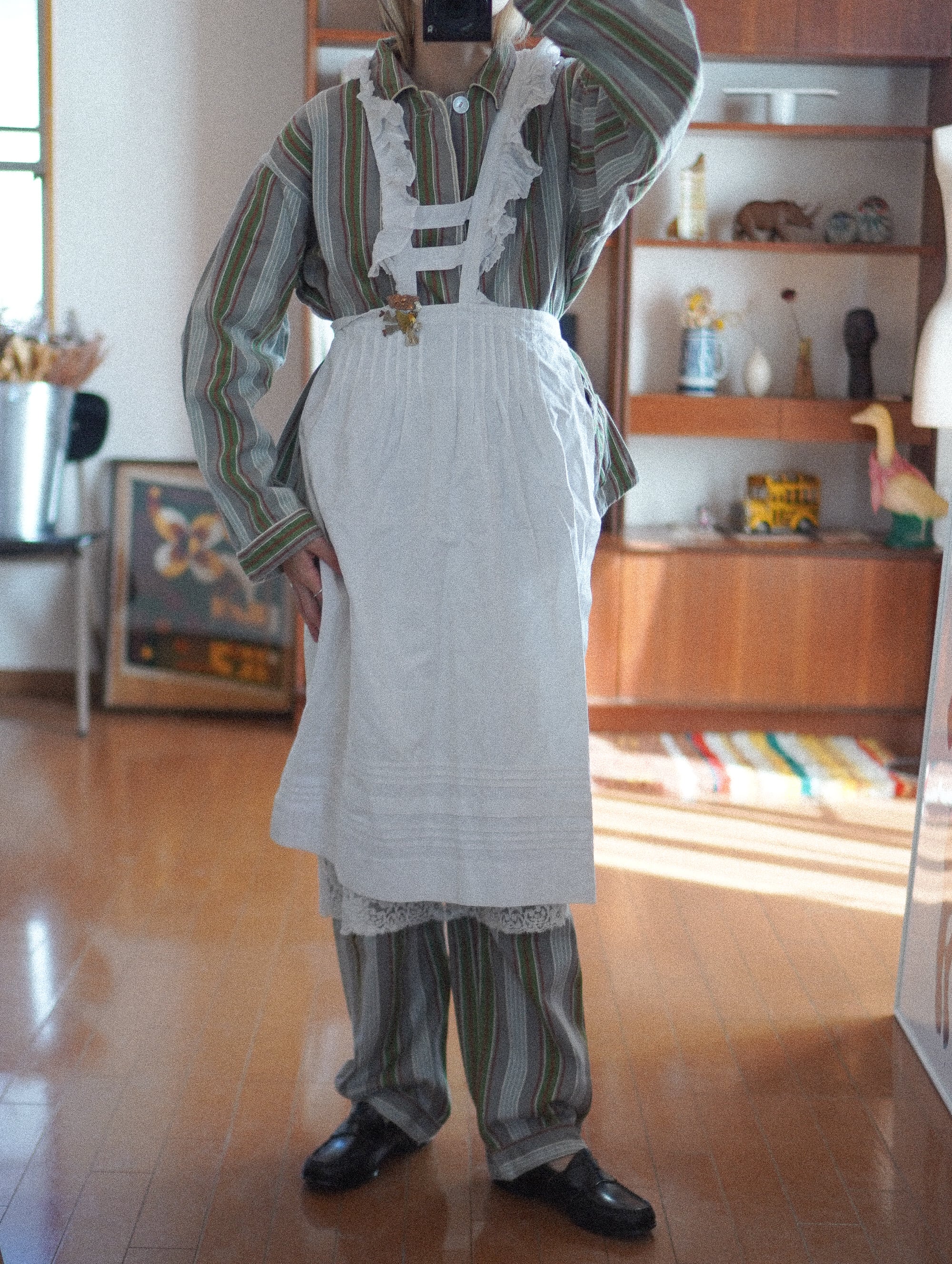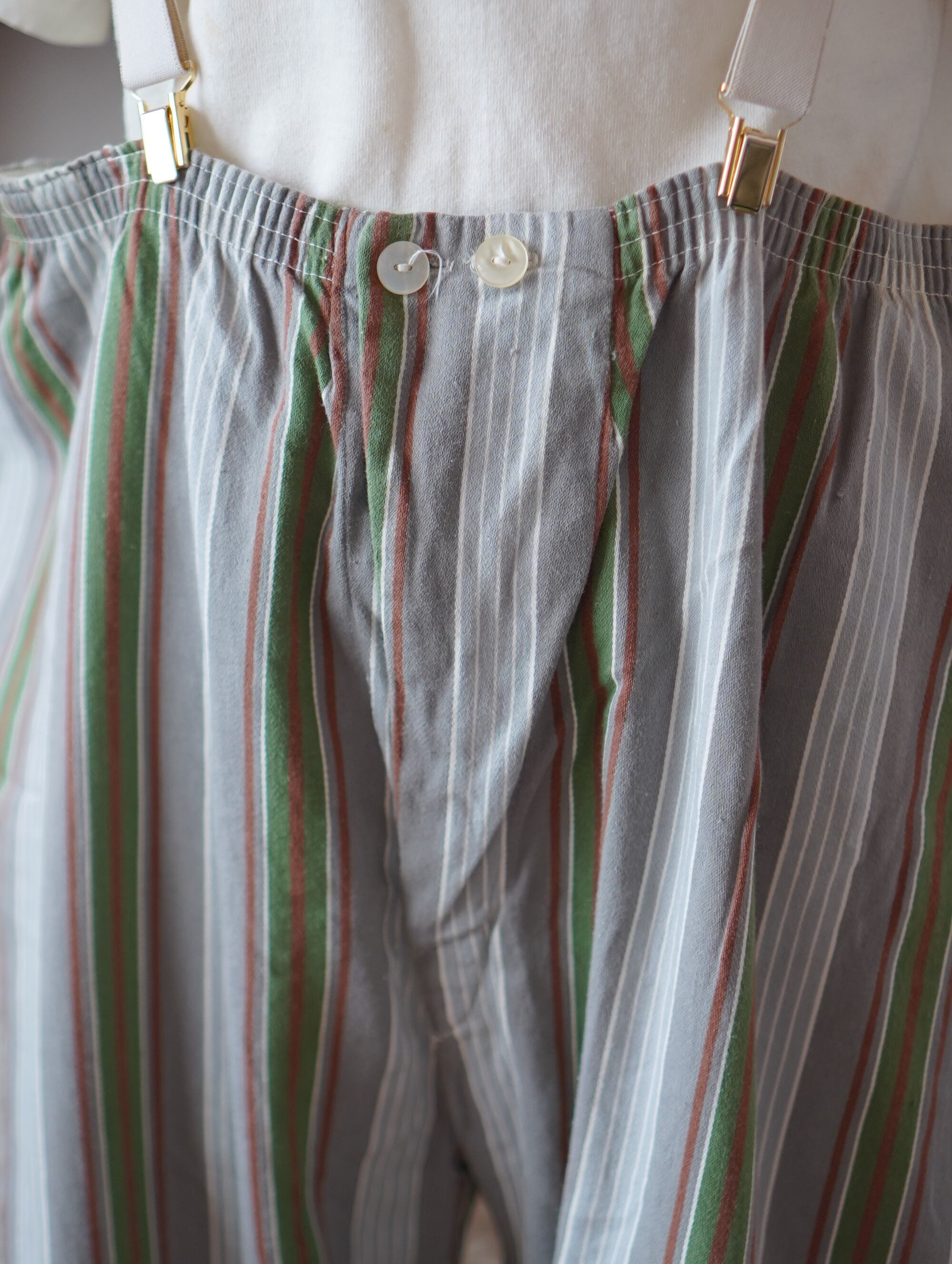 ウエストにゴムが入っておらず、ぶかぶかでどうしようかと思いましたが、良い感じのヴィンテージのサスペンダーと出会えたので、いっしょにお付けします。サスペンダーもいっしょに楽しんでいただければうれしいです。/euro vintage flannel pajamas setup with suspenders/ice blue × blue grey × azuki sage stripe
