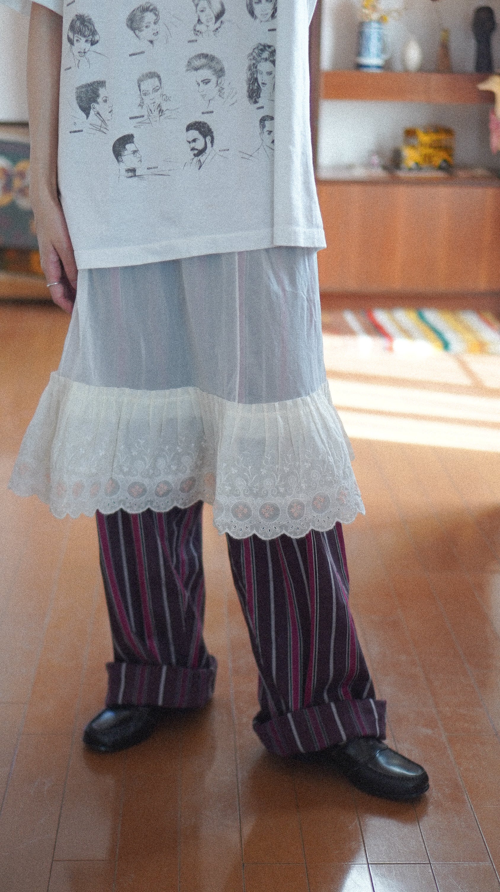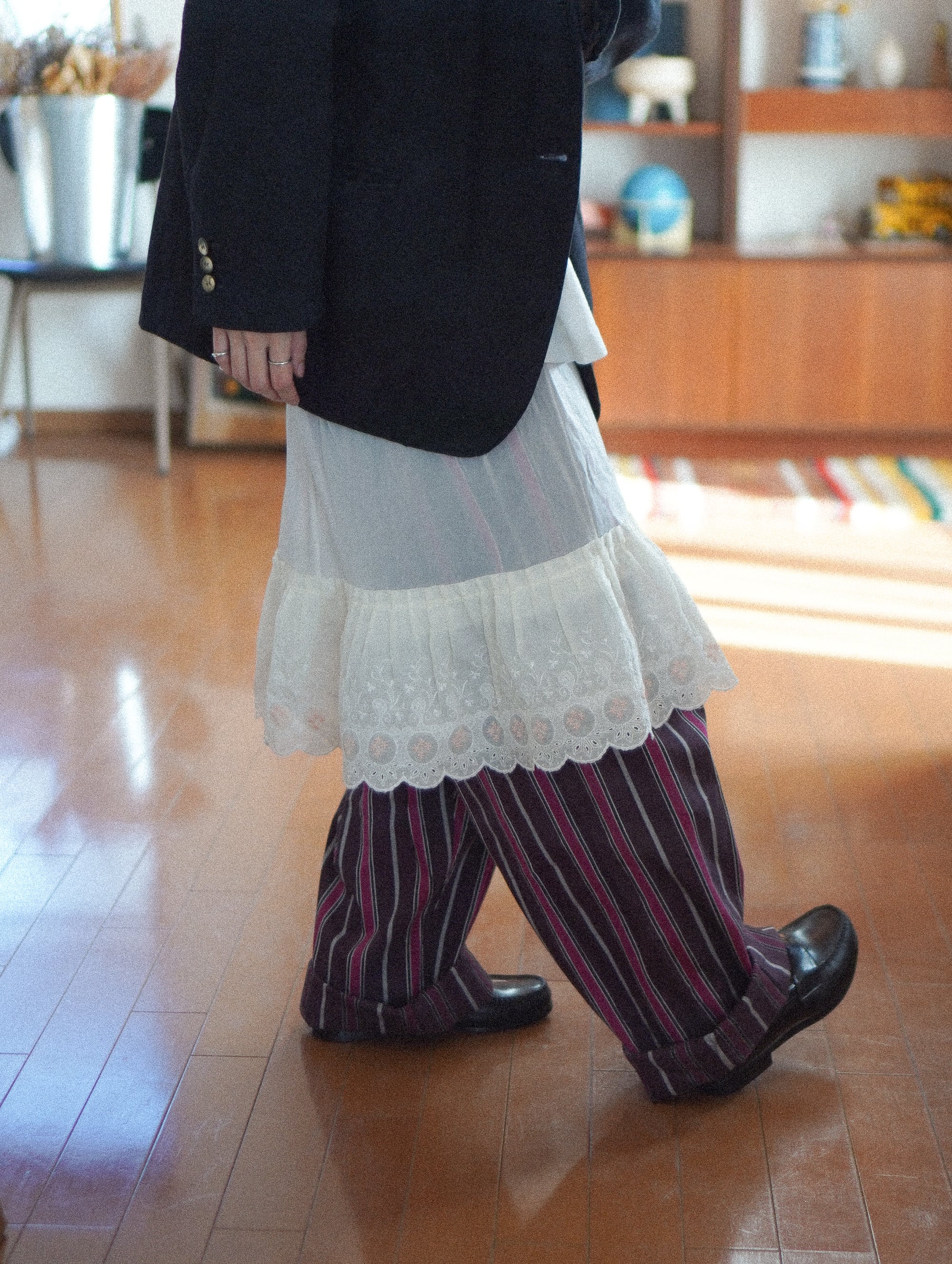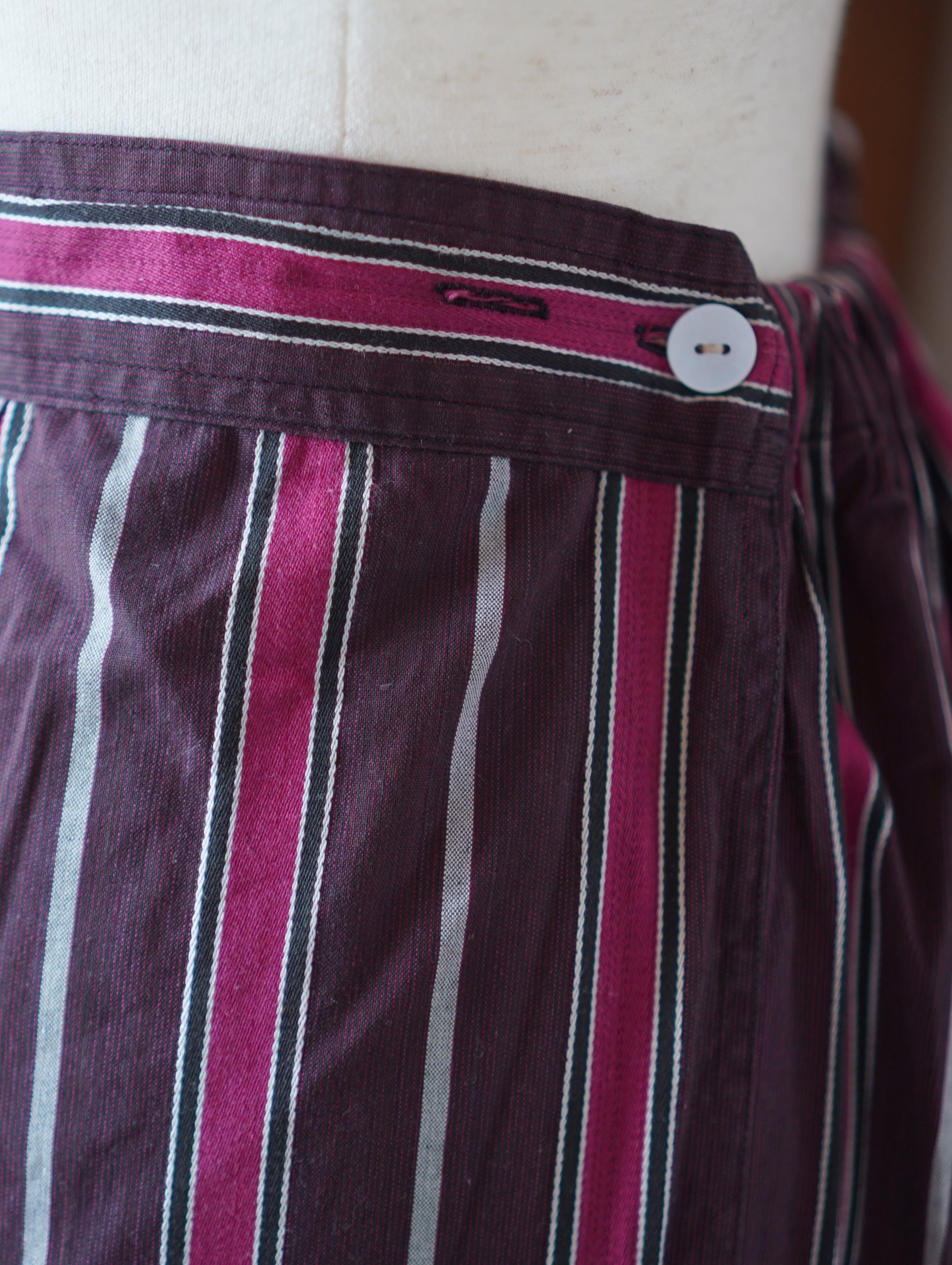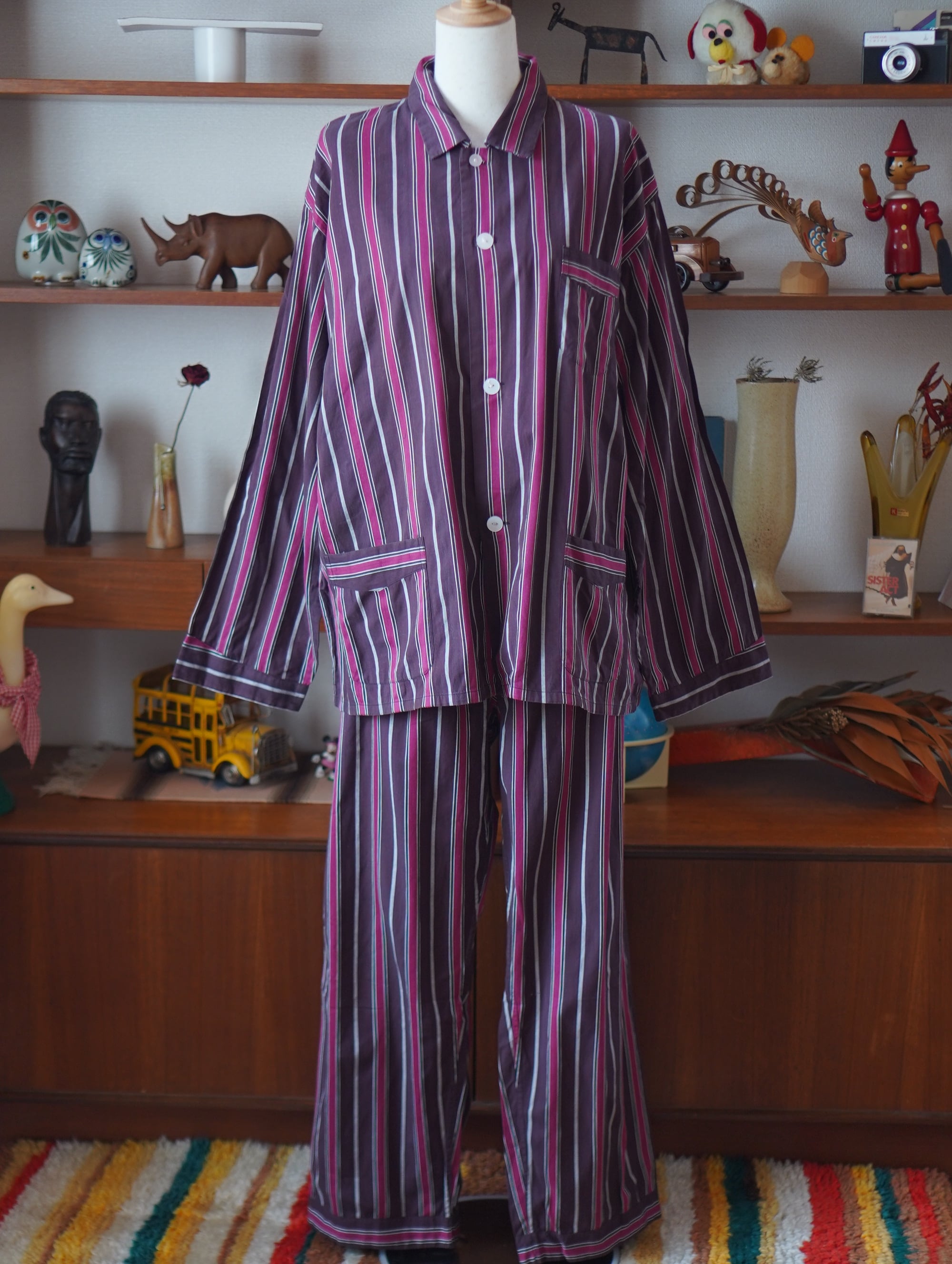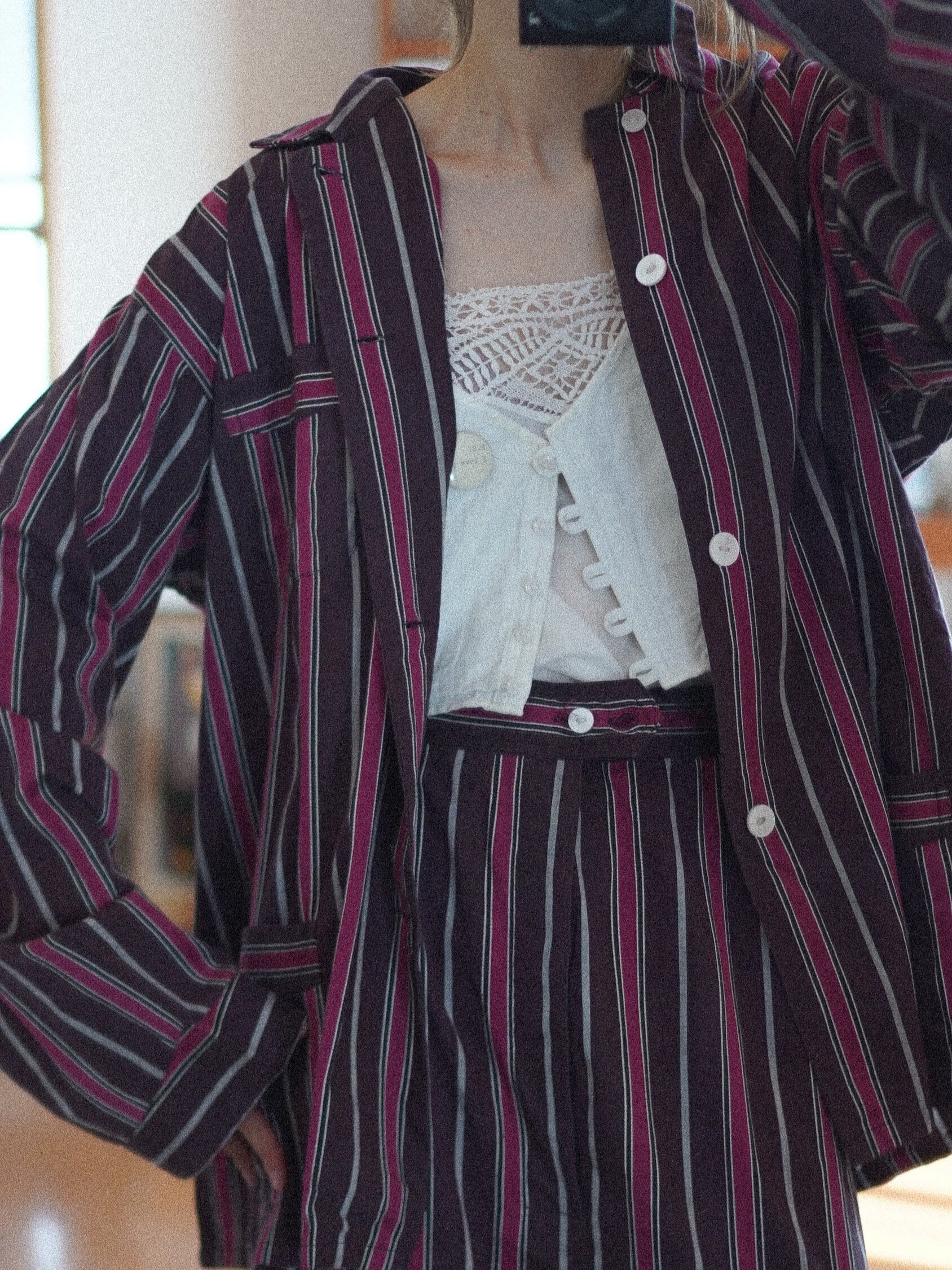 深いワインバーガンディに、ラズベリーワインの差し色、ダブグレーとチャコールブラックの細いストライプが重なる絶妙カラーがキュートな、80sごろの空気をまとったパジャマセットアップ。