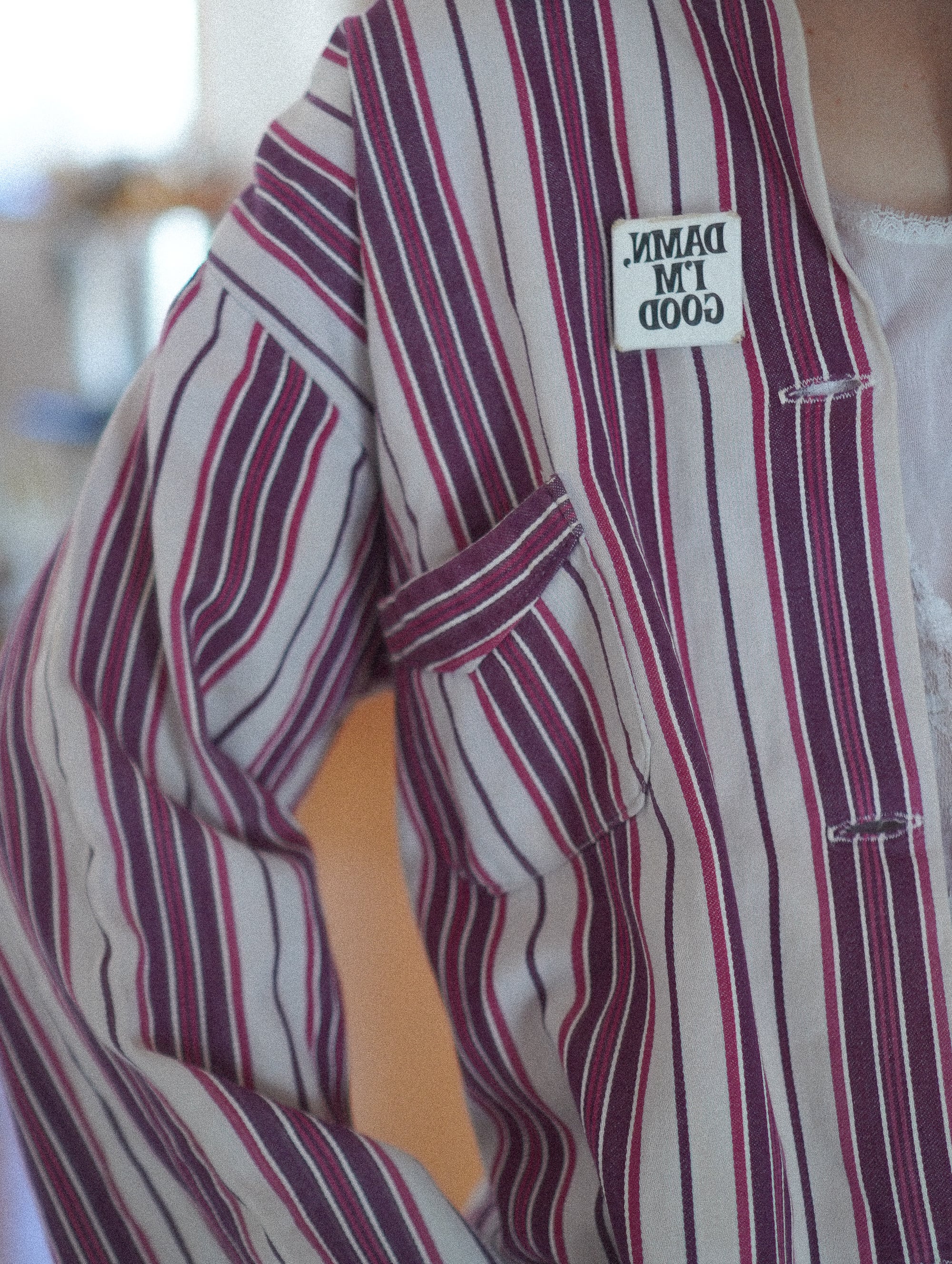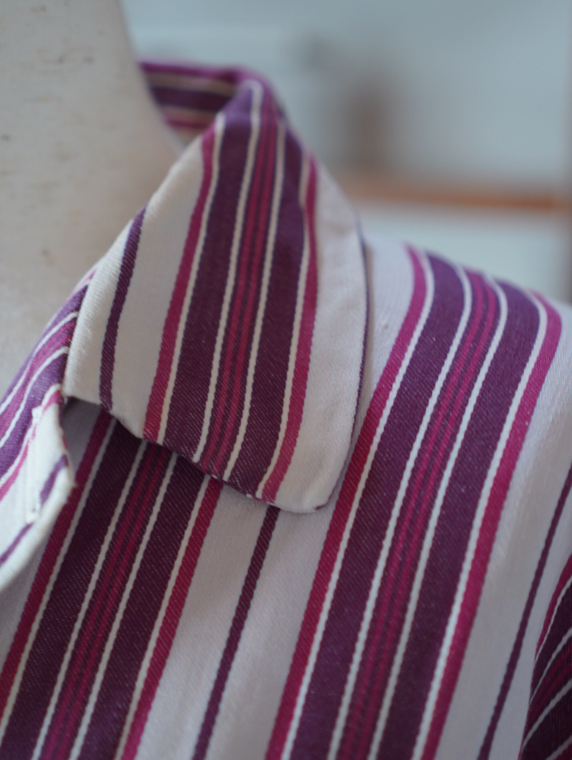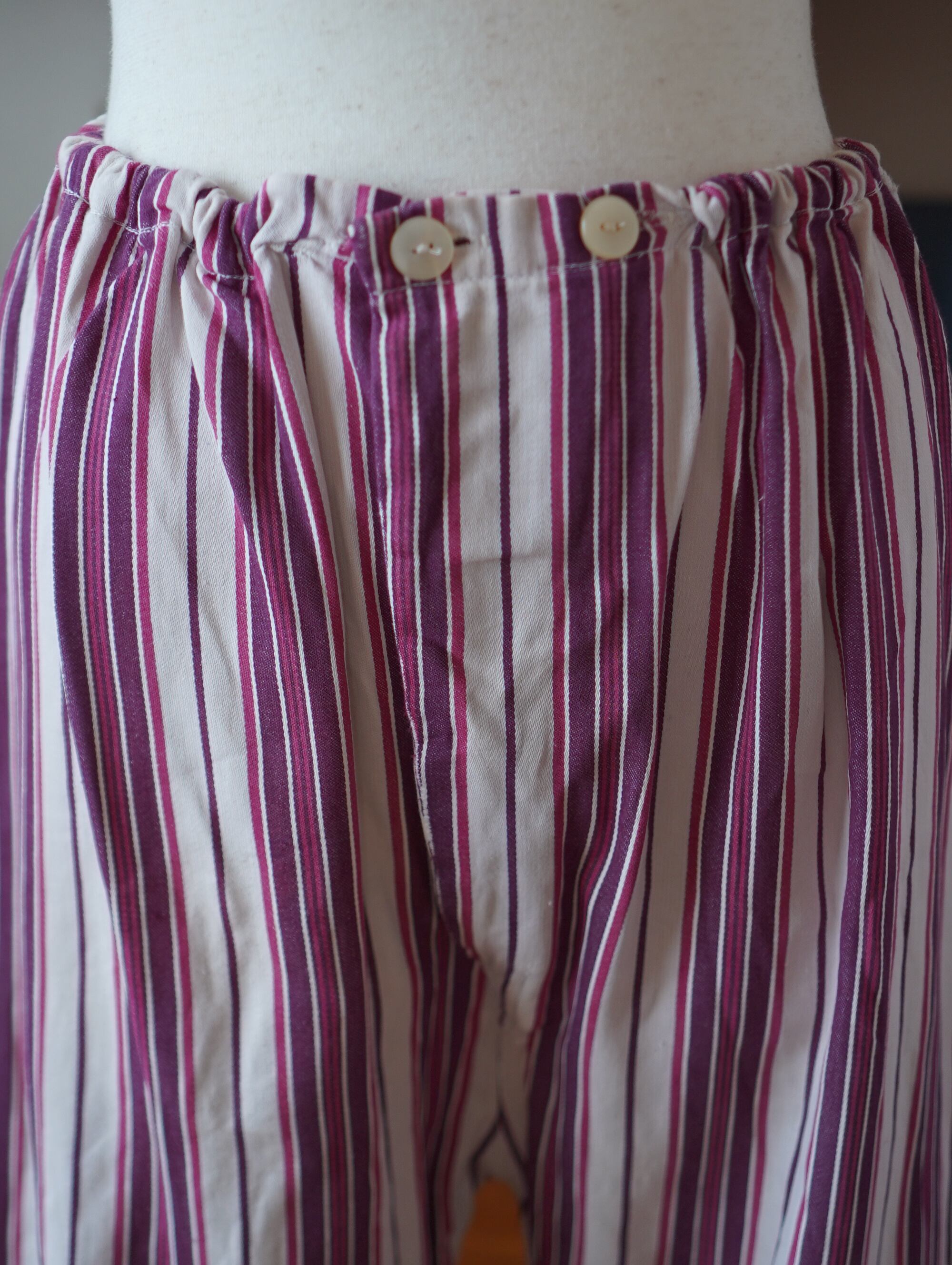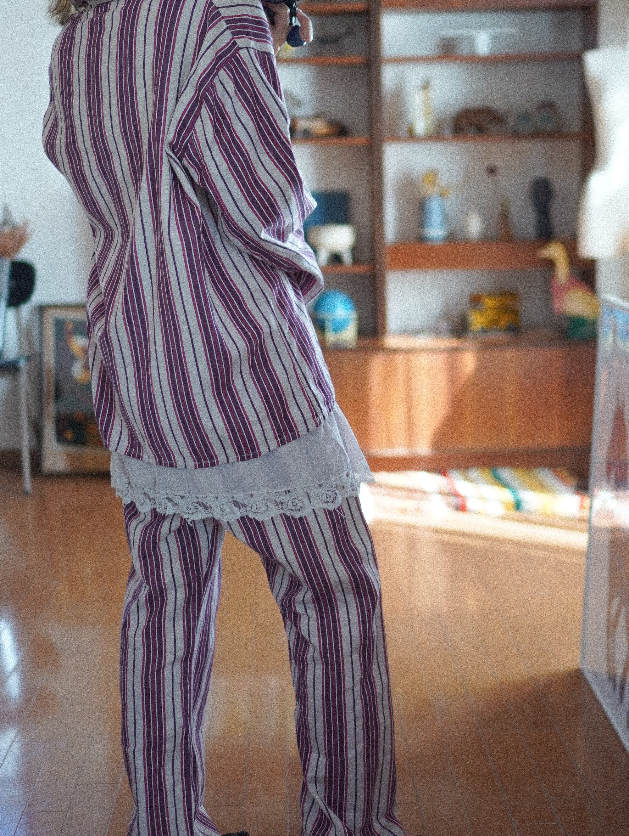 チェリーミルクをベースに、深いカシスワインとラズベリーラインが重なる、ヴィンテージならではの絶妙なストライプがキュートな、50sごろの空気をまとったパジャマセットアップ。