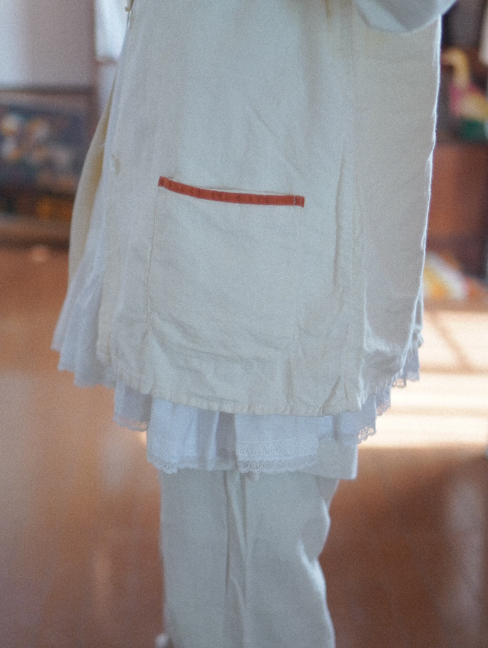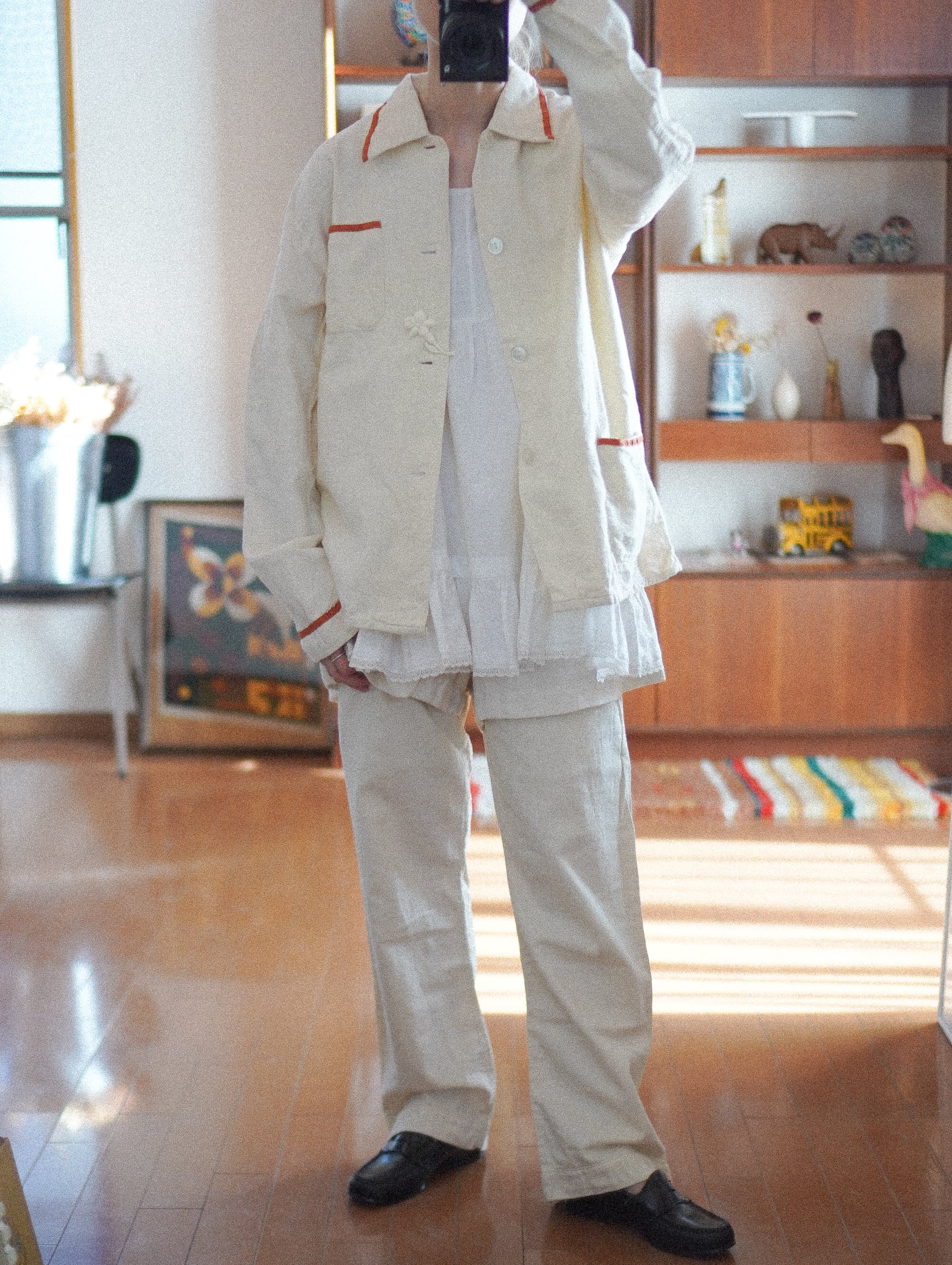 バターミルクのようなカラーベースに落ち着いたアプリコット系のオレンジパイピングが最高にキュートな、50sごろの空気をまとったパジャマセットアップ。
