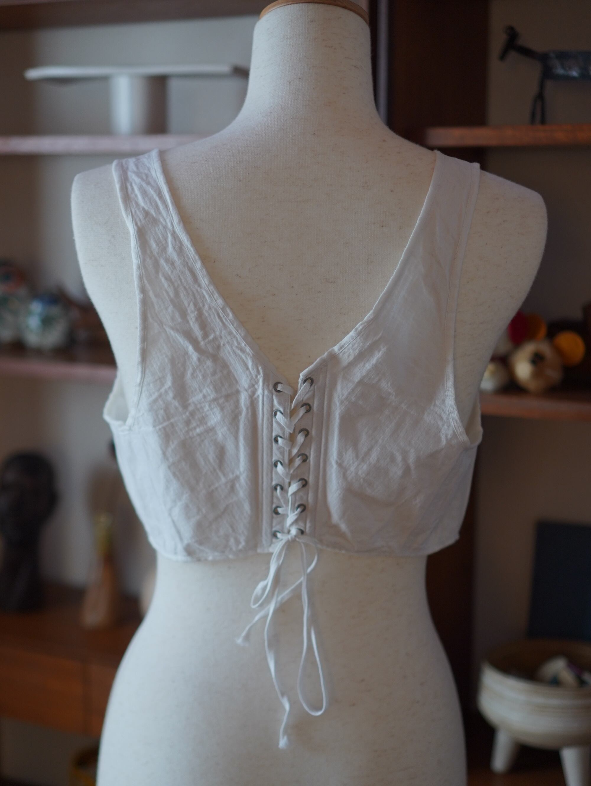 しっかりとしたコットンの風合いと、年月を重ねた表情ごと楽しんでいただけたらうれしいです。/10s–20s herringbone lace-up work corset top