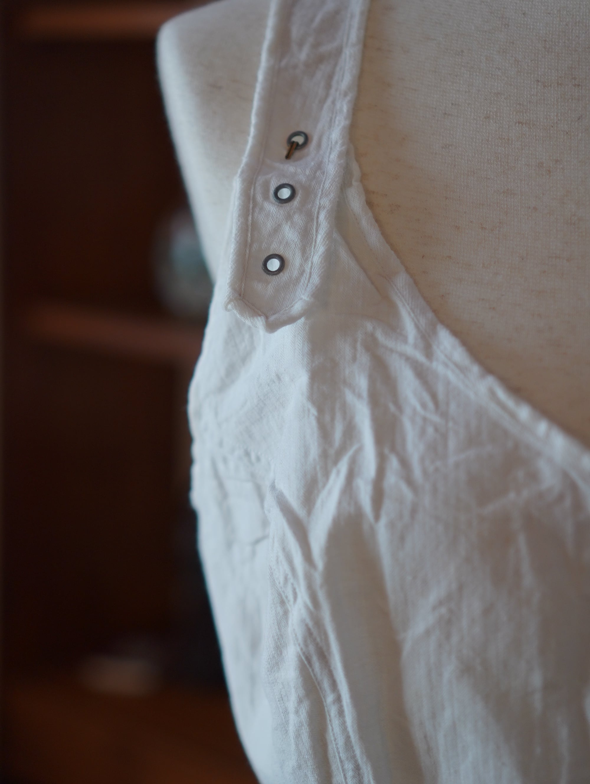 1920年代前後のものと思われる、ヘリンボーン織りコットンの、コルセットの構造を思わせるトップ。背面のレースアップ、無骨な金属ハトメ、しっかりとした生地の質感がたまらない一着です。もう出会えないんじゃないかと思うほど、出会った時にきゅんが高まりました。
