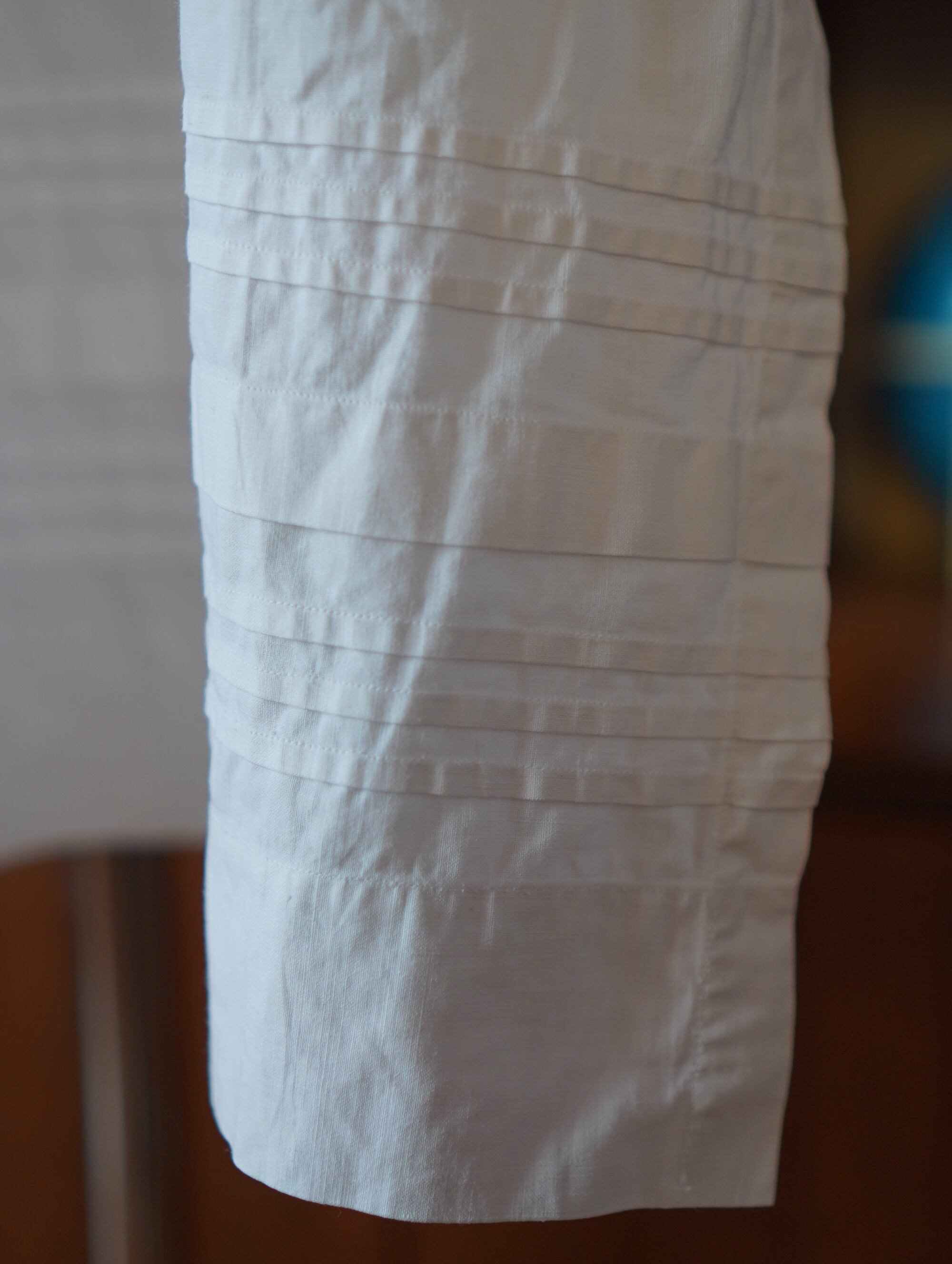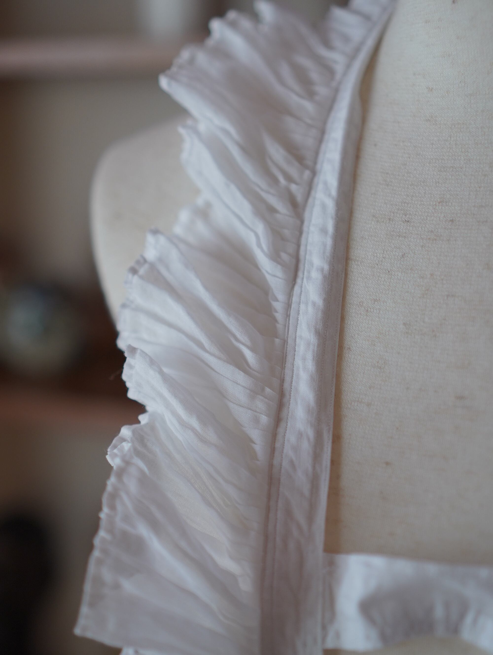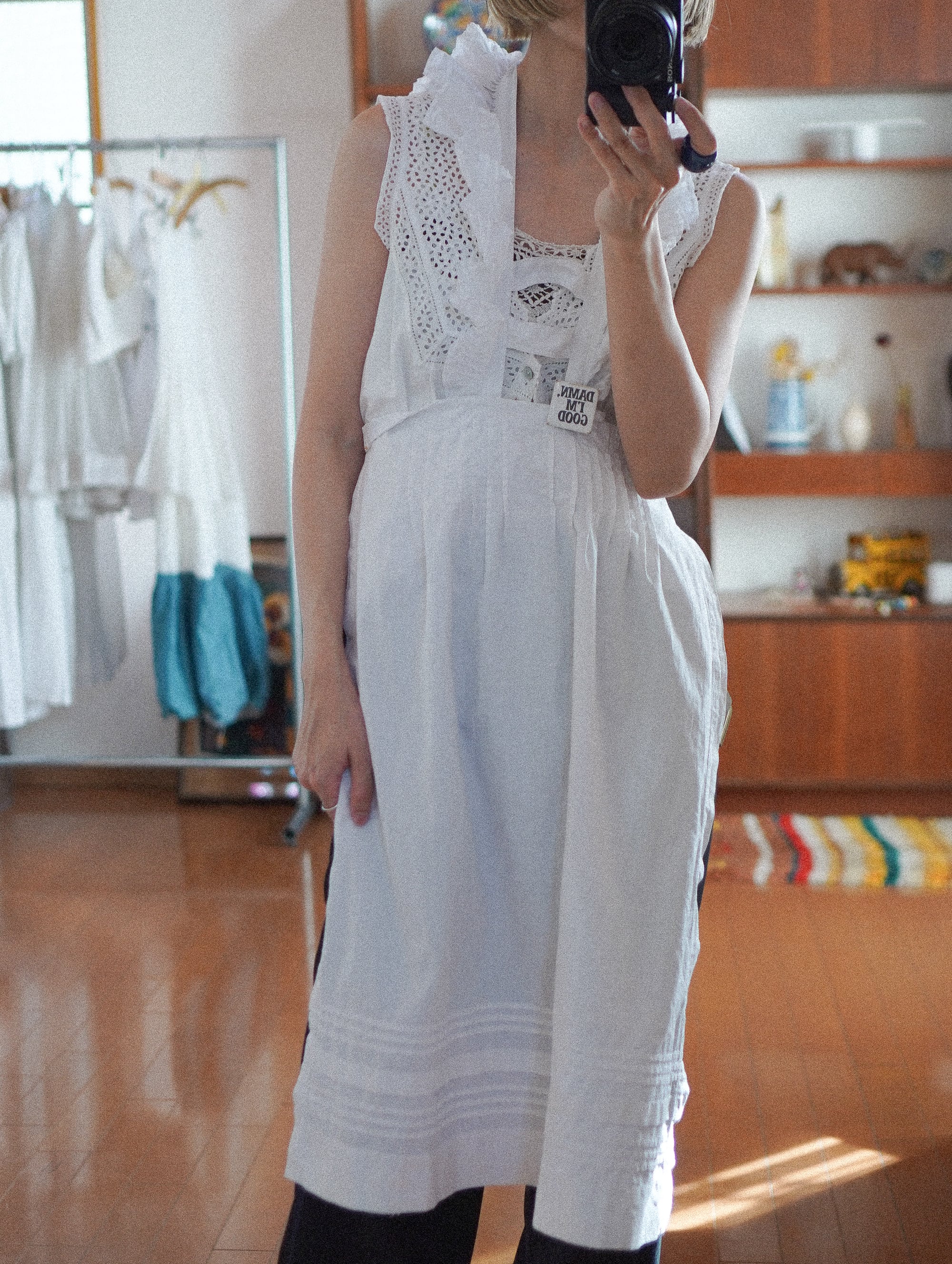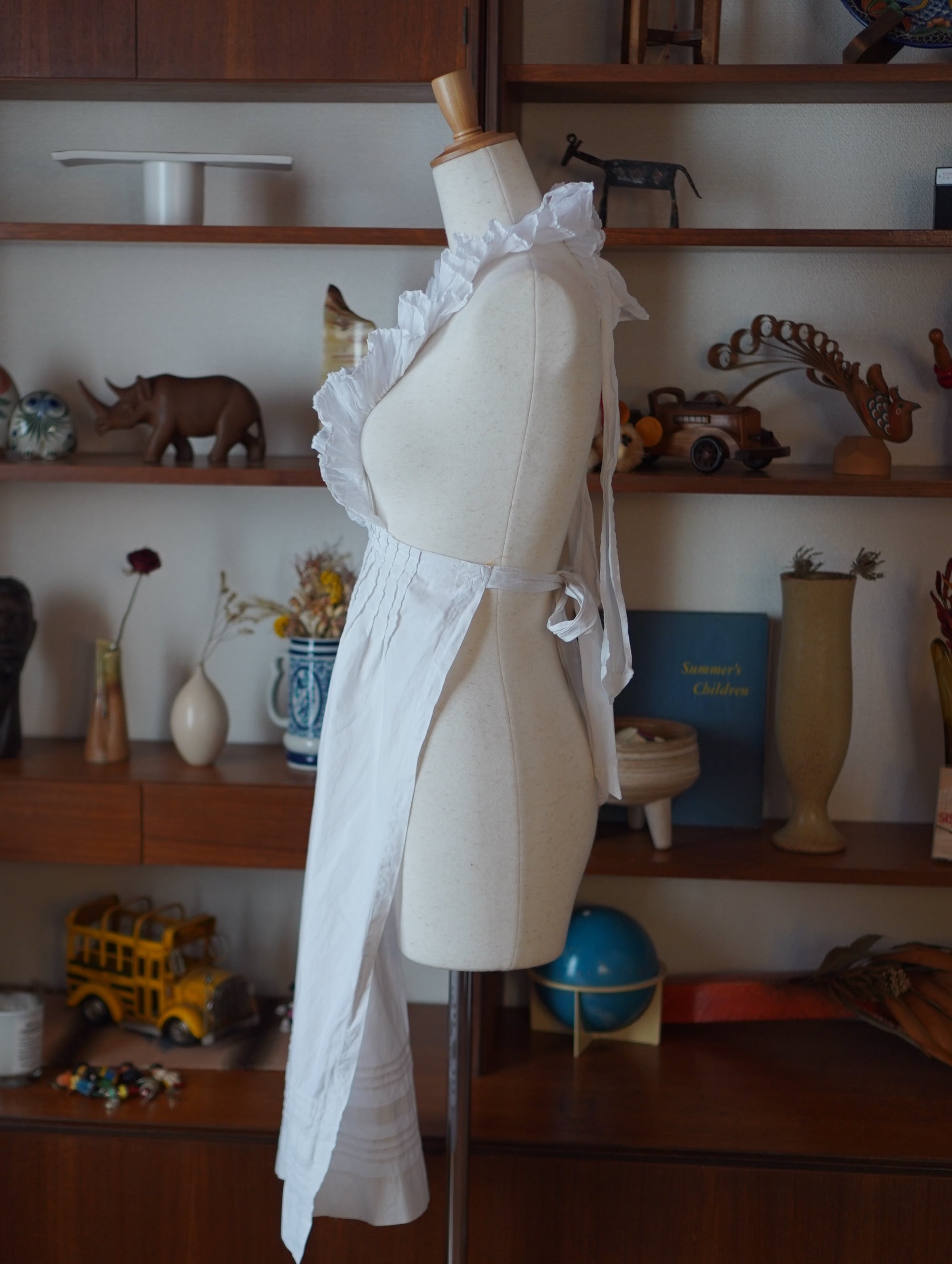 胸元にあしらわれた最高にキュートなフリル、丁寧に並ぶピンタック、裾に走る横ステッチのライン。古い時代ならではのていねいな手仕事がぎゅっと詰まっているスペシャルな一着です。