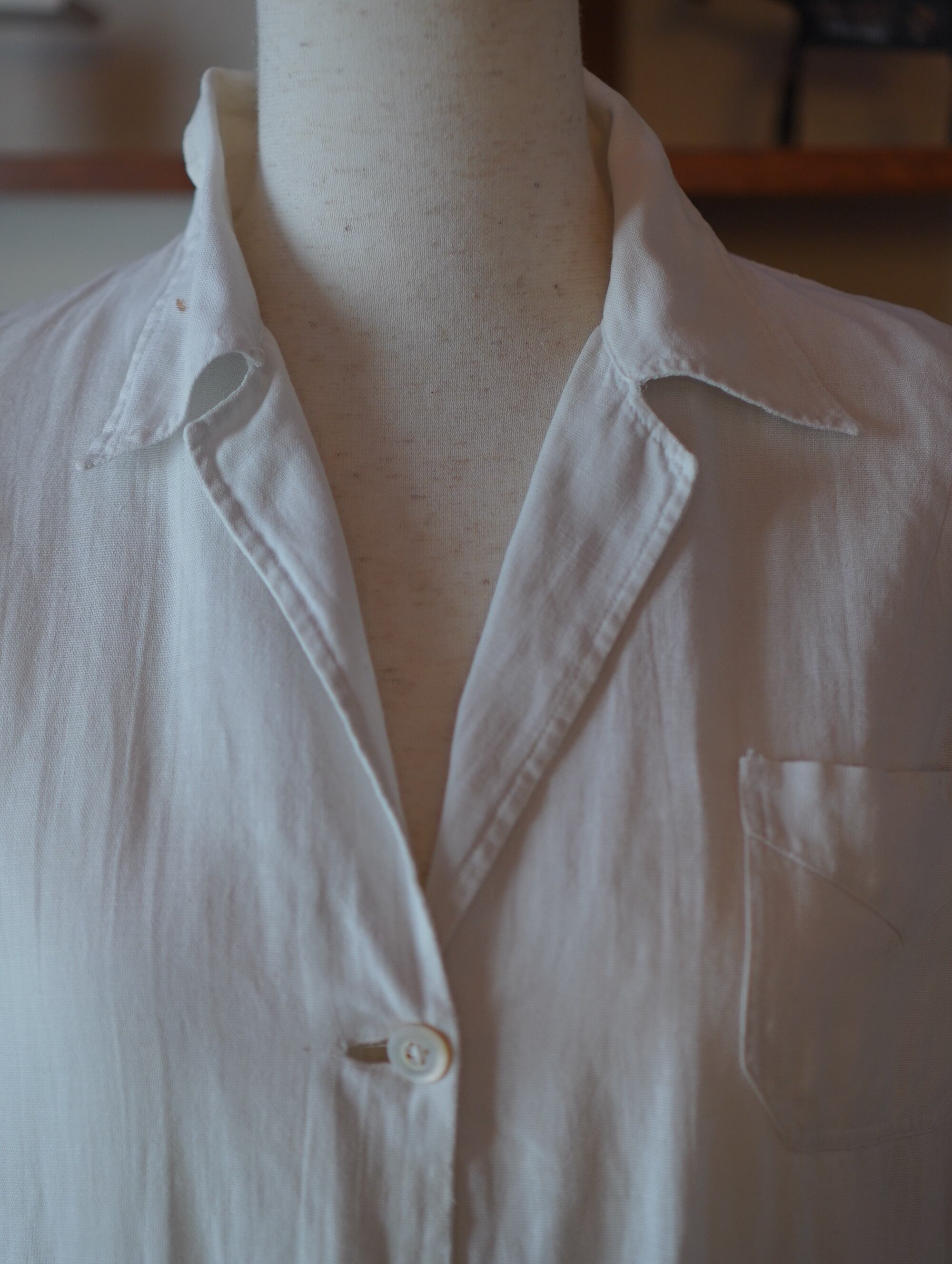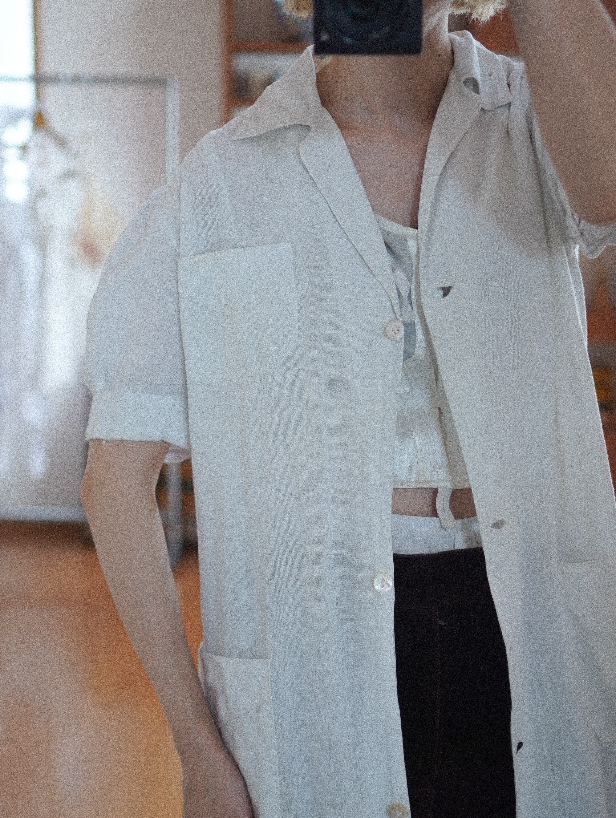 着た瞬間にわかるスペシャル感と、アンティークならではの儚くやわらかな佇まいが魅力の一着。胸もとのちいさなポケット、ぱふっとしたパフスリーブ、フロントに並ぶシェルボタンがチャームポイント。