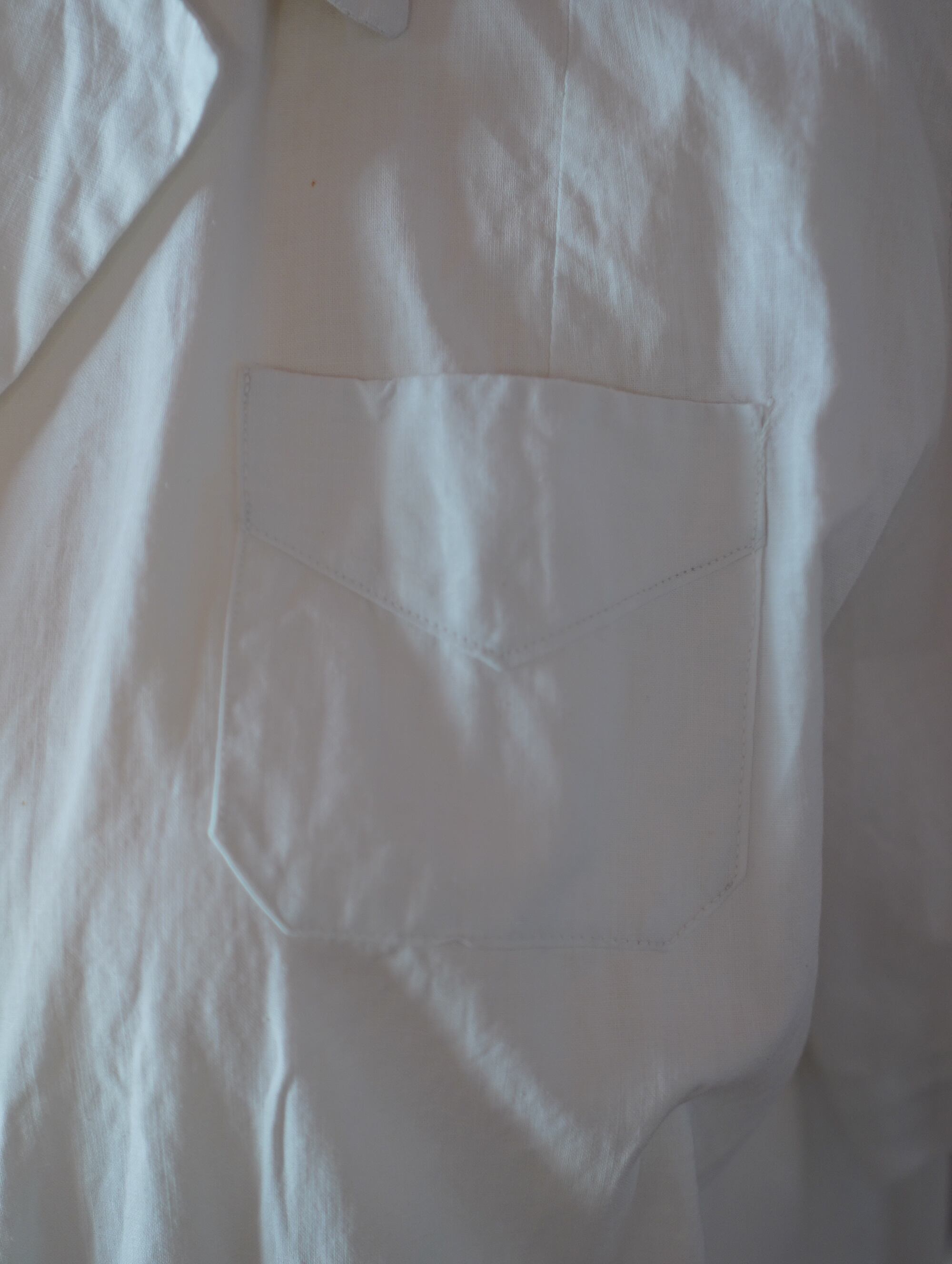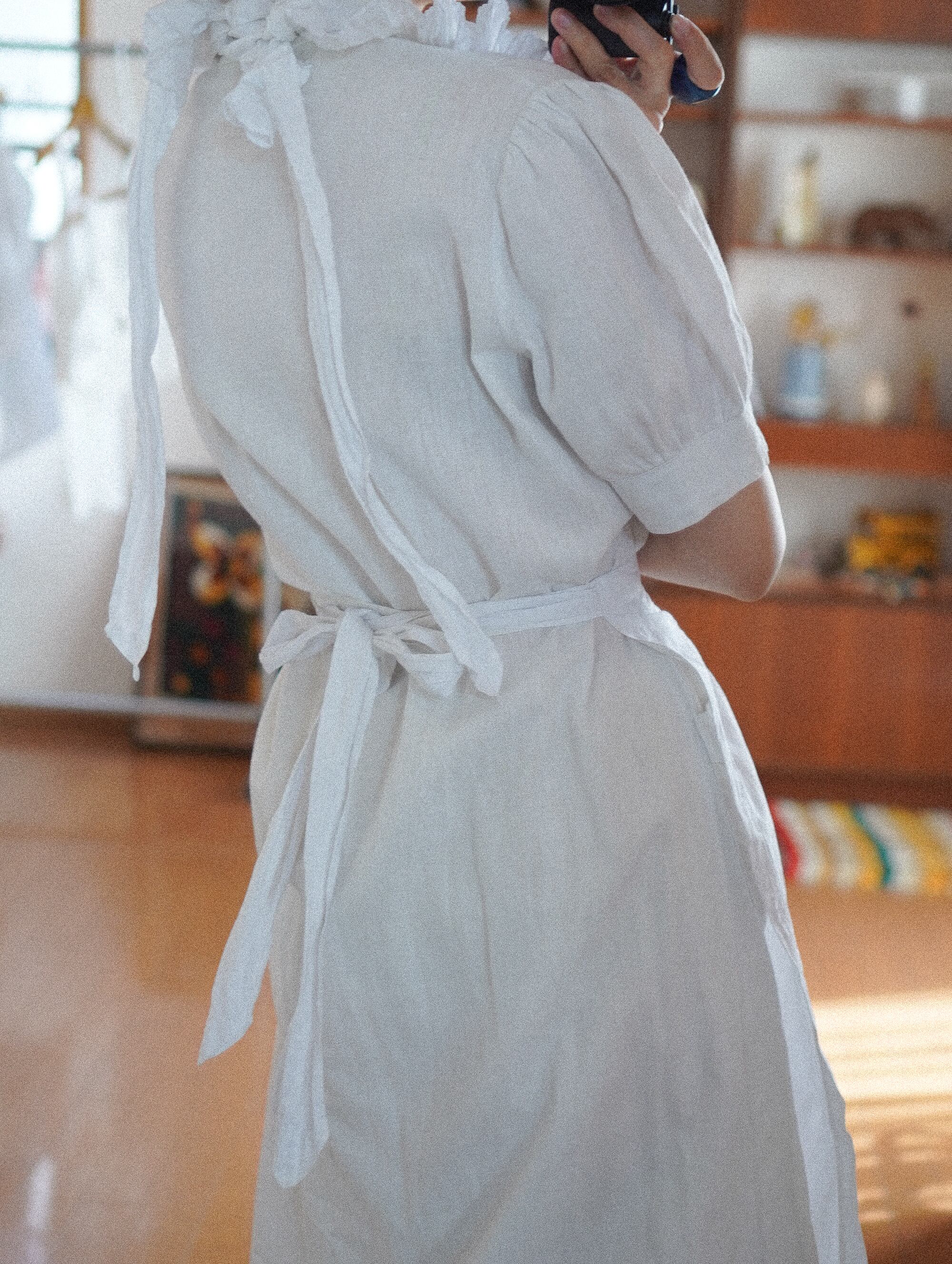 胸もとのちいさなポケット、ぱふっとしたパフスリーブがチャームポイント。どこを見ても“昔の仕事着”のキュートさがぎゅっと詰まっています。ボタンを閉めてワンピースとしても、あけて軽い羽織としても楽しめるデザイン。古いコットンの落ち感が身体にふわっと馴染んで、春夏の空気にもとてもよく合います。