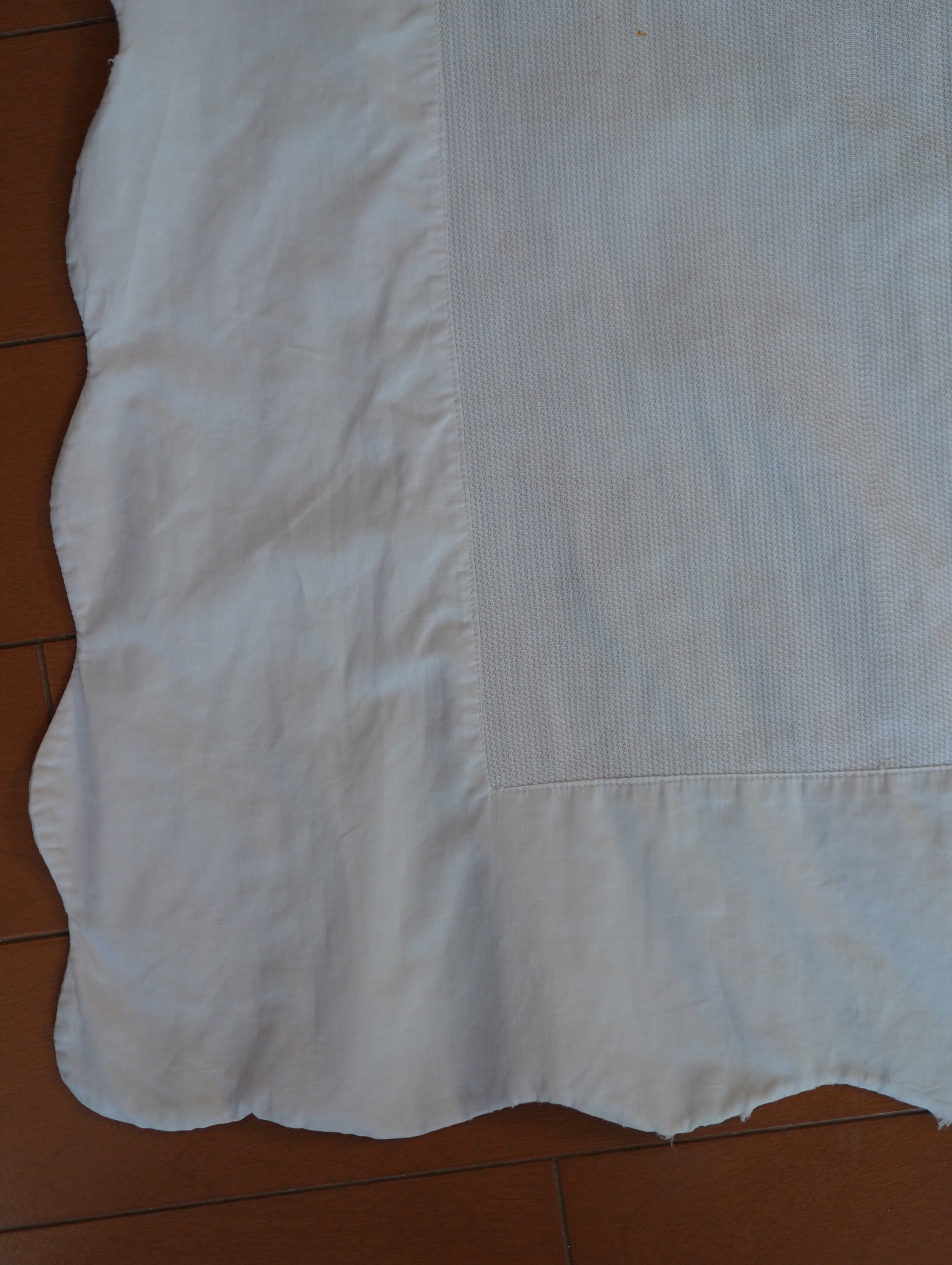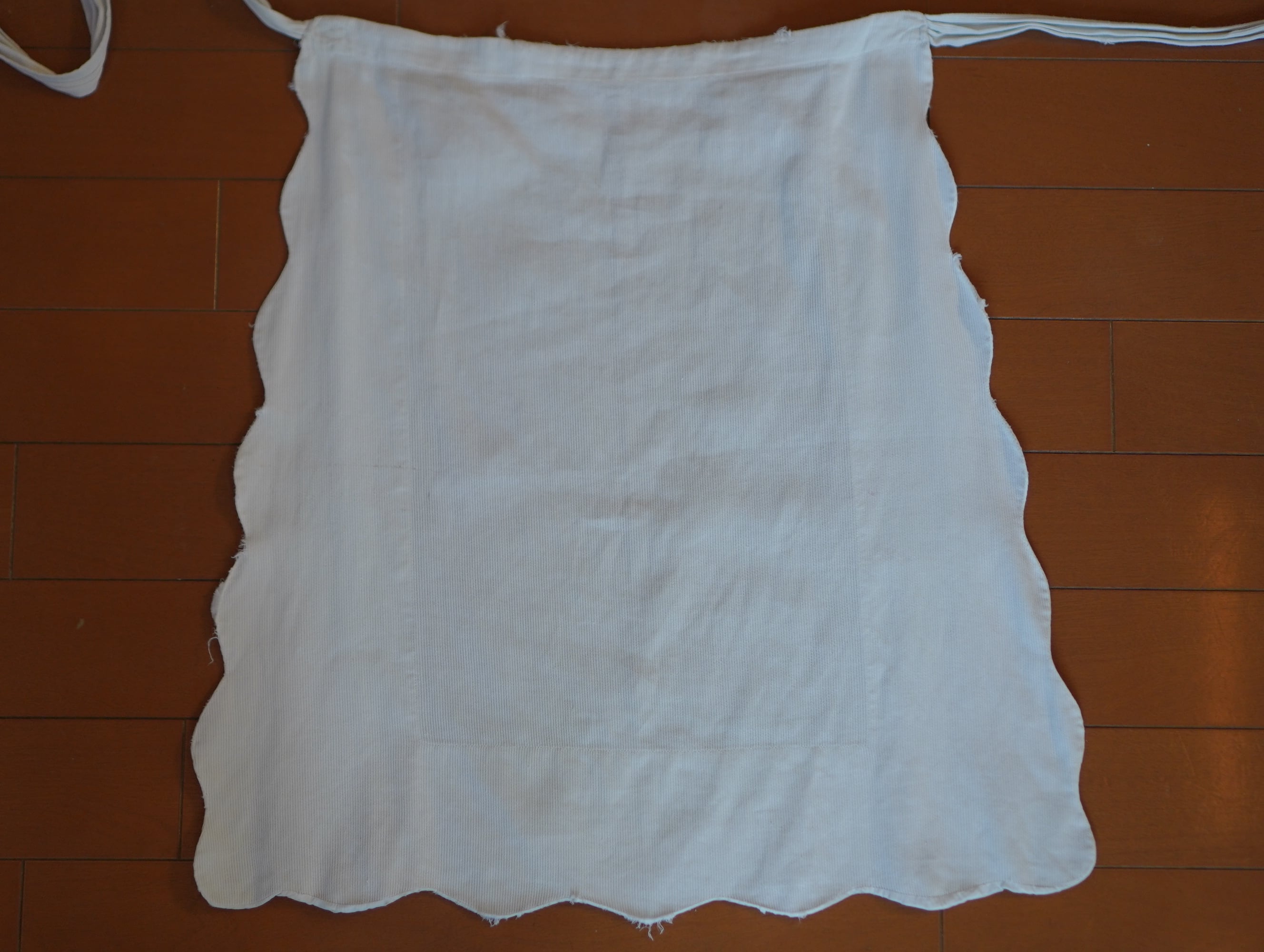 アンティークらしく、小さなシミや糸のほつれなどがところどころに見られますが、それもふくめて“昔の台所で大切に使われてきたんだろうな” と感じられる一枚です。/antique scallop cotton apron