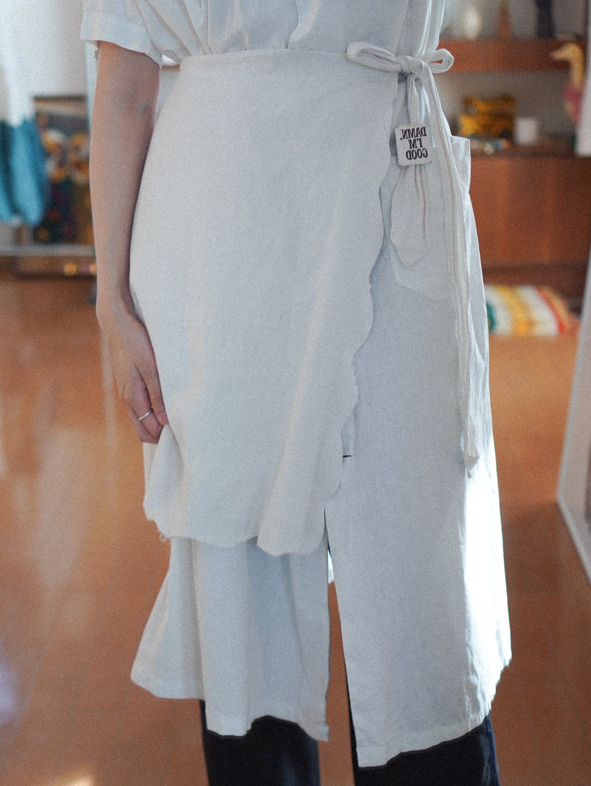 なみなみのスカラップカットがチャームポイントな、10's∼20’s頃の雰囲気が漂うコットンエプロン。シンプルなのに特別感があって、出会えること自体がめずらしい一枚です。