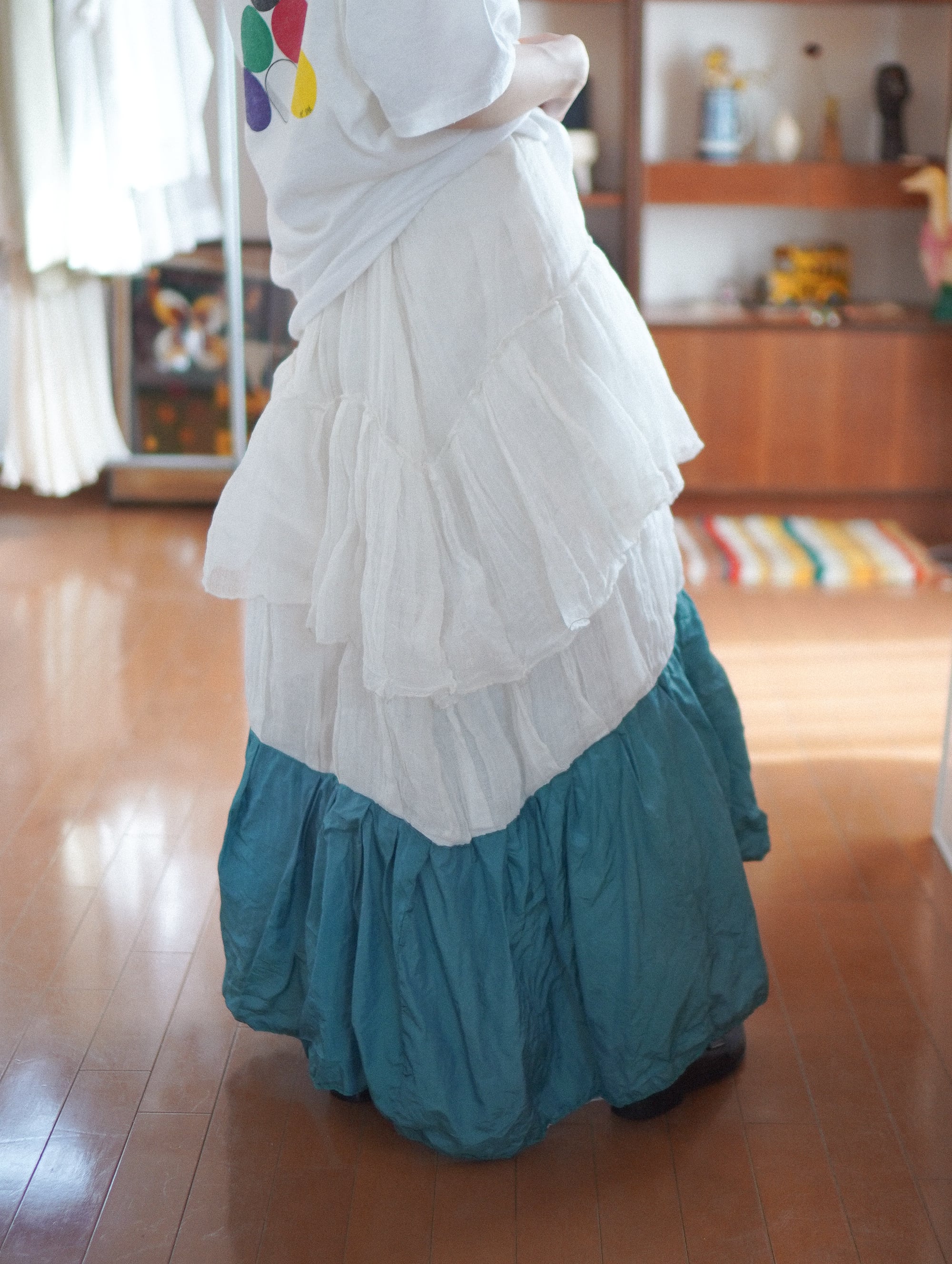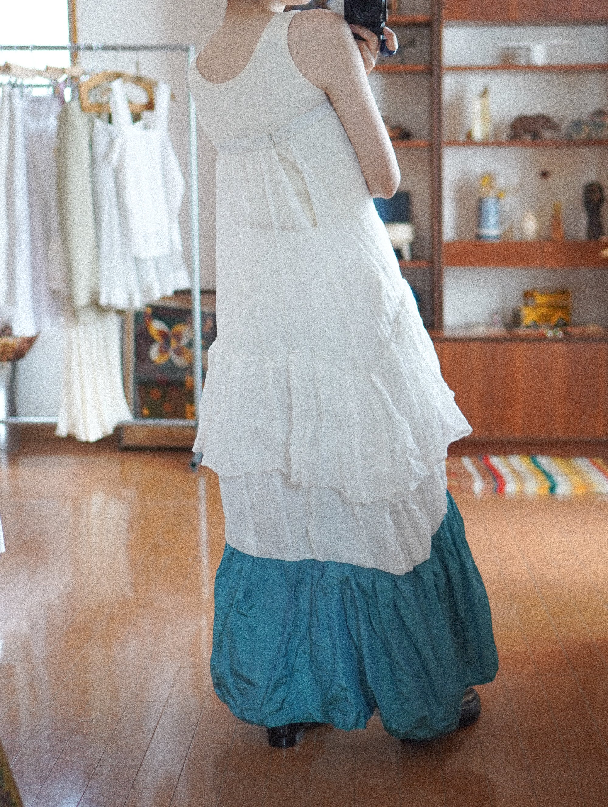 ティアードシルエットに、裾にはブルーグリーンの切り替え。