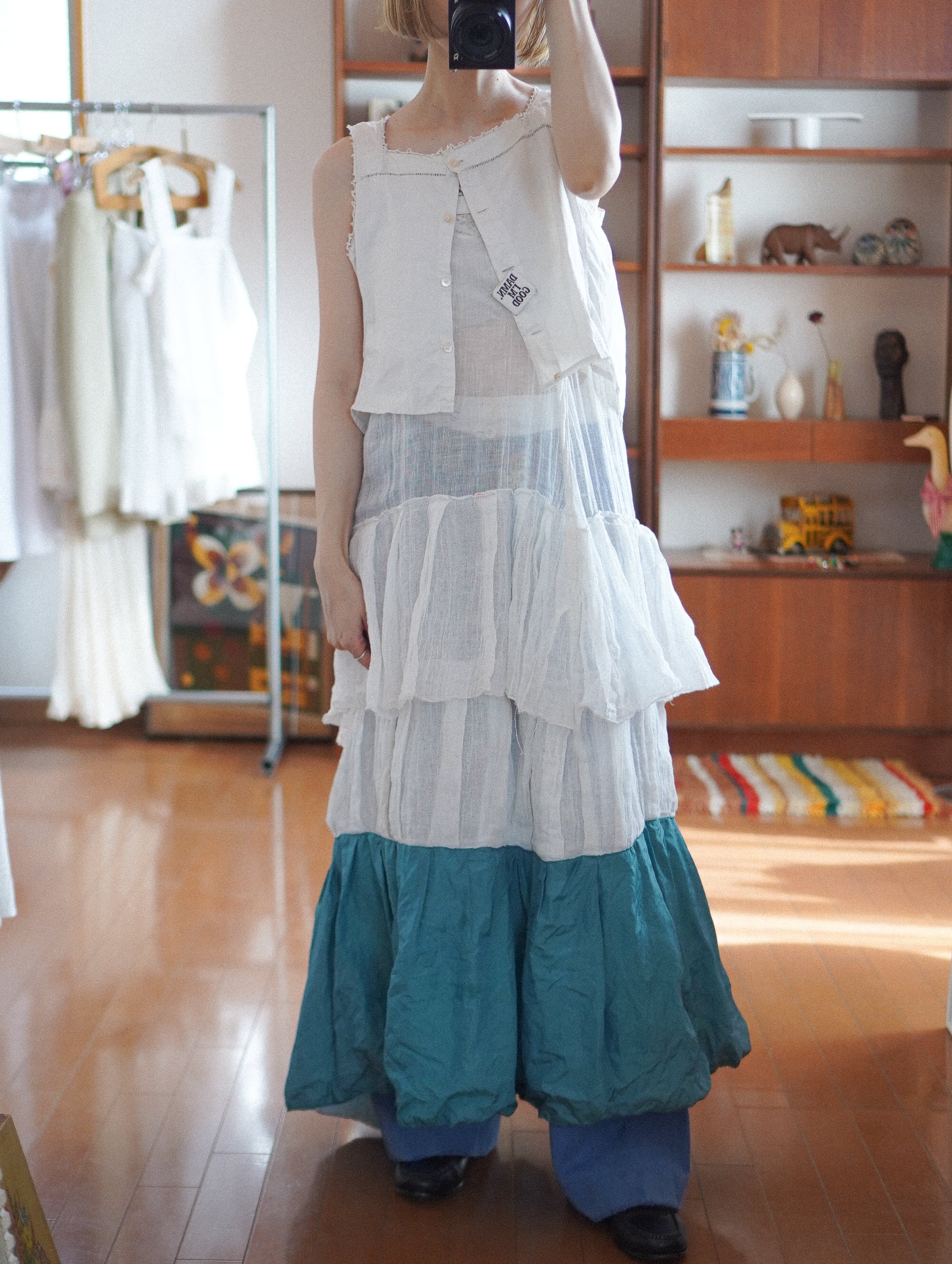 今回の買い付けの中でも、とても特別な一着です。/special antique cotton tiered dress skirt – blue hem