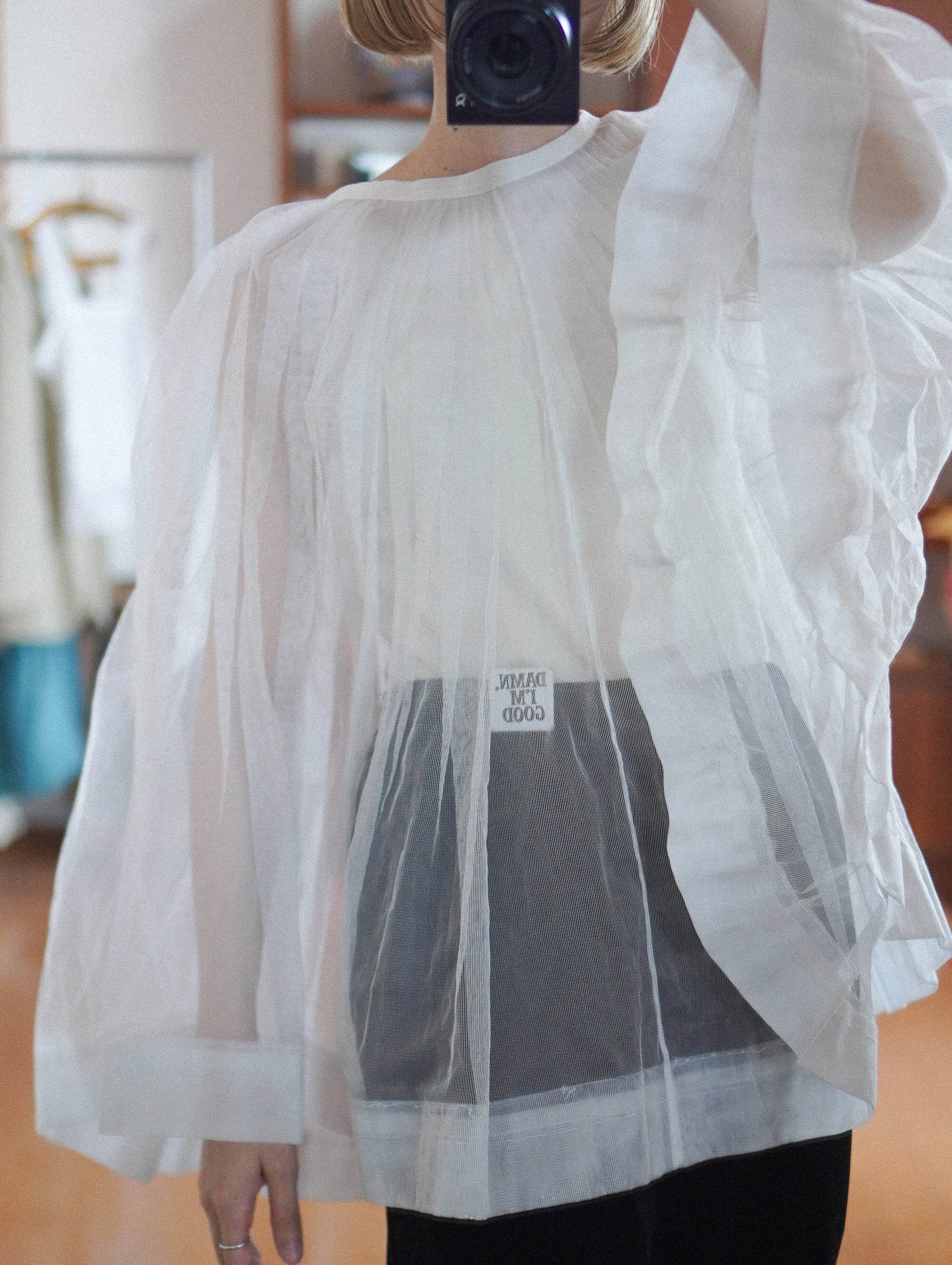 薄く繊細なガーゼのようなコットン素材で、手が透けるほどの軽やかさがあります。縦に入ったピンタックが柔らかなシルエットを作り、動くたびに美しくキュートです。