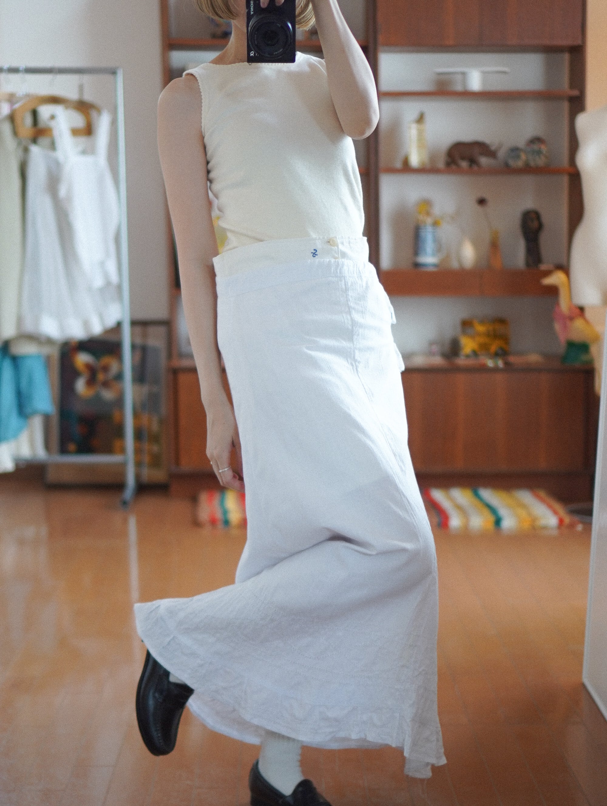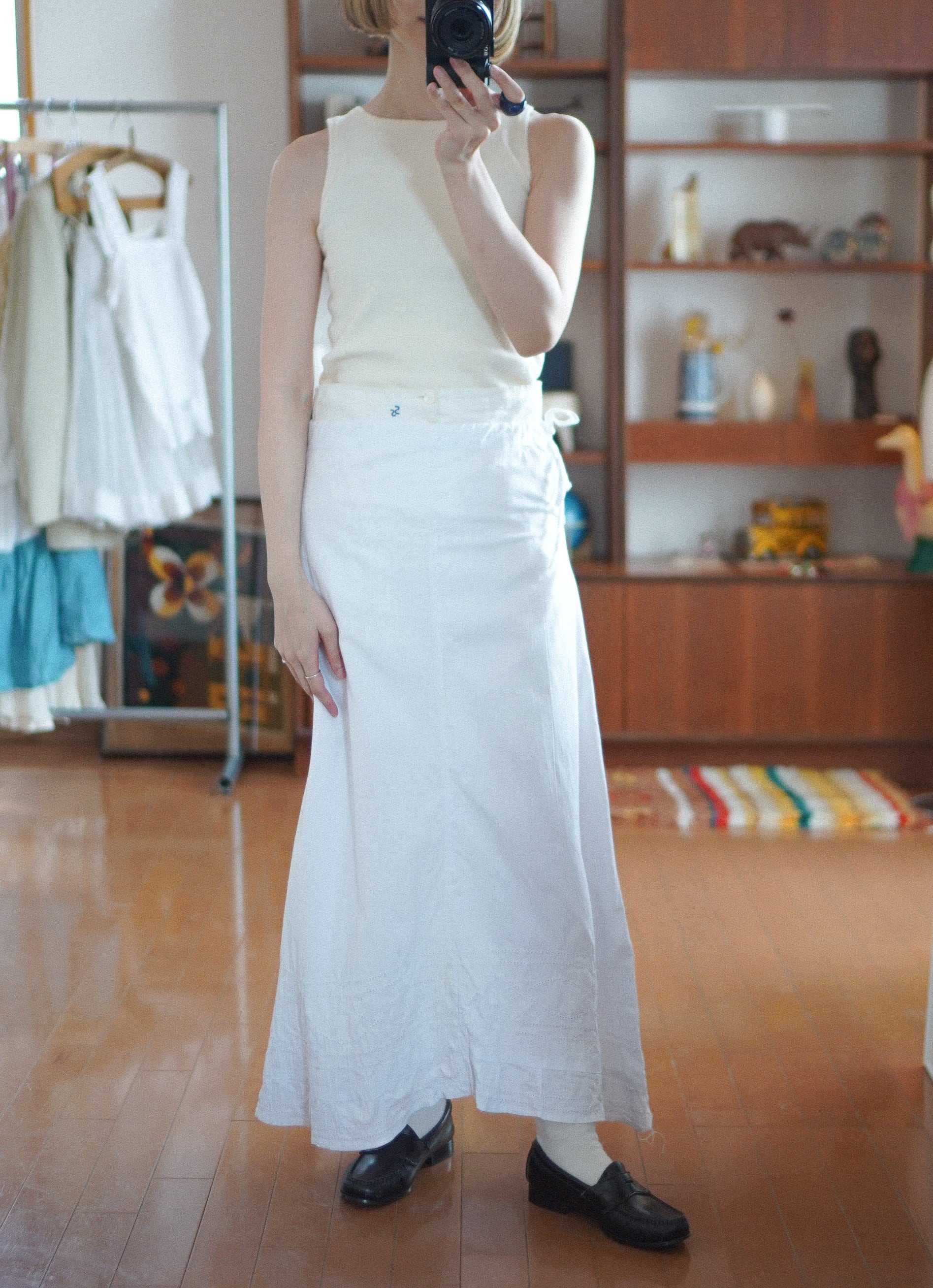 カジュアルにもきれいめにも、はまってくれる万能な一着です。/antique cotton embroidered skirt