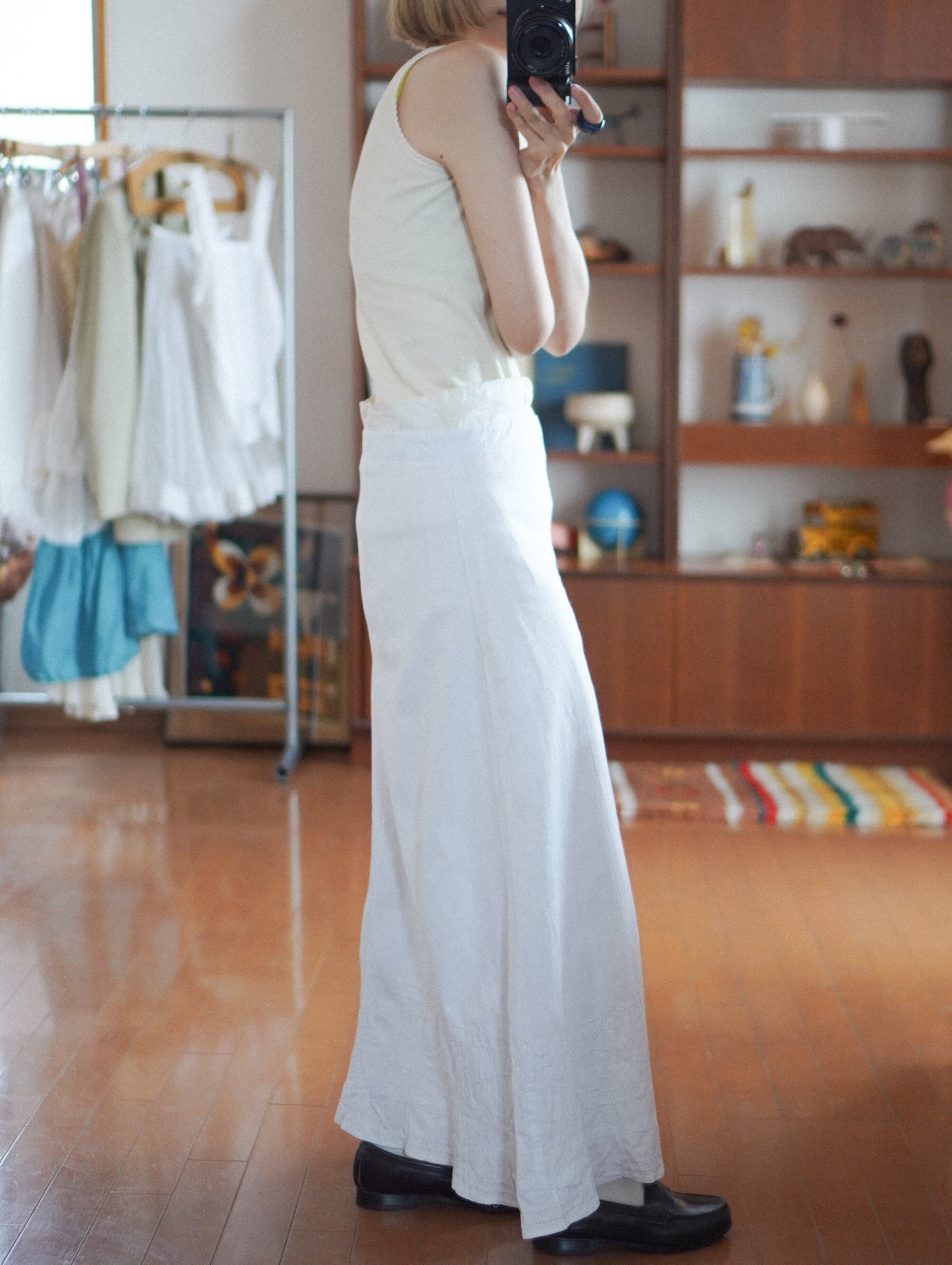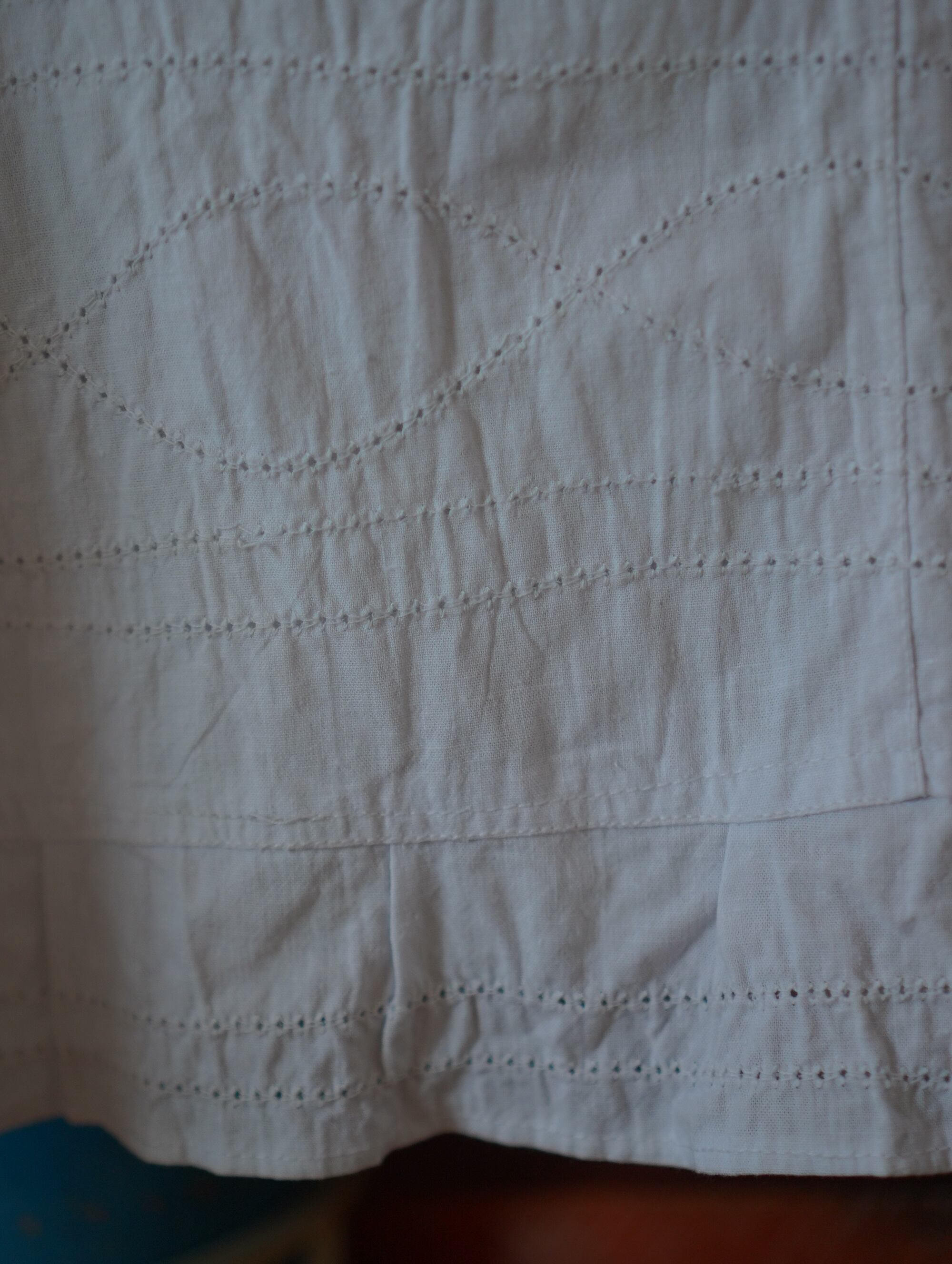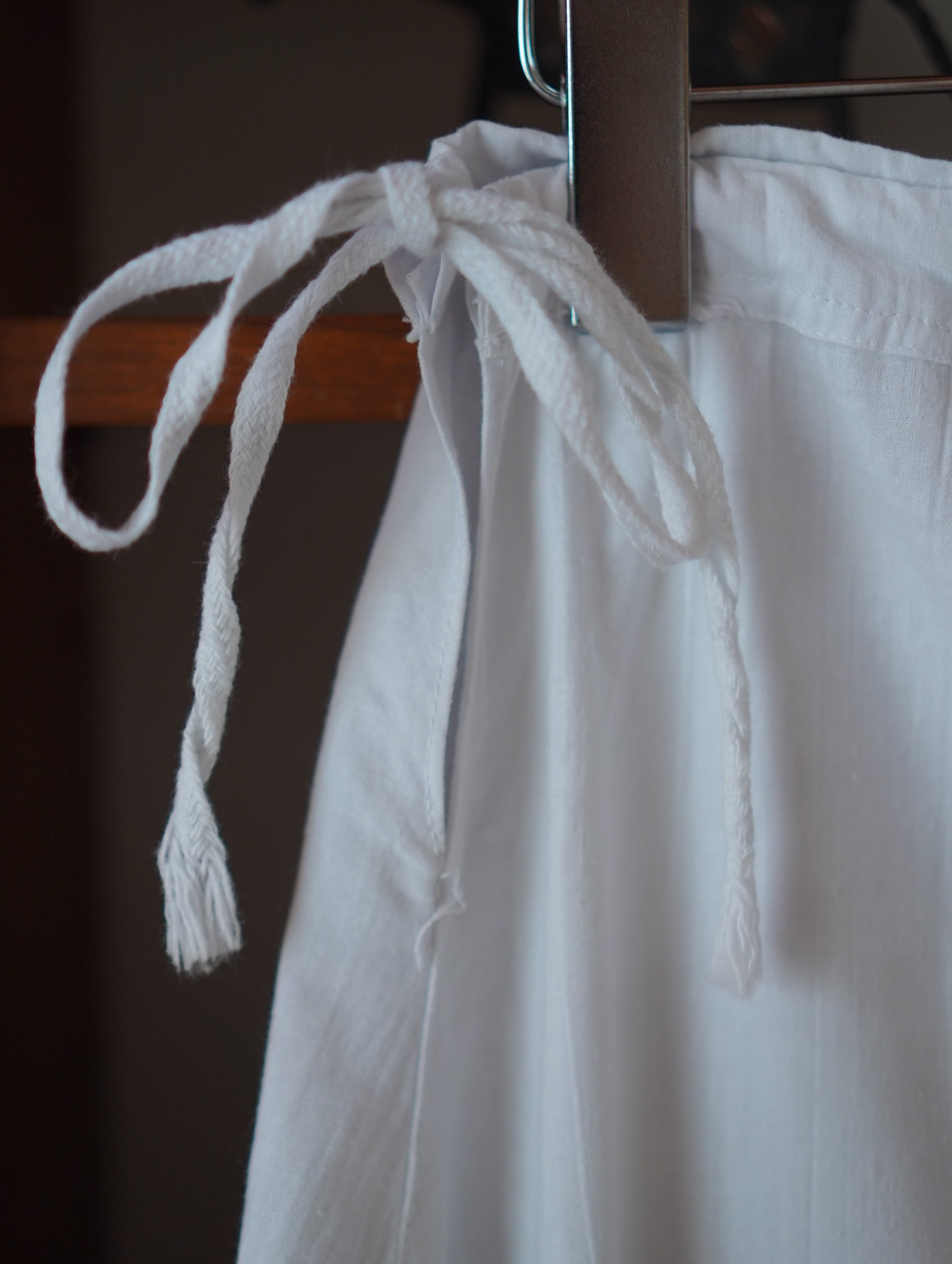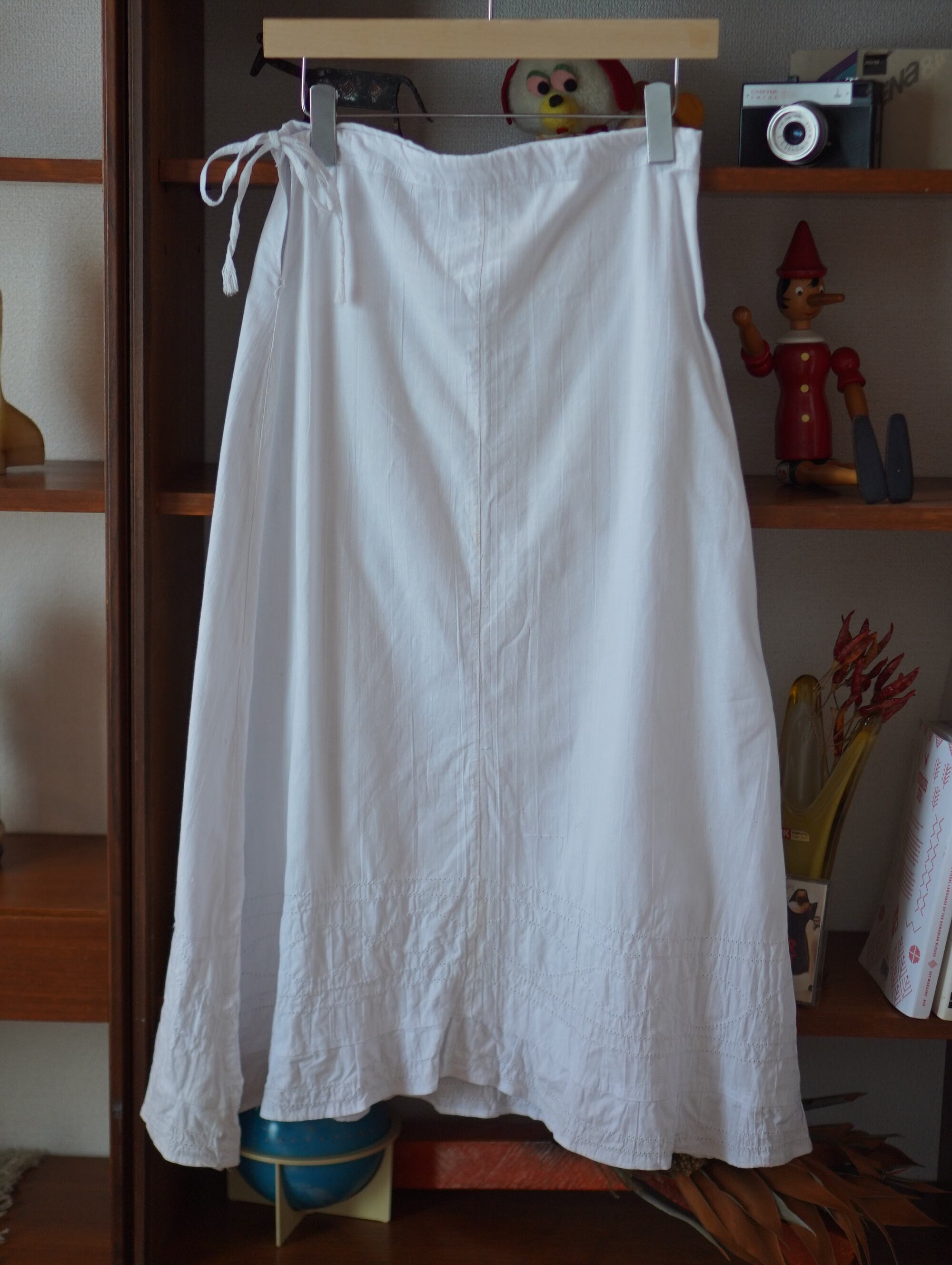 裾まわりの、すべて手仕事で施されたアイレット刺繍(カットワーク)が最大のチャームポイント。サイドは当時のままの紐仕様(ラップタイプ)。体に沿わせて結ぶことで、ウエスト位置やシルエットを自在に変えられます。アンティークならではの糸の表情、少しざらっとしたコットンの風合い、光に透ける刺繍の影がとてもキュートです。