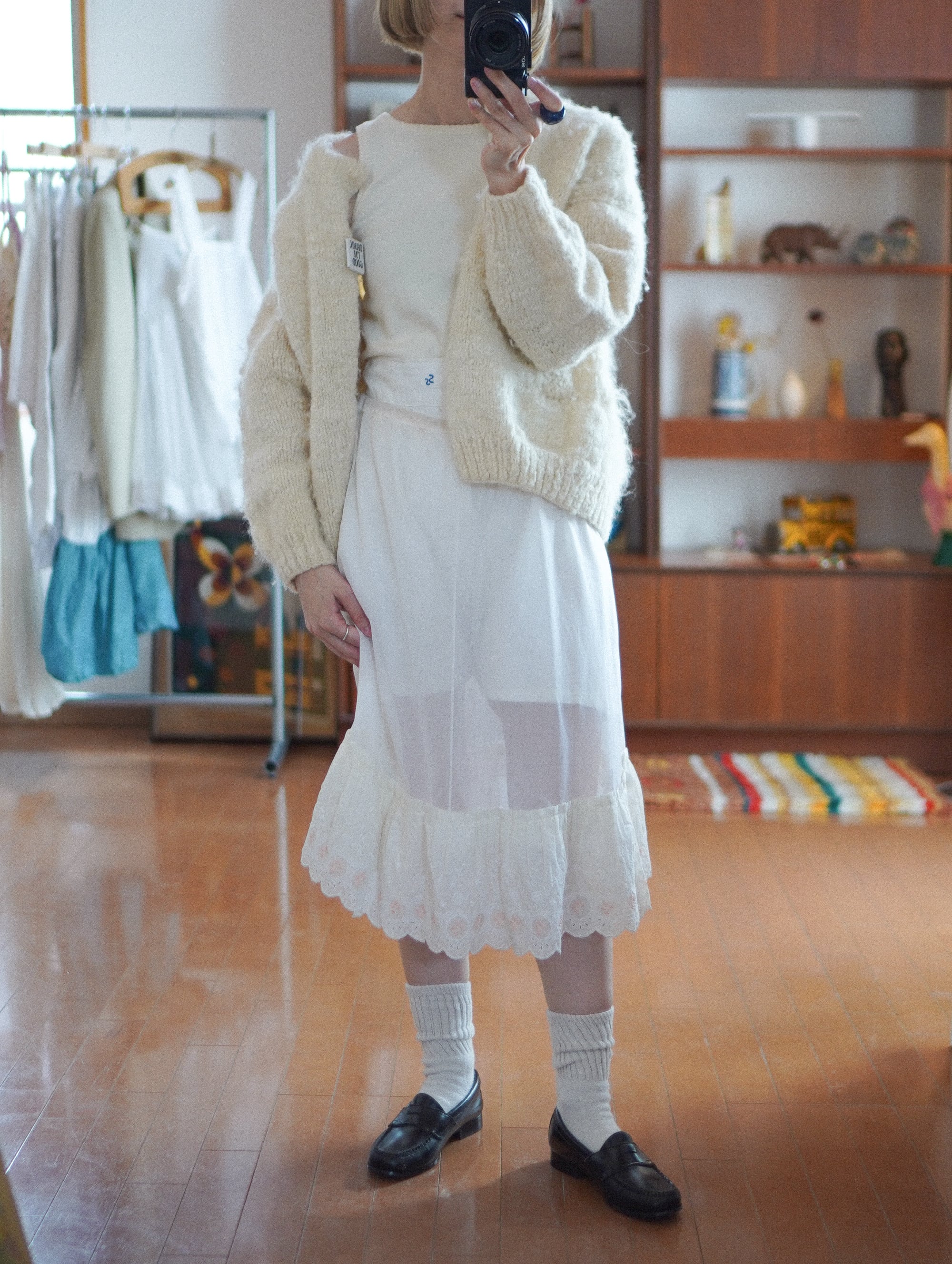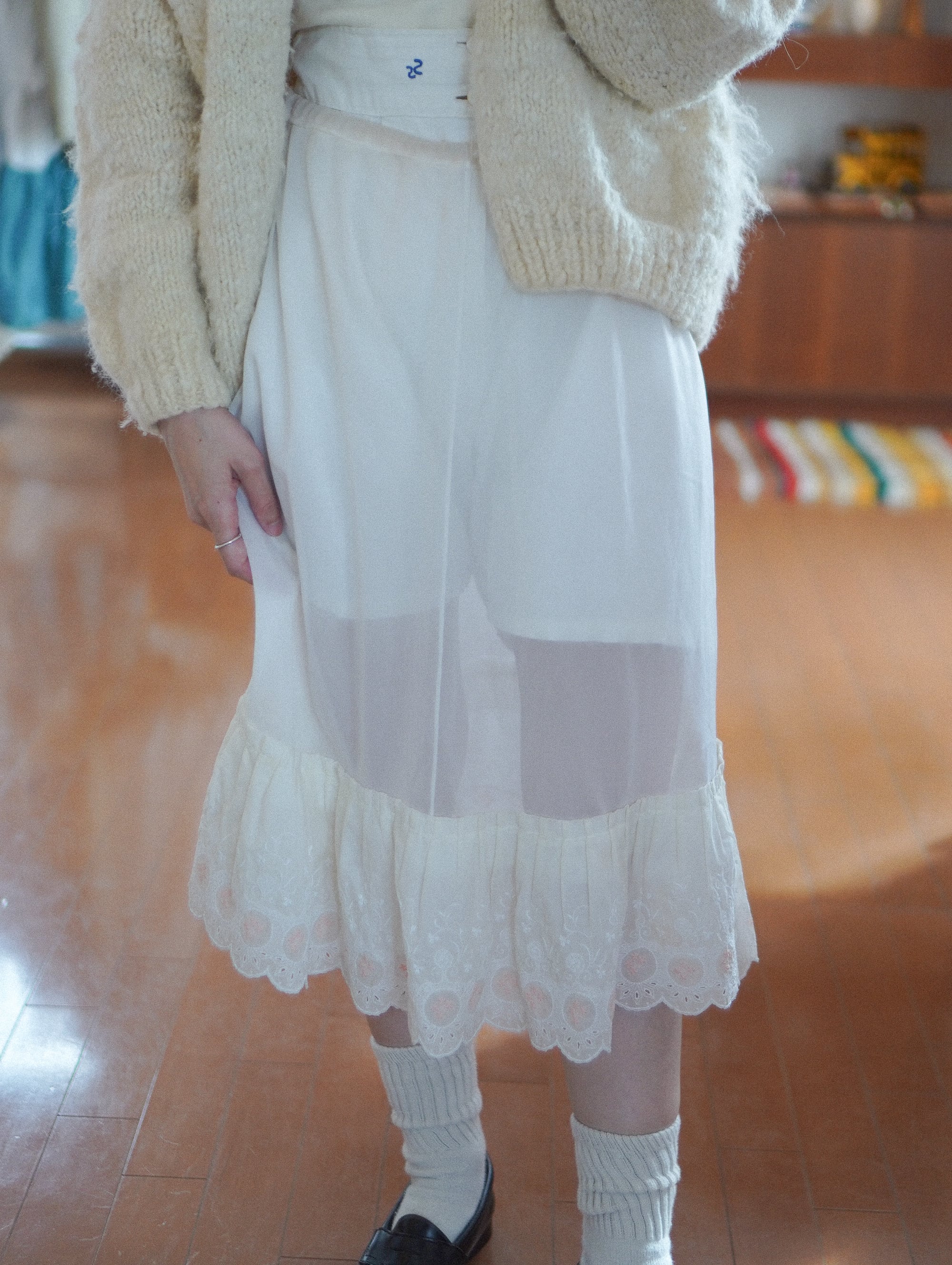 ウエストはゴムでゆったりと着用いただけます。透け感を活かしてスカートとして1枚で着てもキュート。レイヤードが楽しくなる一着です。/vintage embroidered petticoat sheer skirt