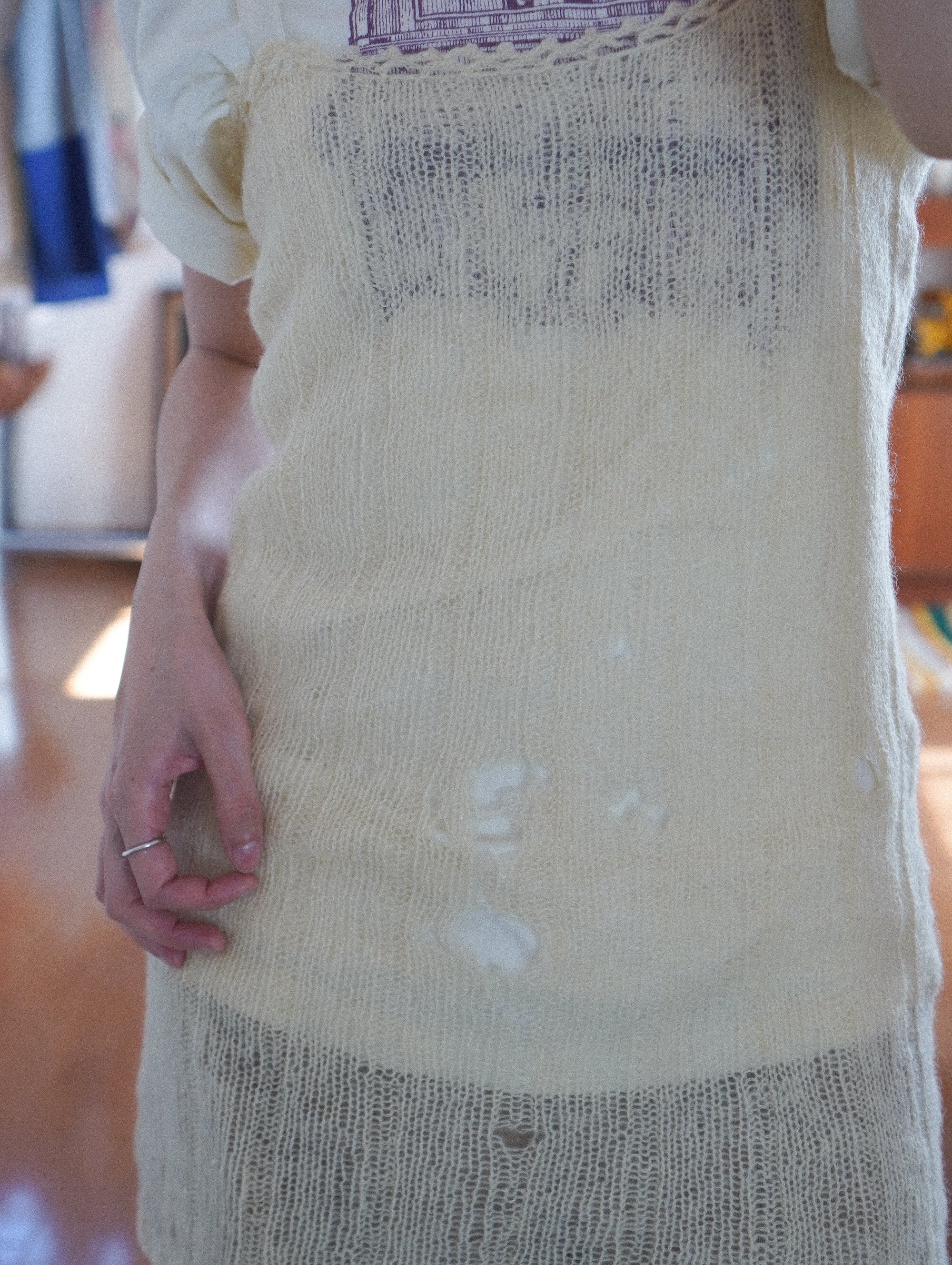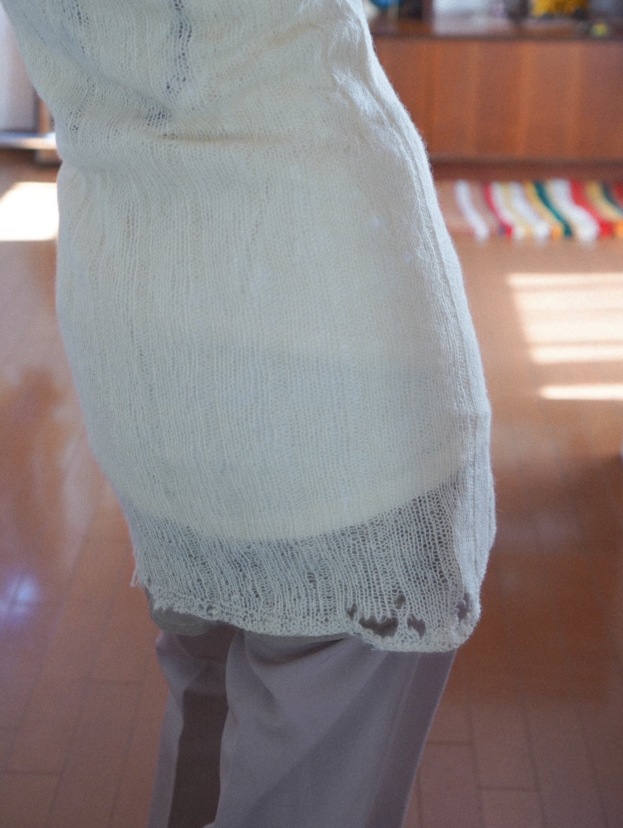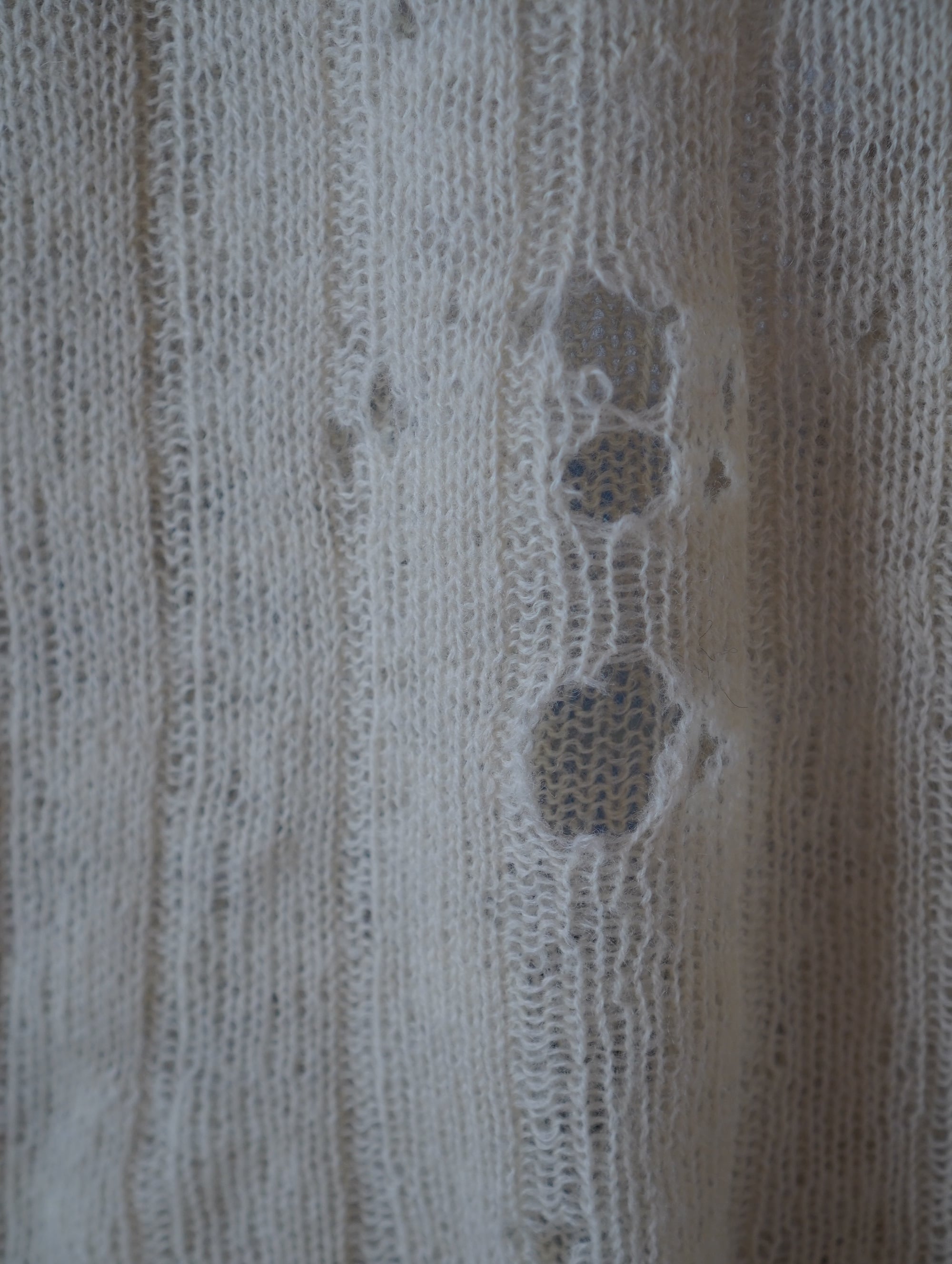 やわらかなクリームカラーに、あえて残されたダメージが印象的なハンドニットキャミソール。