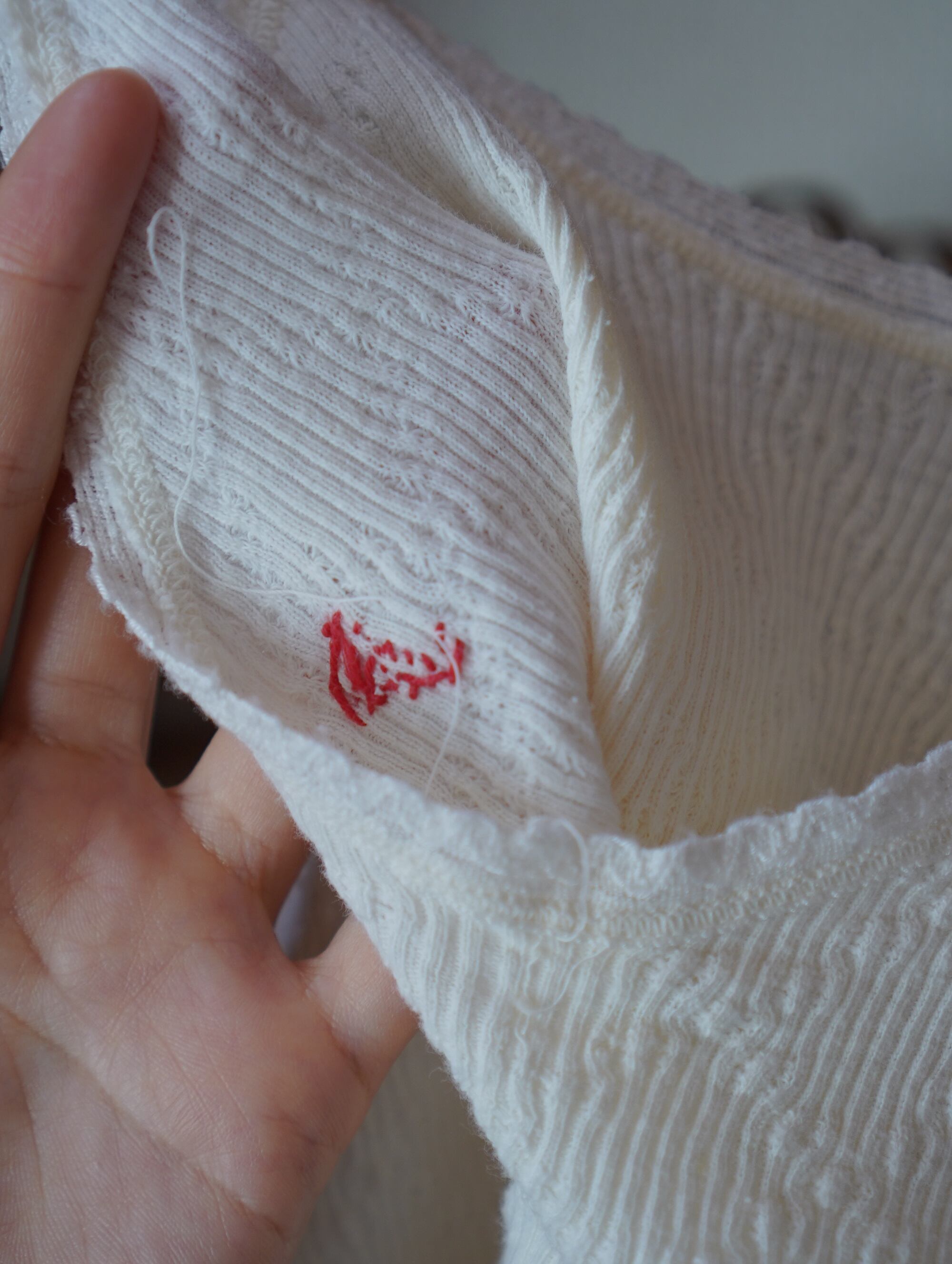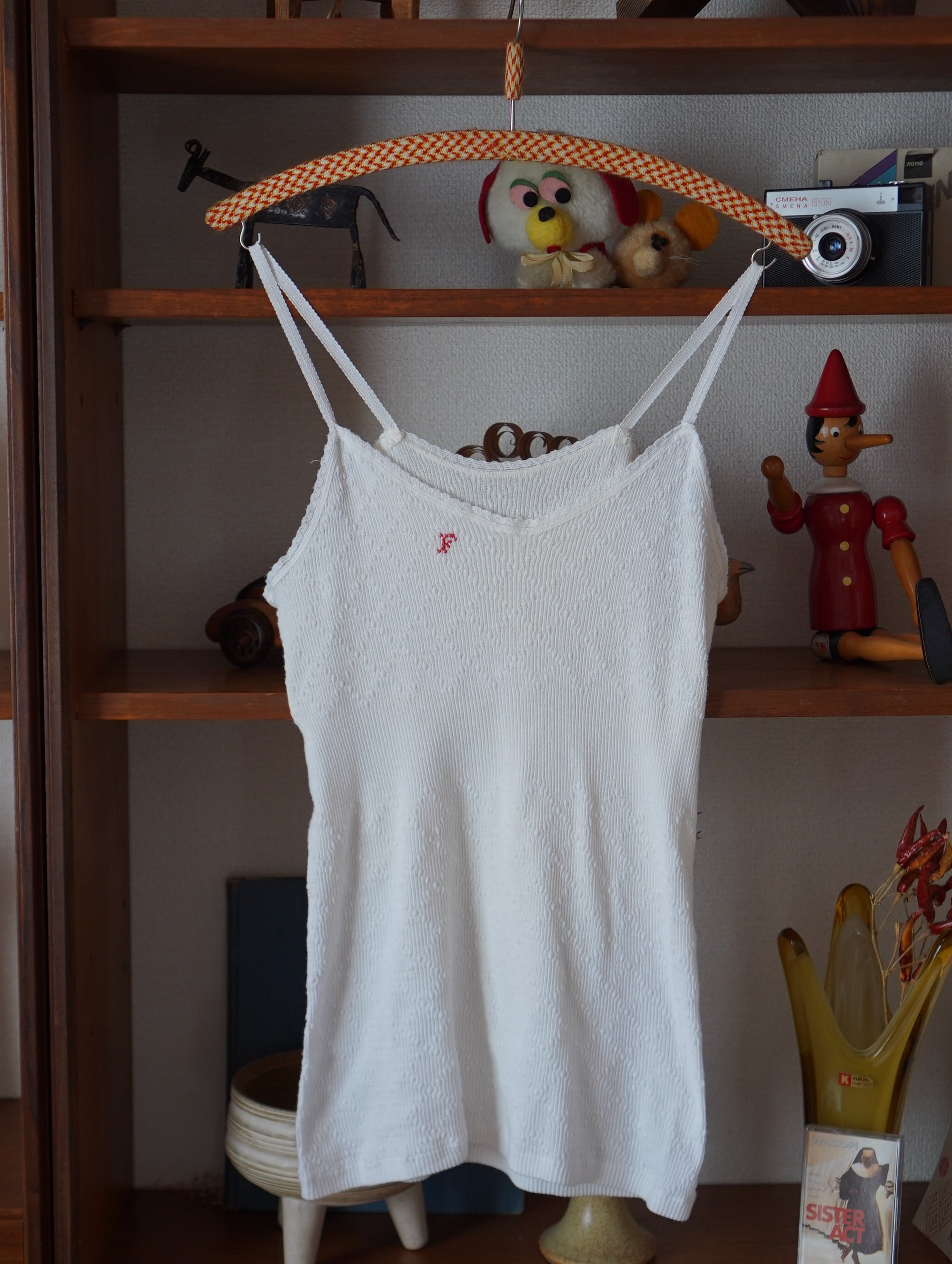 華奢なストラップとコンパクトなシルエットで、インナーとしてもレイヤードでもたのしませてくれます。だれともかぶらない、心強い一着です。/vintage cotton rib knit camisole red embroidery