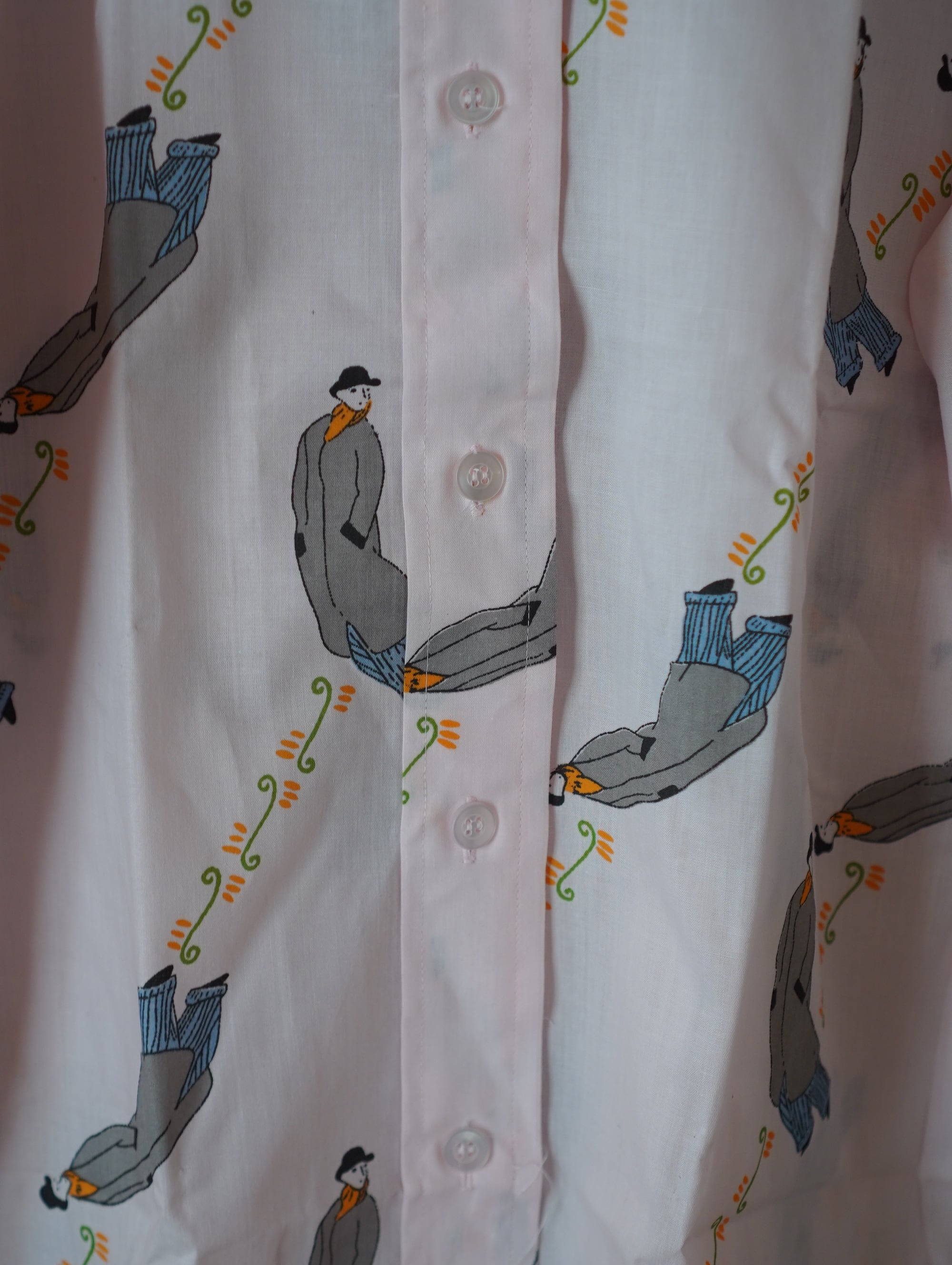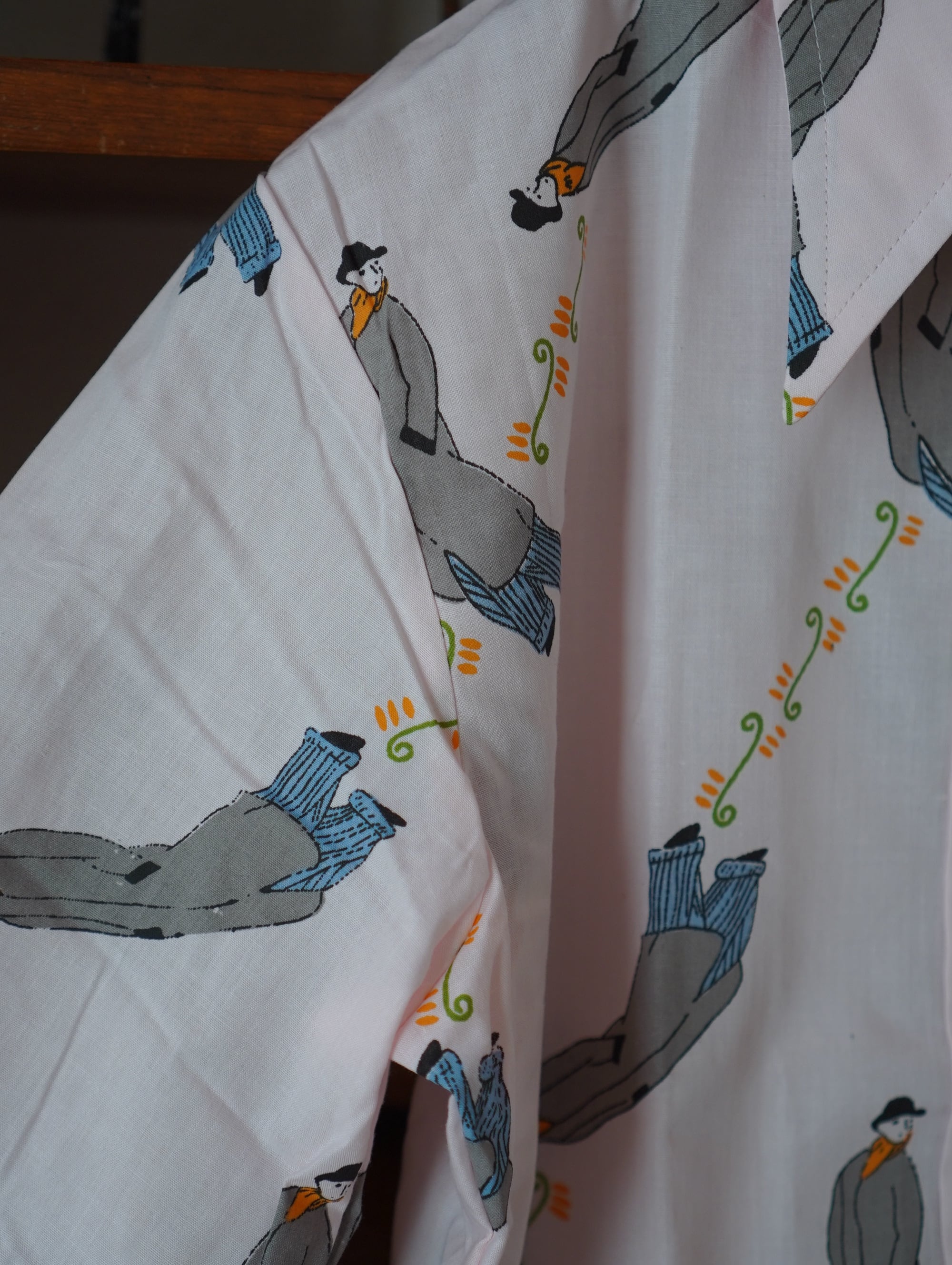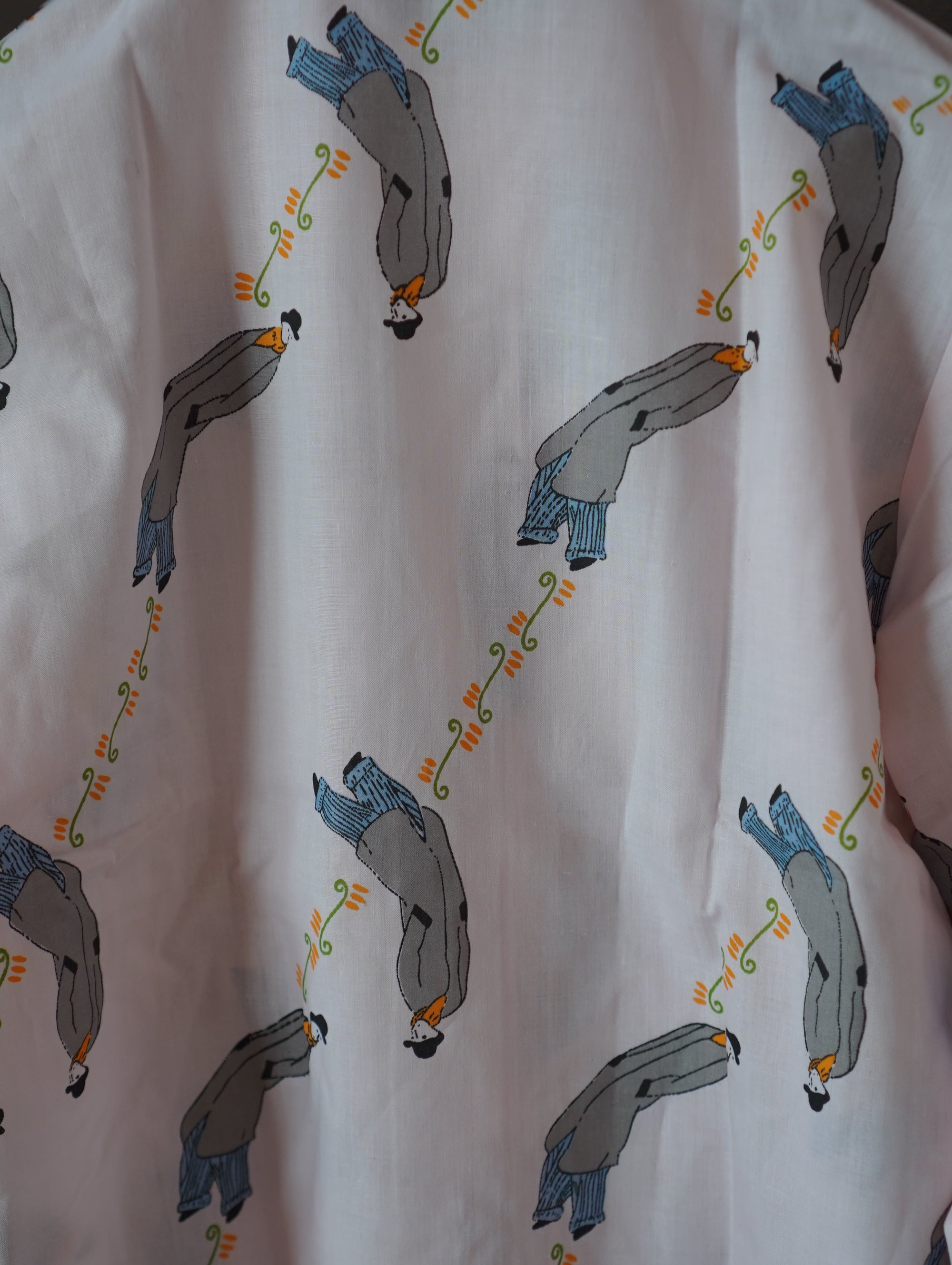 シンプルなボトムに合わせるだけで、スタイリングの主役になる一着。/vintage printed shirt people motif deadstock peach pink