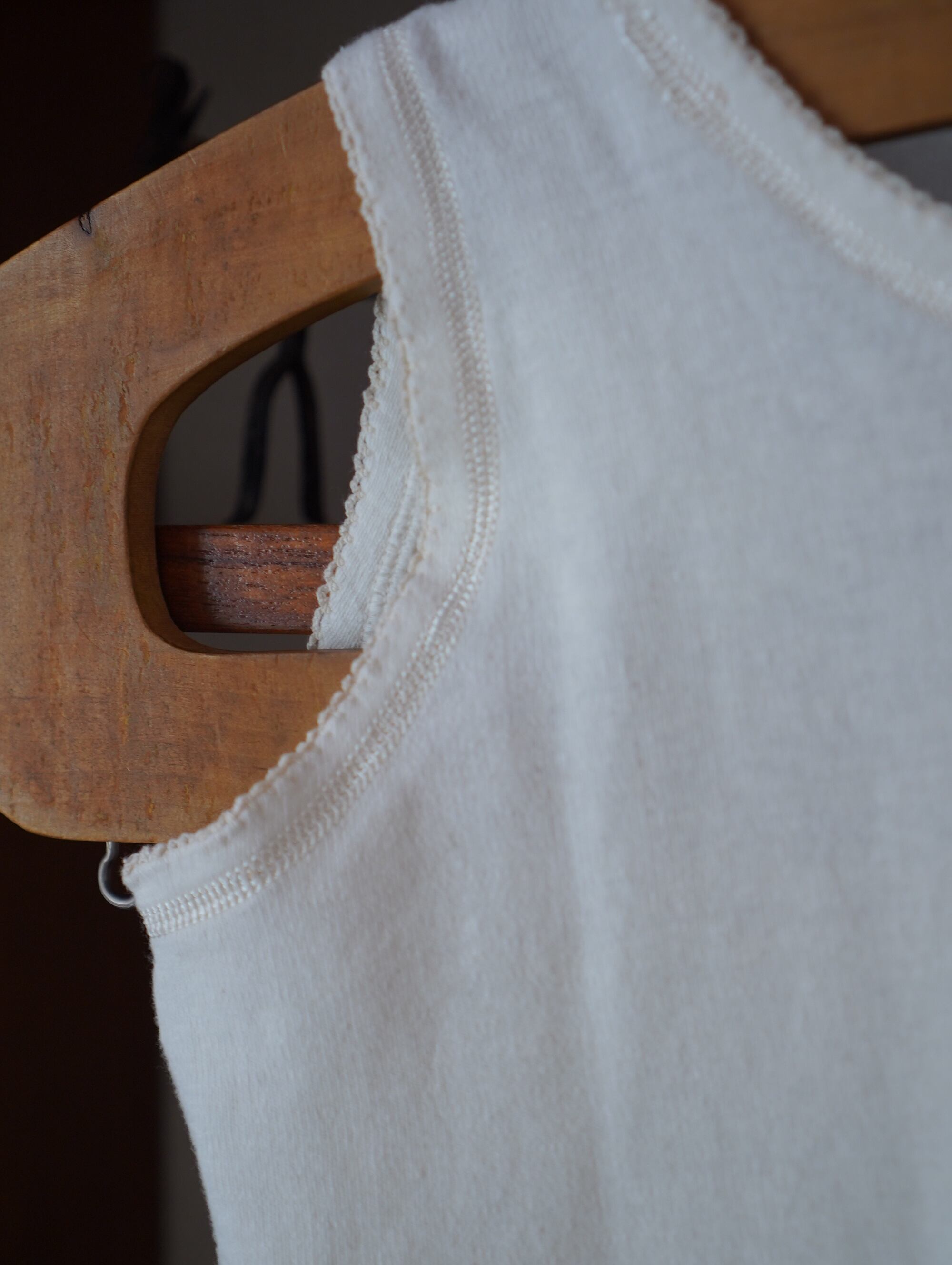 着込まれてきたことで生まれた、やさしいフェード感もたまらなく愛おしいです。カットソーやシャツの上からでも、夏は一枚でさらっと着ても最高にキュート。/vintage cotton compact tank top + picot lace