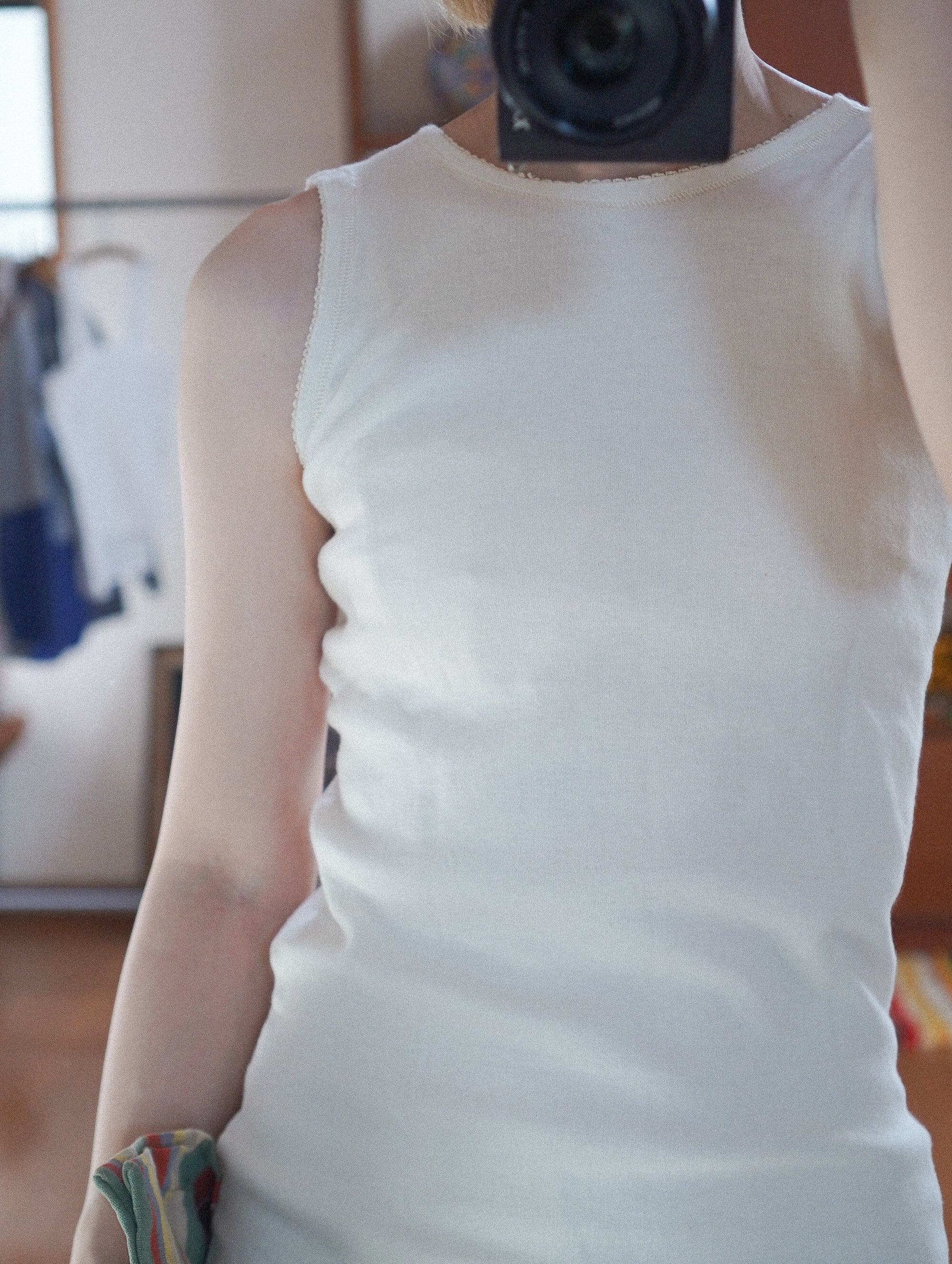 一枚でさらっと着るのはもちろん、レイヤードもたのしませてくれる万能アイテム。/vintage cotton scallop tank top