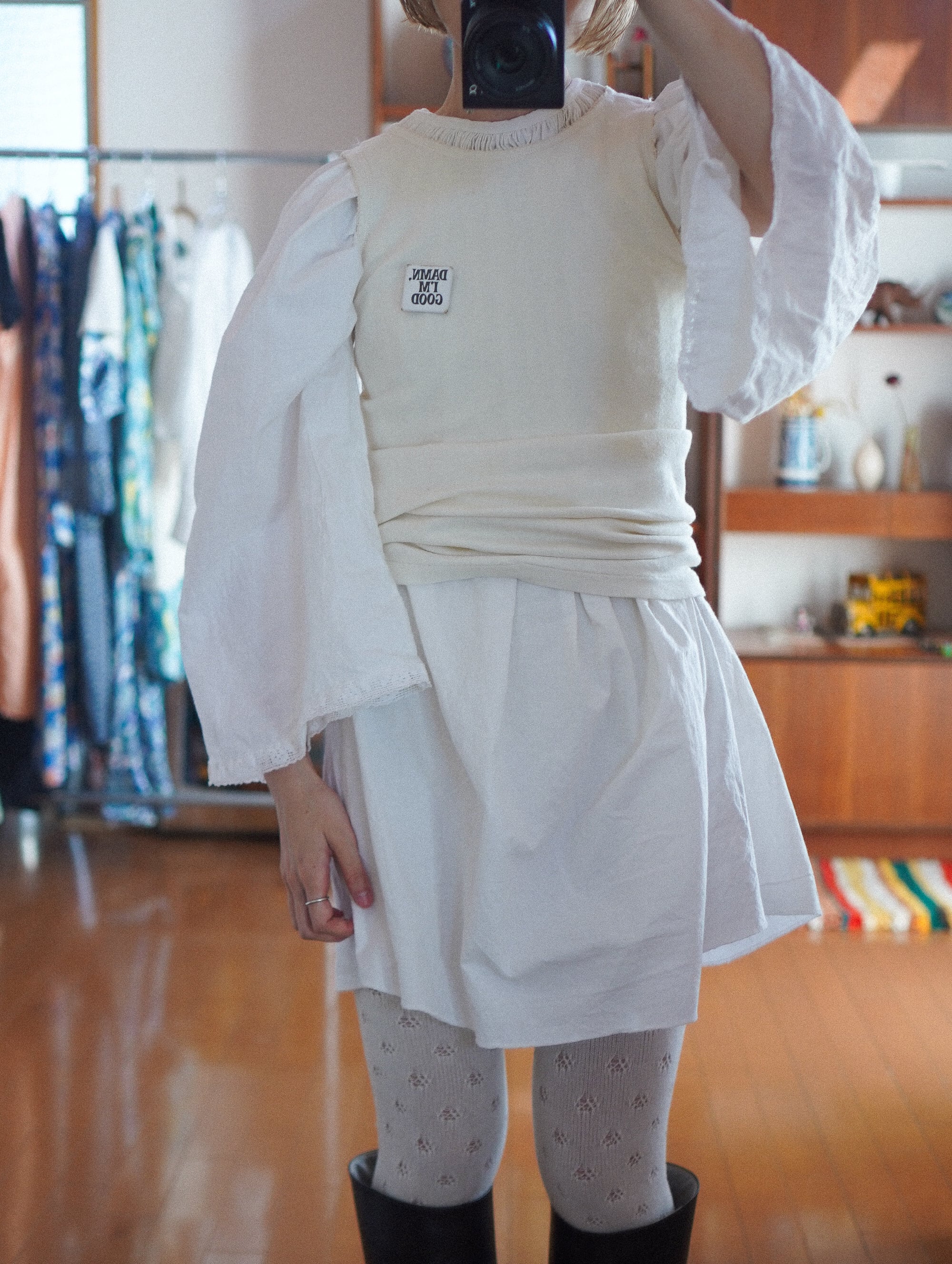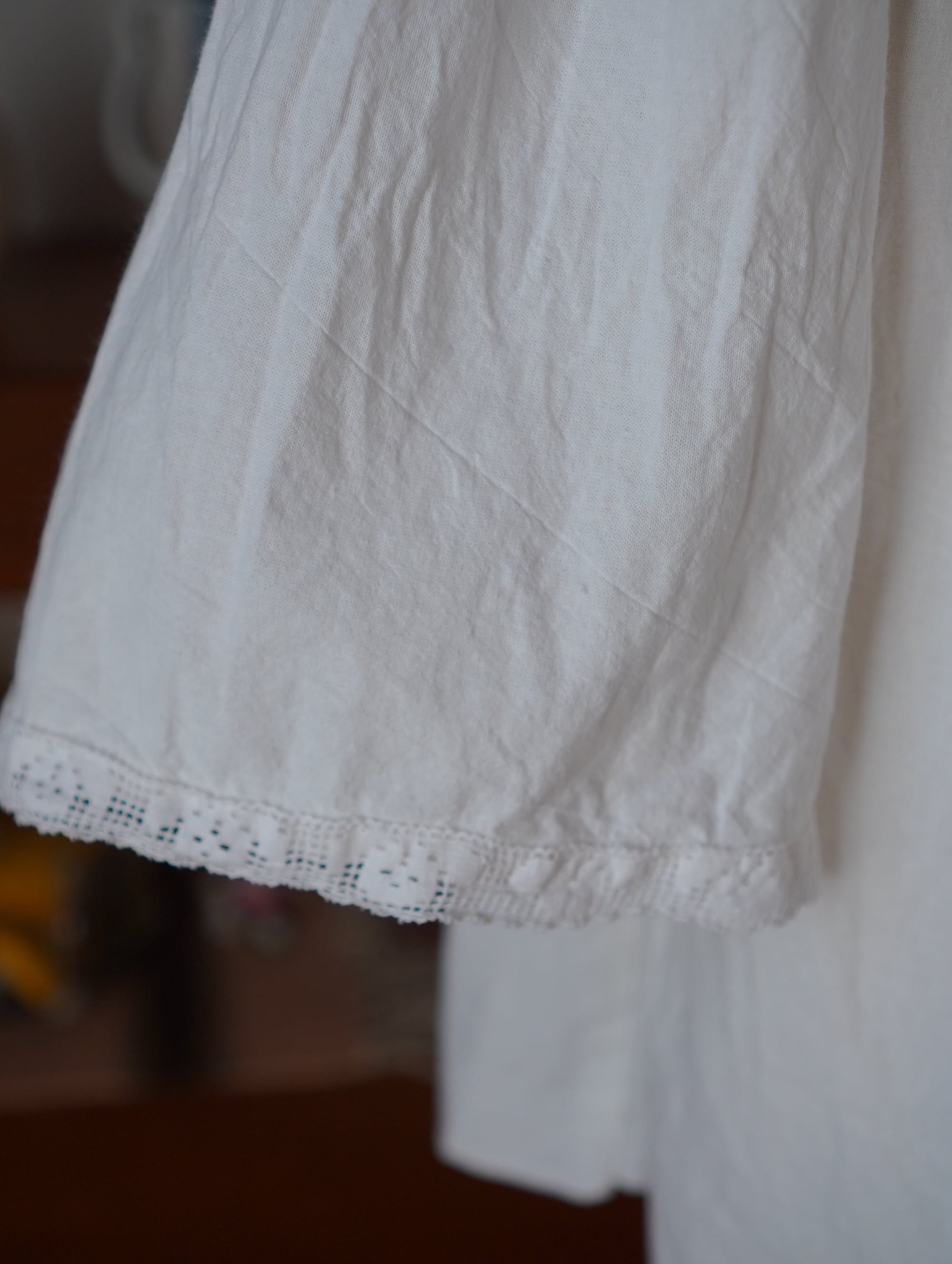 動くたびにやさしく広がって、軽やかで、どこか儚さも感じる一着。袖口には繊細なレースがあしらわれていて、シンプルな中にちょっとしたキュートさが混ざっていてきゅんとします。デニムでラフに着ても、一枚でミニワンピースとしてもたのしめます。ゆったりとしたサイズ感で、リラックスして着用できるのもうれしいポイント。ビスチェやタンクトップ、vintageのランジェリーブラと合わせてもたのしい。日常にも、少し特別な日にも寄り添ってくれるような一着。/handmade cotton gathered blouse