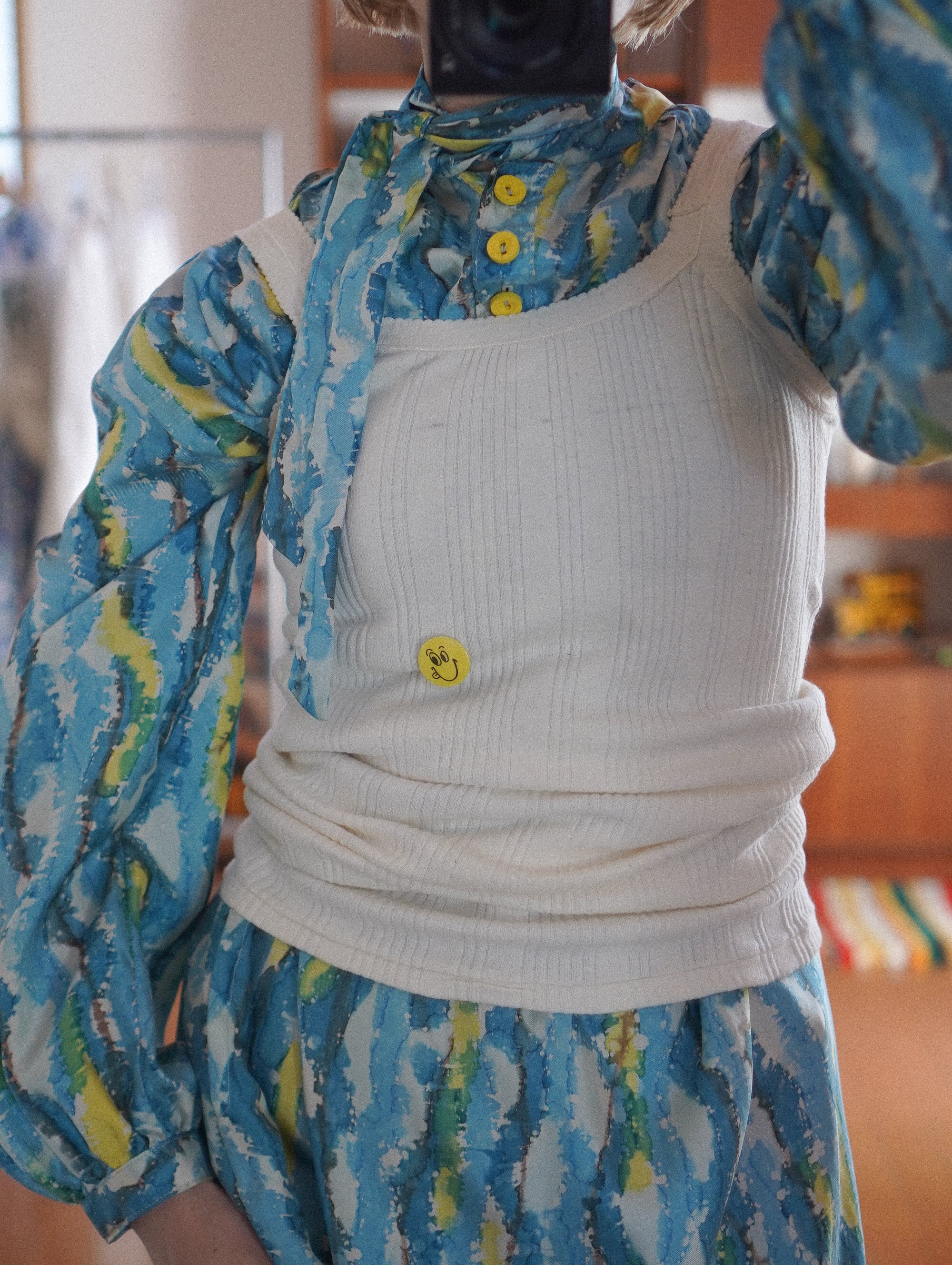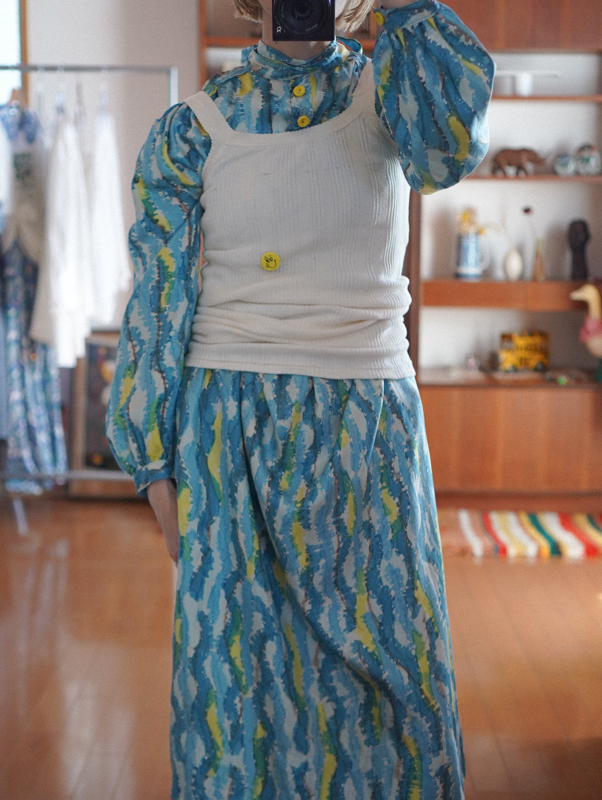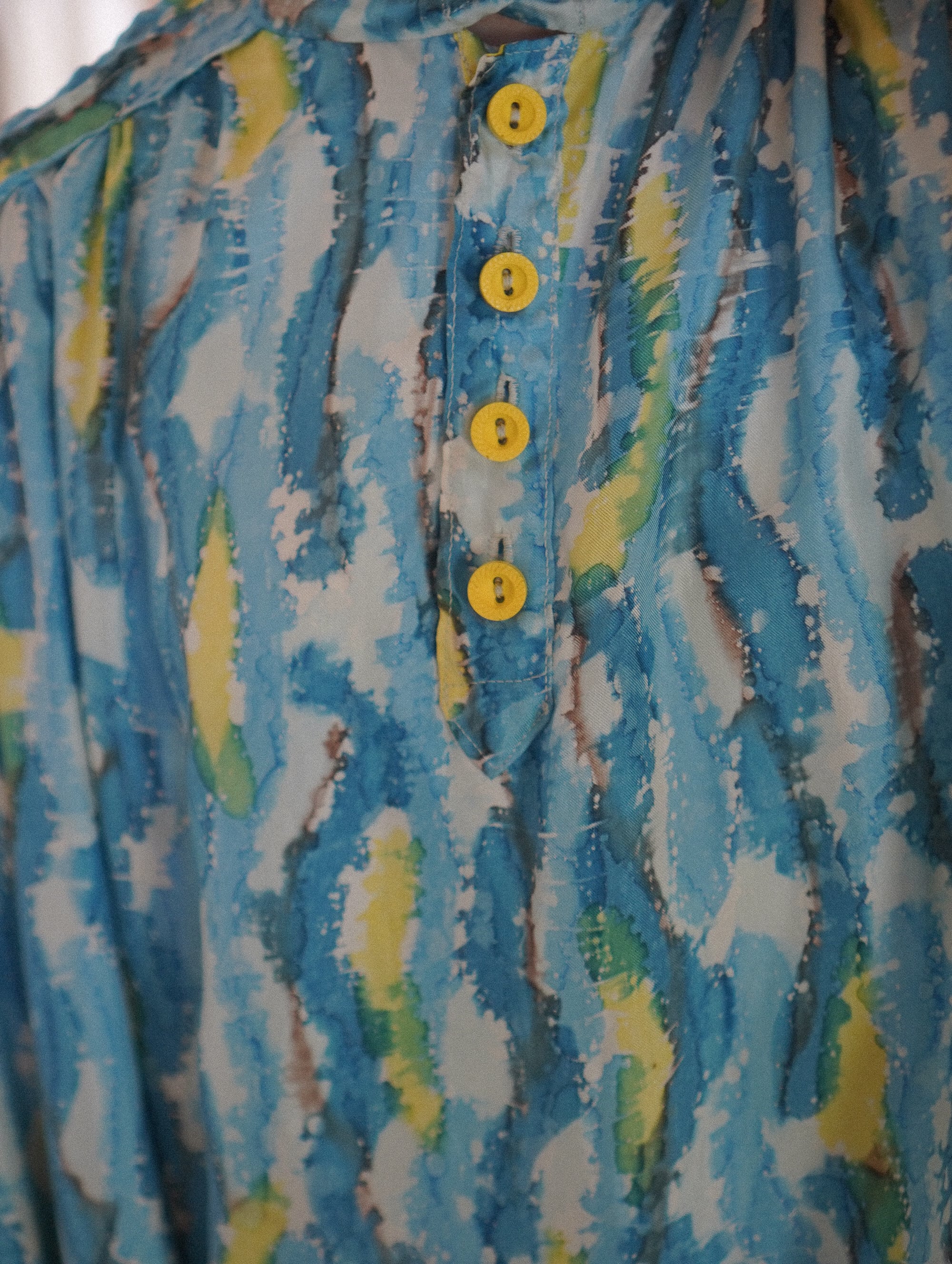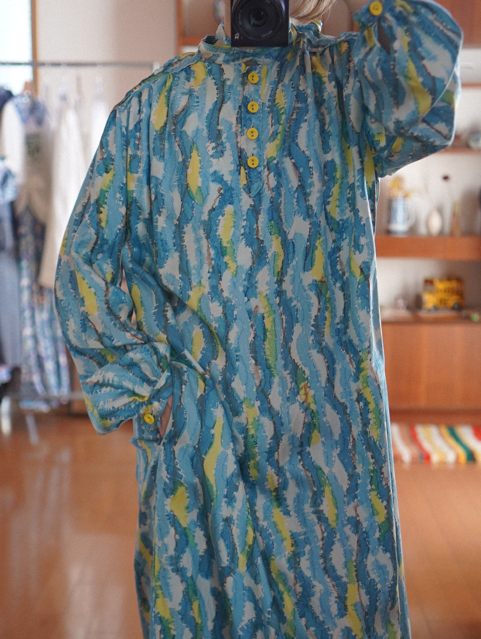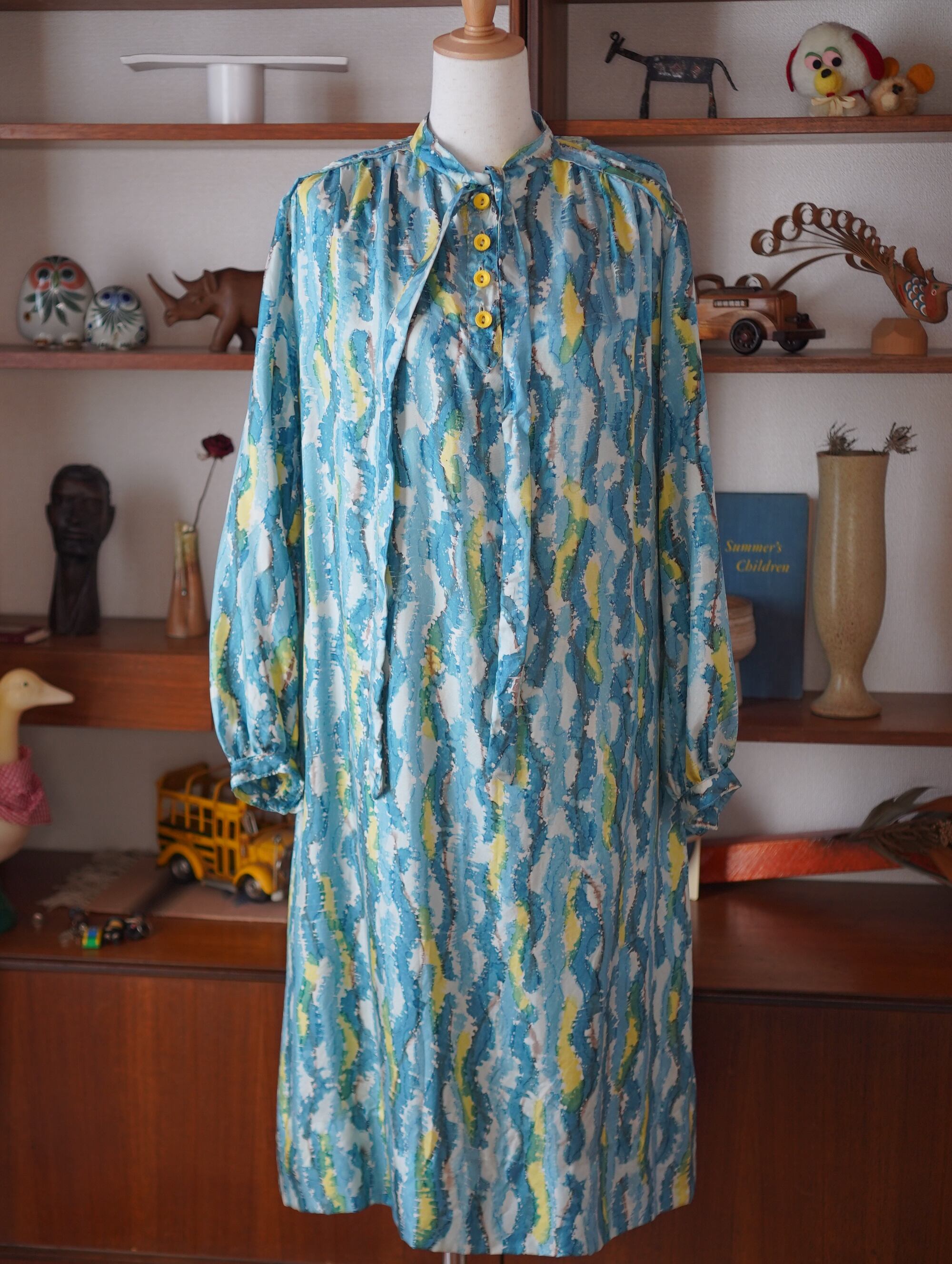 イエローのおもちゃみたいなころんとしたボタンがチャームポイント。軽やかな質感で、おそらくシルクと思われる生地は、風が吹くとゆらゆらと揺れて、動きのあるシルエットできゅんとさせてくれます。首元はボウタイデザインで、後ろや前で結んでも、横で結んでもたのしい一着。/vintage bow tie printed dress