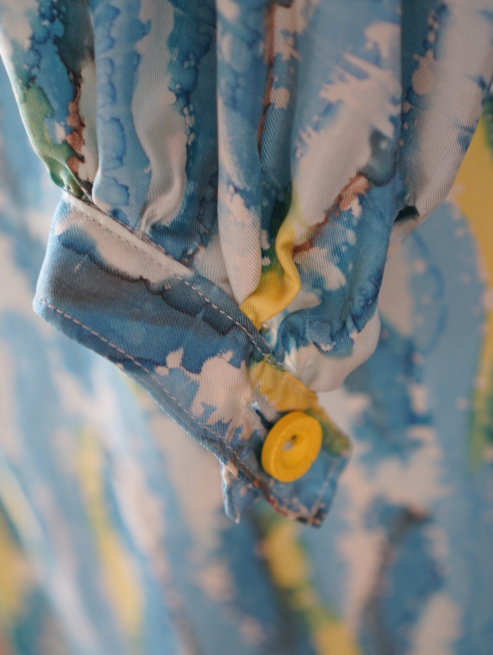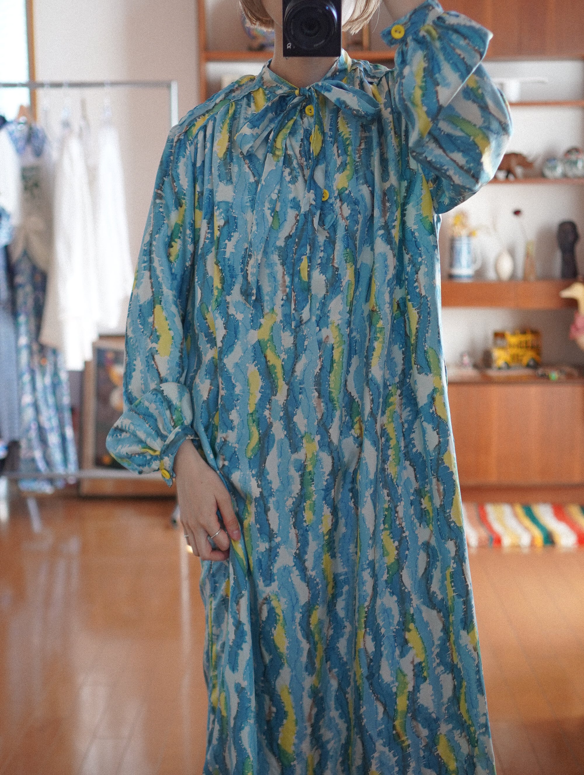 水彩画のようににじむブルーとイエローのカラーが目を惹く、アートなワンピース。