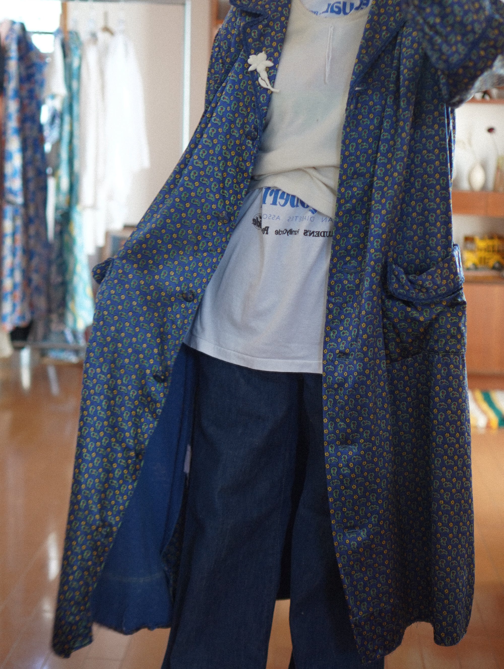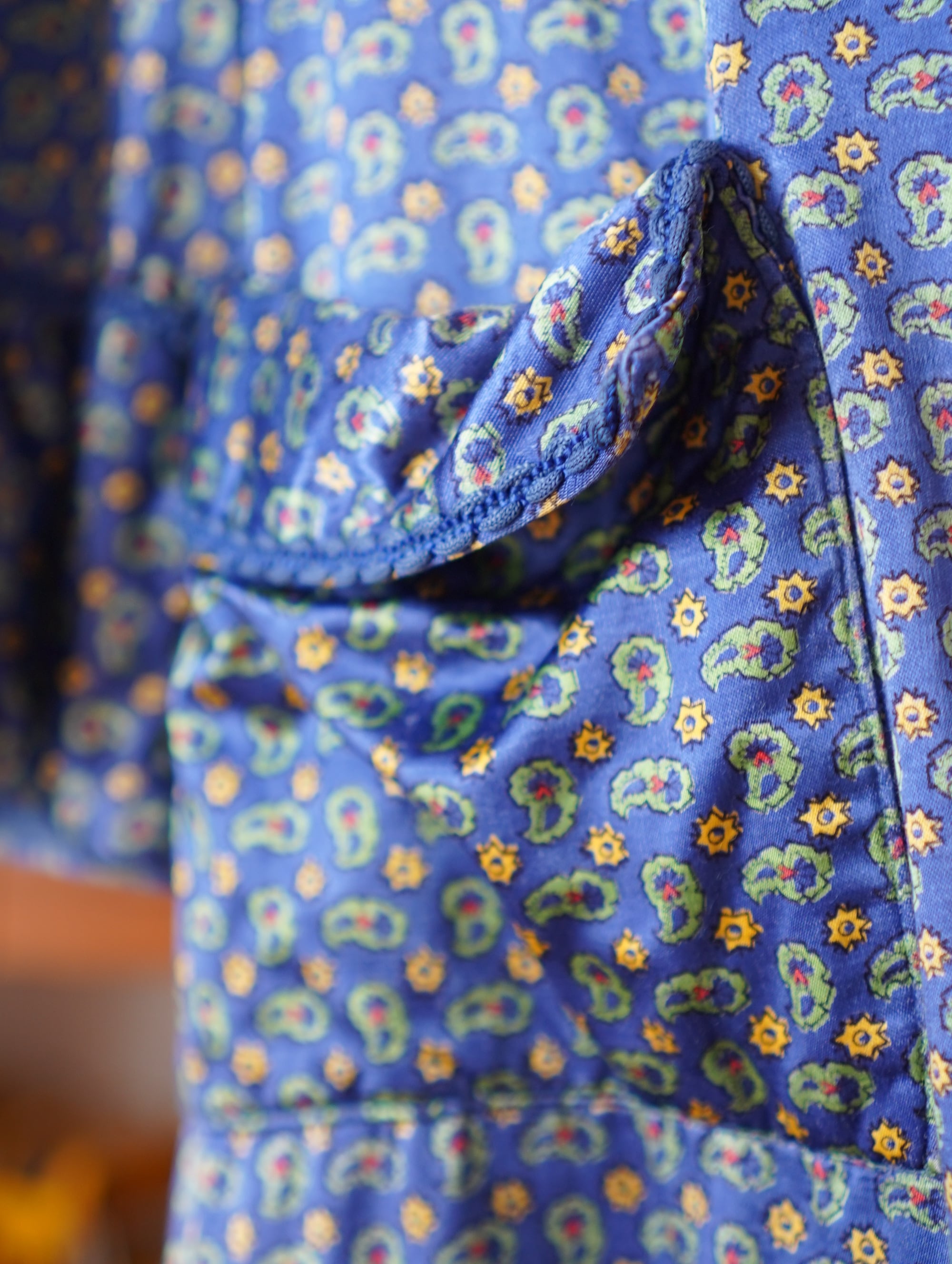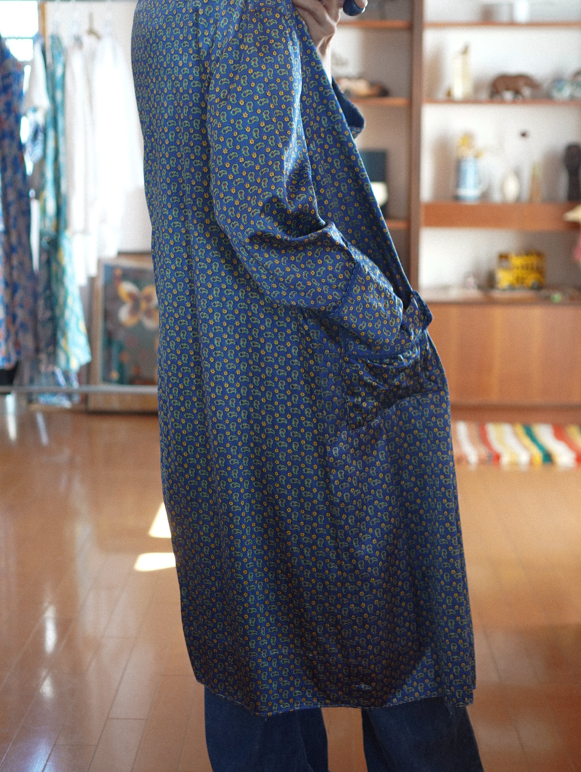 つるっとした質感のサテン生地は、なめらかでほんのり光沢があり、動くたびにやわらかくゆらゆらと揺れる着心地。深みのあるネイビーブルーに、グリーンやイエローの小さな柄が愛おしいです。ぷくっとしたシルエットのポケットのディテールから、ハンドメイドならではのあたたかみを感じます。/vintage paisley floral gown dress
