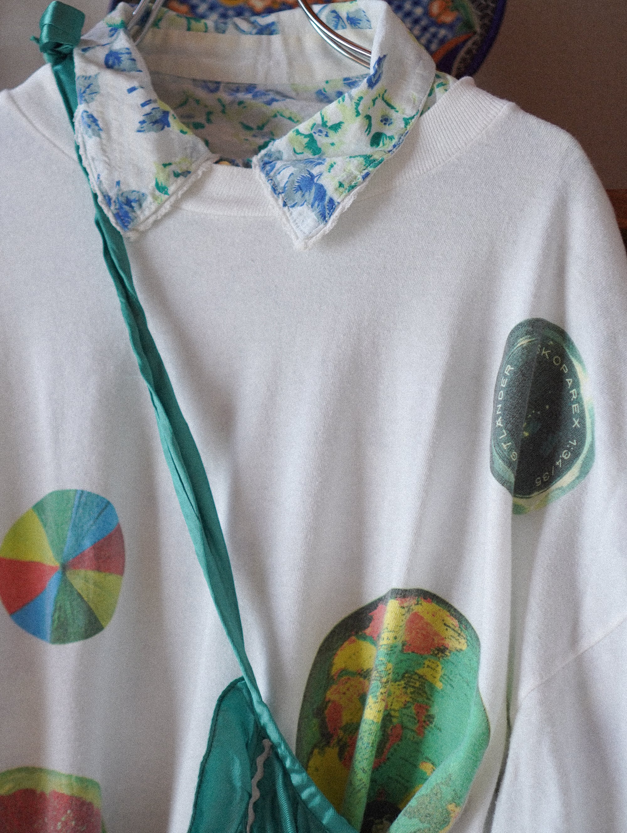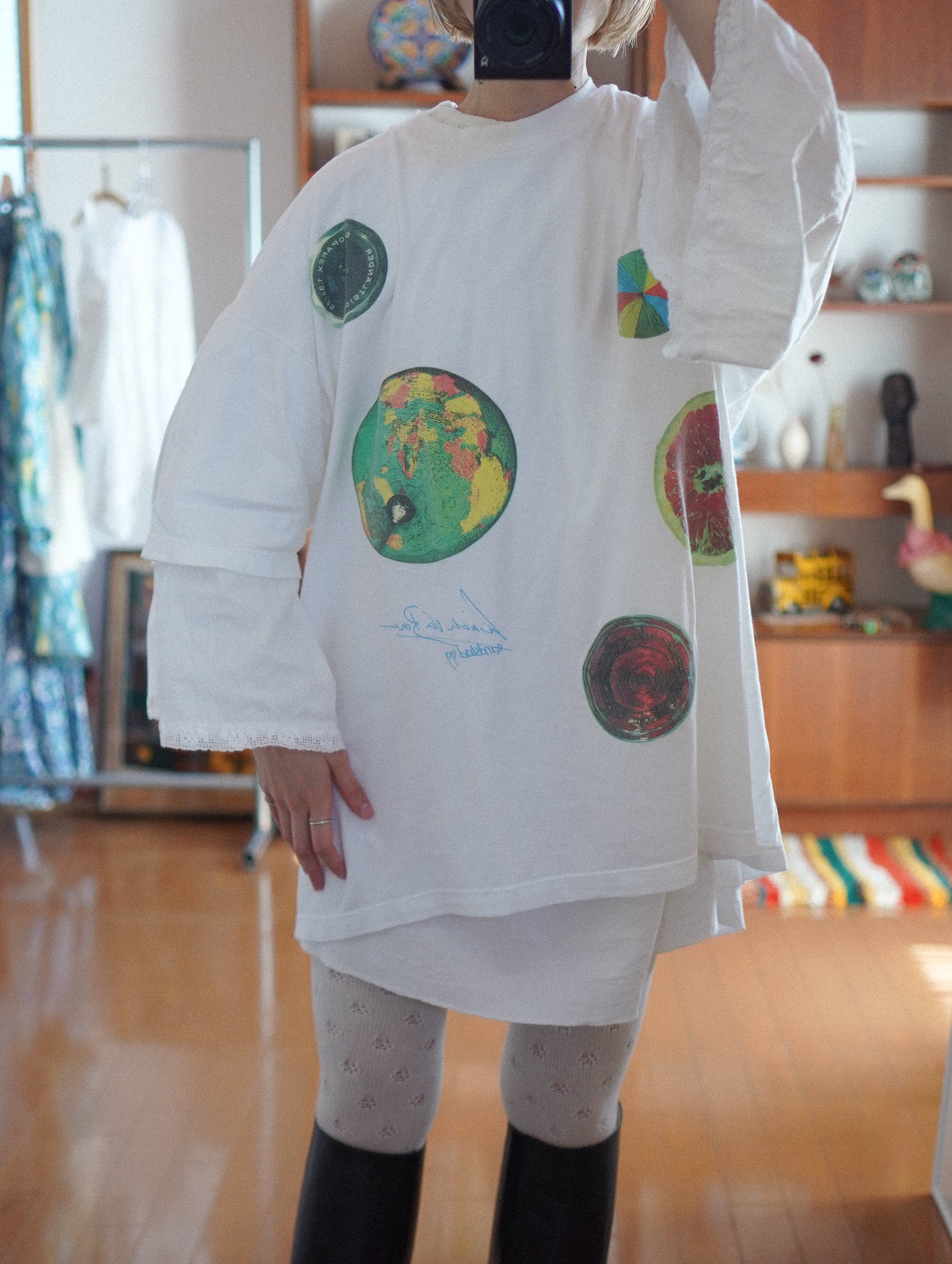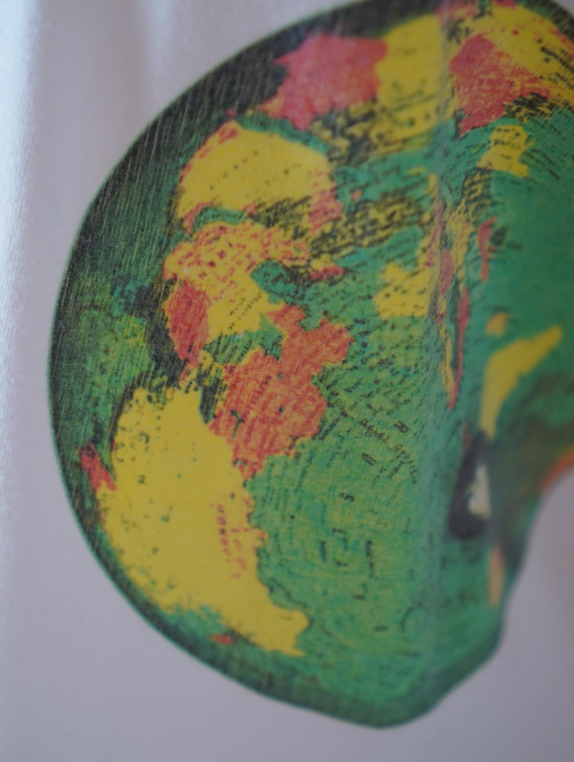 地球や果実、抽象的なモチーフが組み合わされた独特なグラフィックがチャームポイントな、ヴィンテージプリントTシャツ。