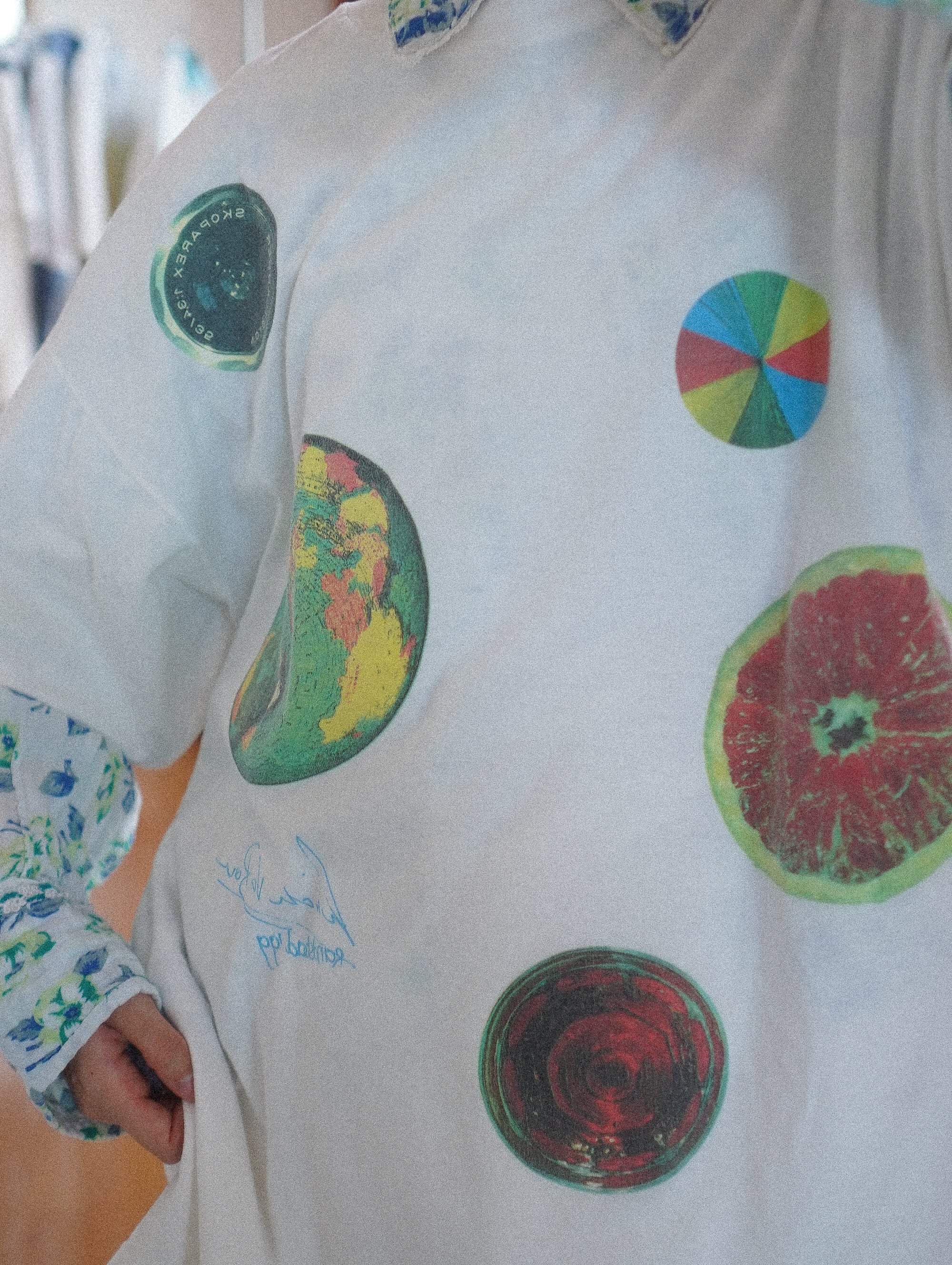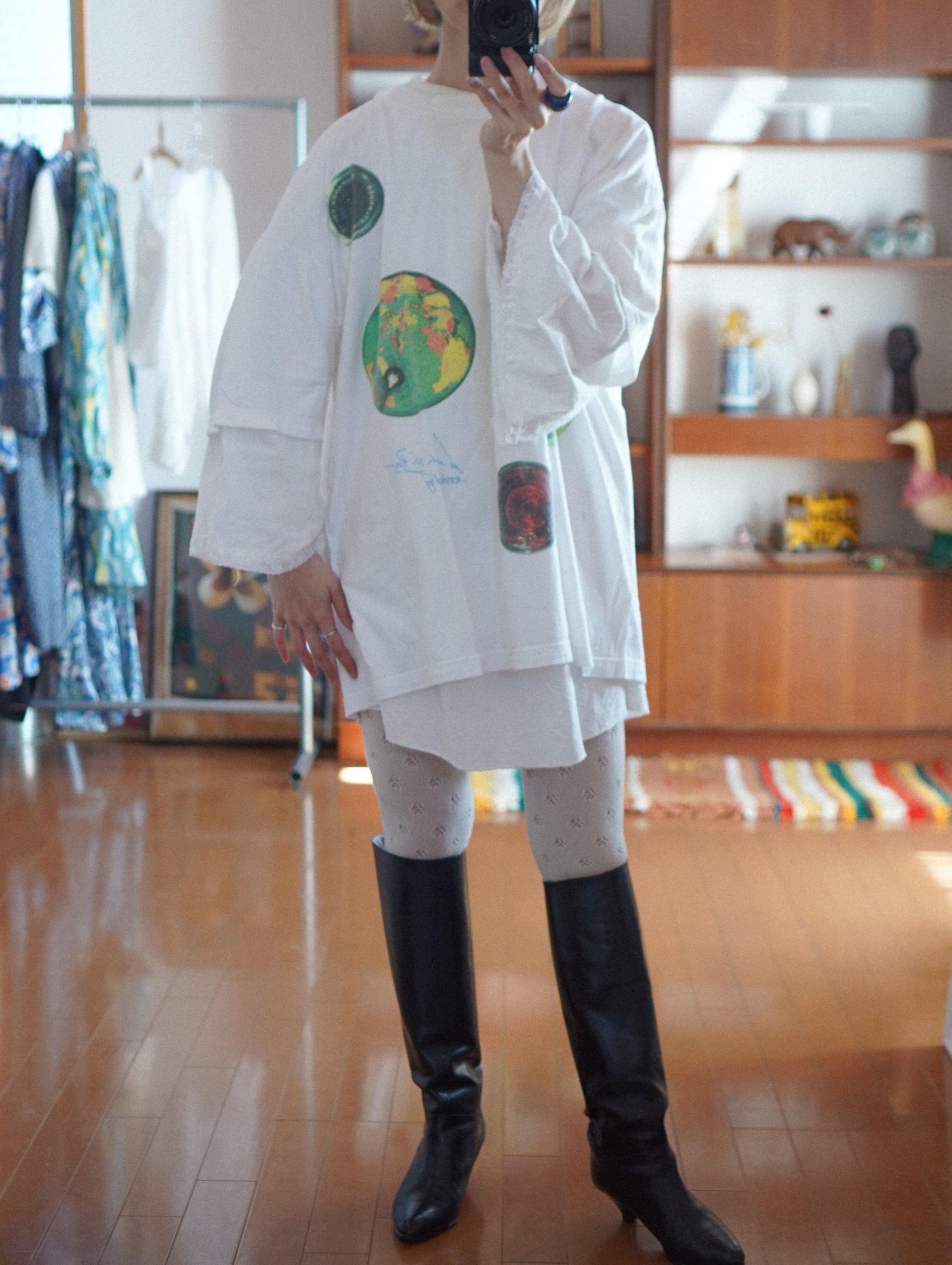 バランスよく配置されたモチーフと余白で、一枚でスタイリングの主役になる一着です。フロントにはサインプリントが入り、作品のような特別感もきゅんポイント。
