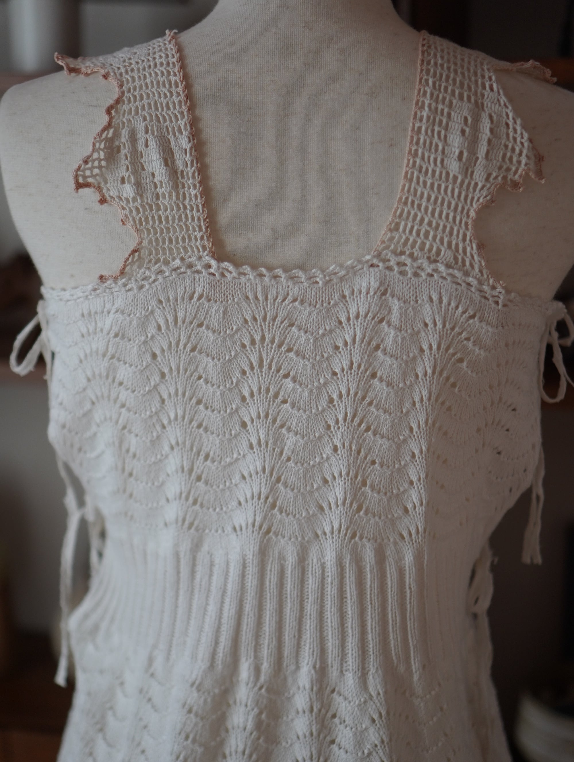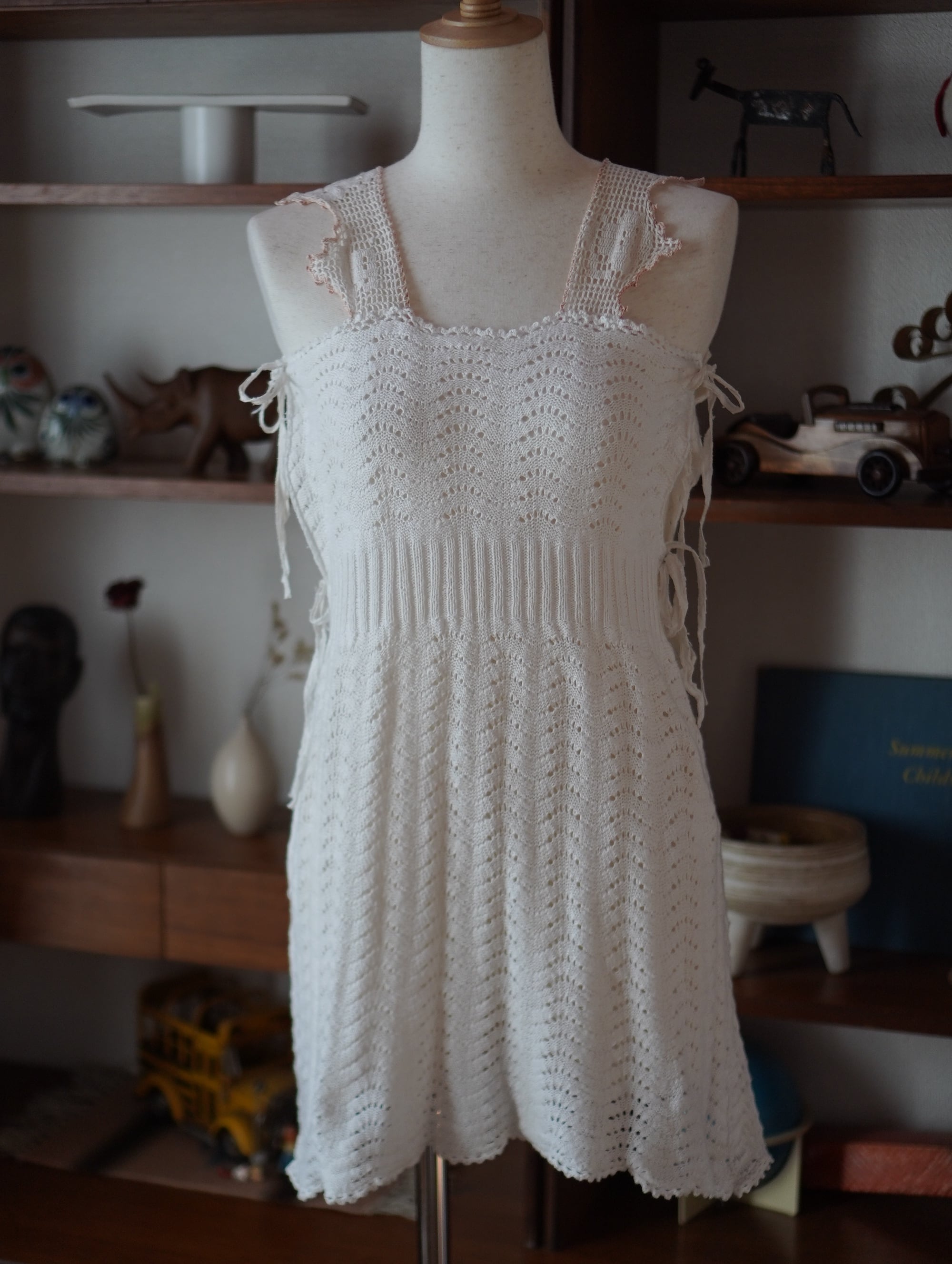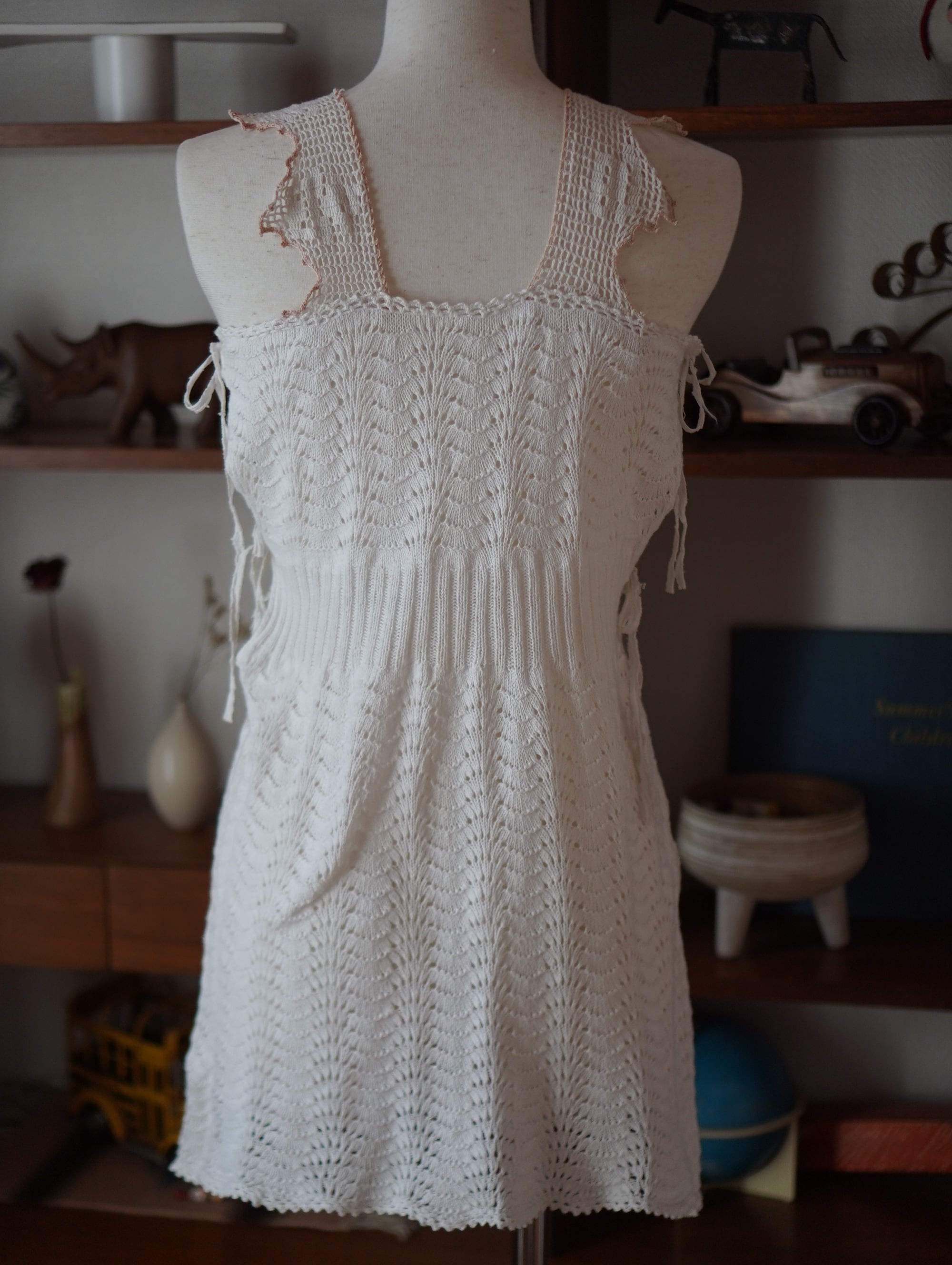ハンドニットのボディ部分は、軽くてやわらかく、伸縮性があり、サイズを問わず幅広く着ていただけそうです。ラフにも、キュートにも。着方次第でいろんな表情をたのしめる一着。/ hand crochet strap remake knit dress