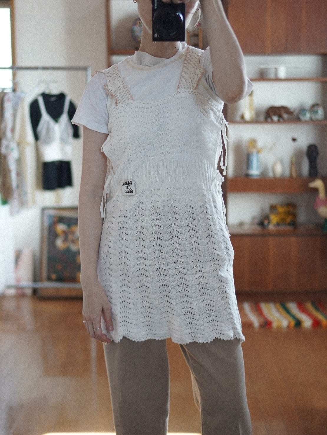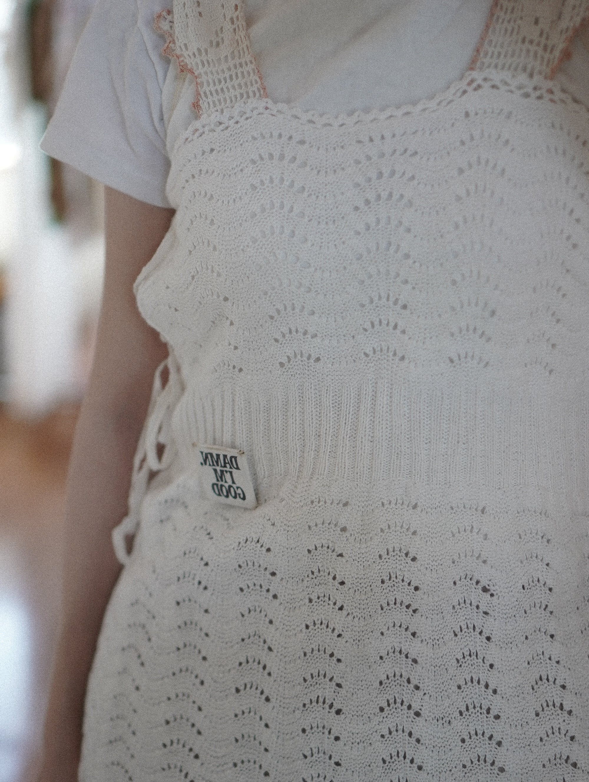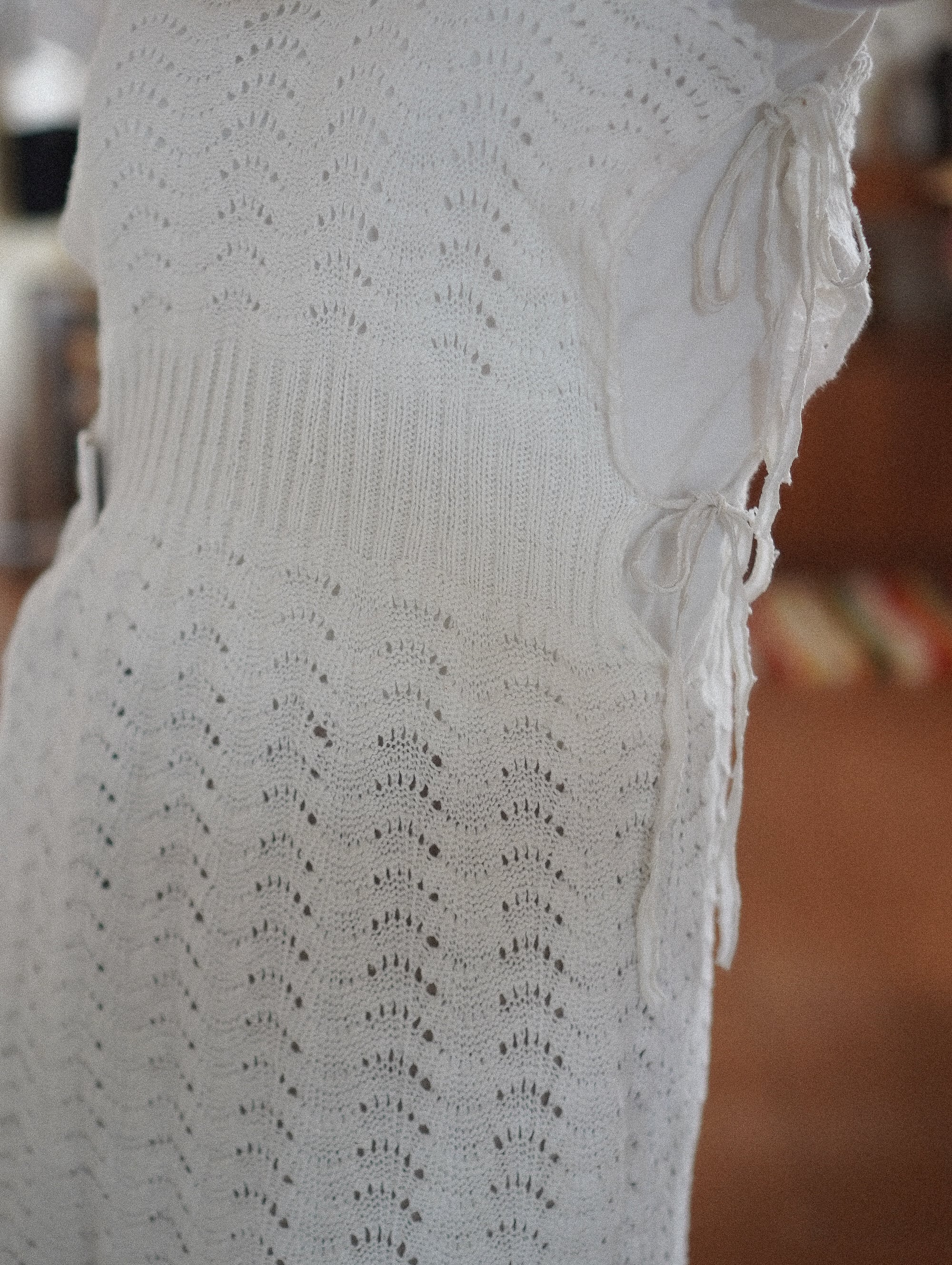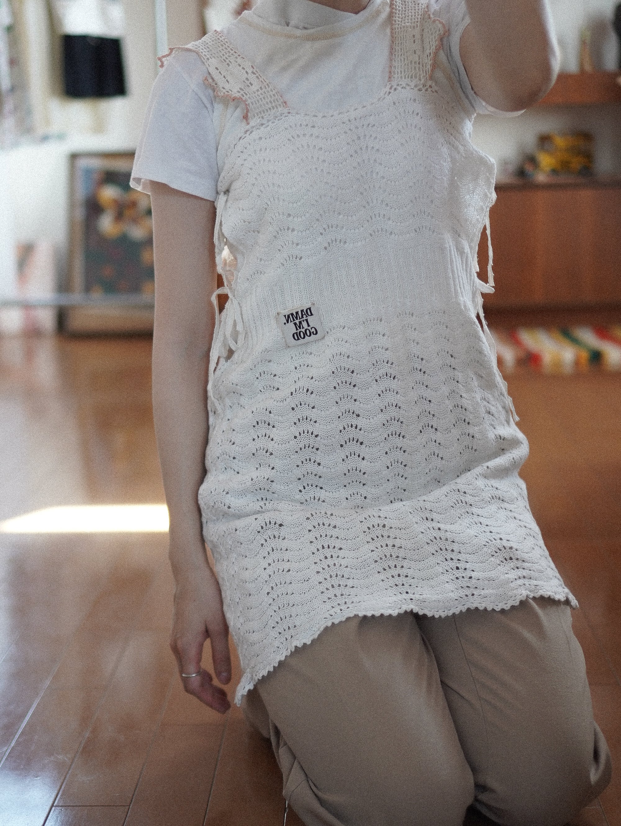ハンドニットのボディ部分は、軽くてやわらかく、伸縮性があり、サイズを問わず幅広く着ていただけそうです。ラフにも、キュートにも。着方次第でいろんな表情をたのしめる一着。/ hand crochet strap remake knit dress