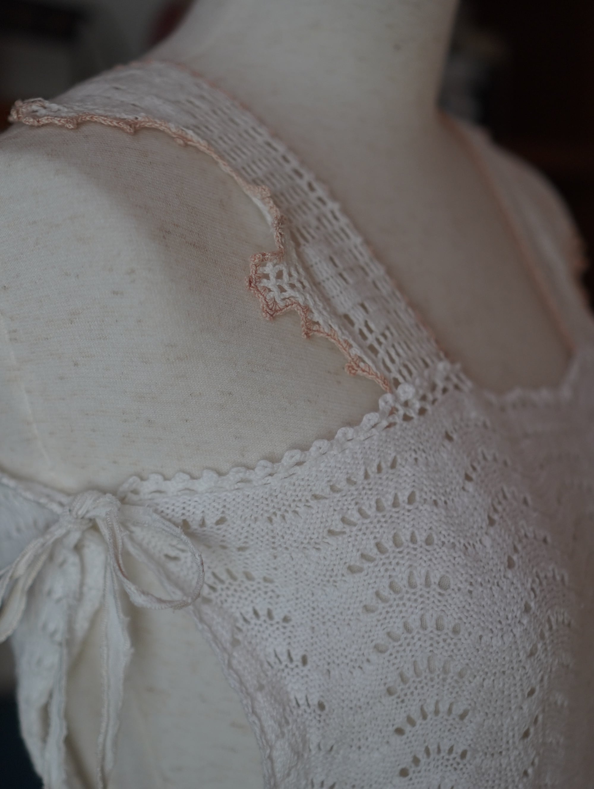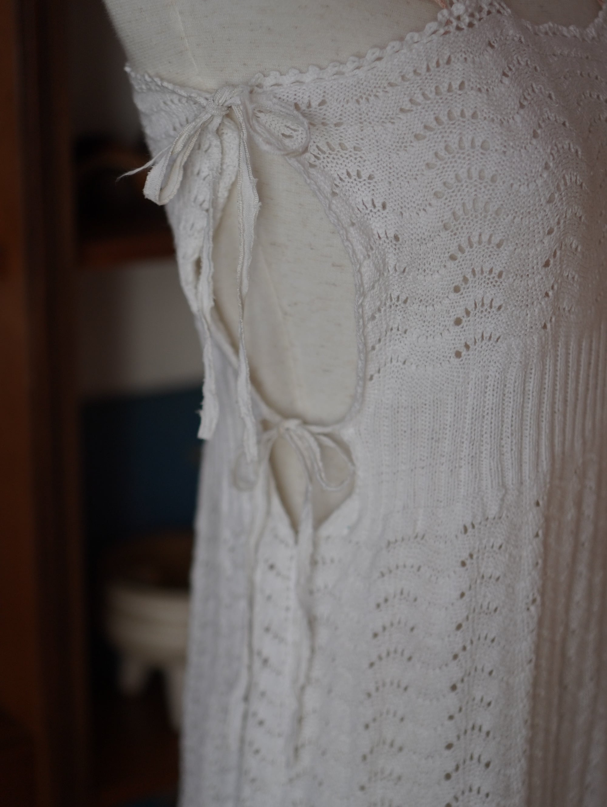 remakeで肩紐とサイドに紐をつけ、リボン結びでぎゅっとシルエットを調整できる仕様に仕上げました。肩紐やサイドの紐も古いものを使用しているため、儚げな雰囲気をそのまま残しています。