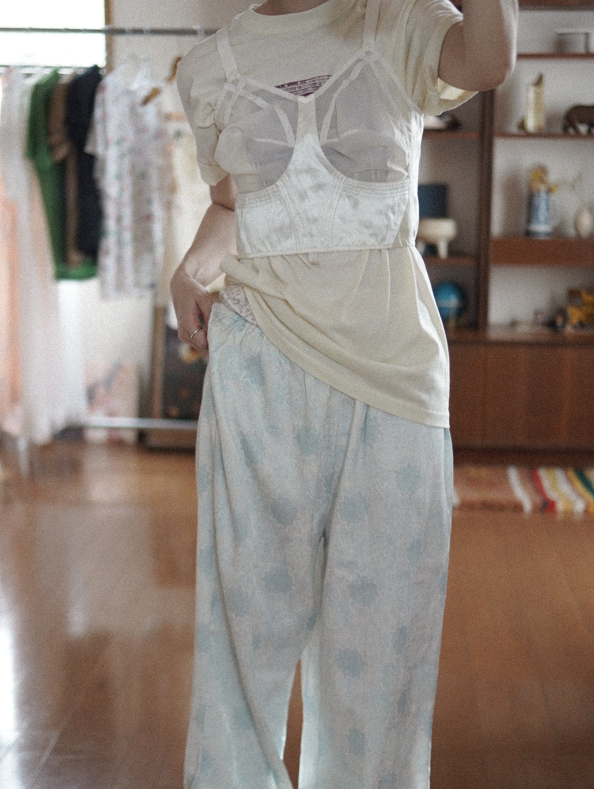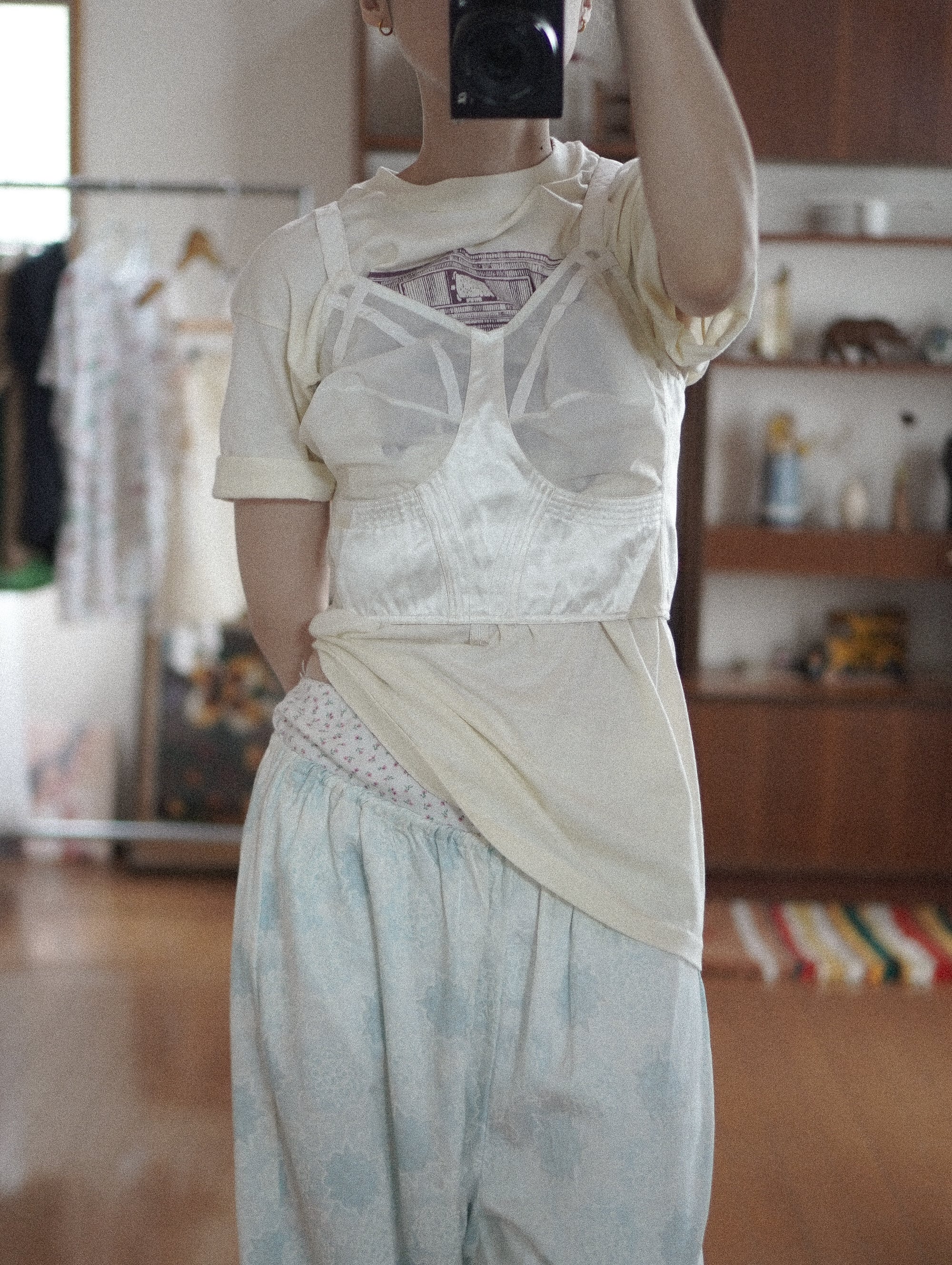 タンクトップと合わせたり、Tシャツのロゴやプリントを透かして見せるのも、最高にキュートです。厚手のスウェットやニットに重ねたり、季節を問わず活躍してくれる一着。/ vintage soft sheer bustier top