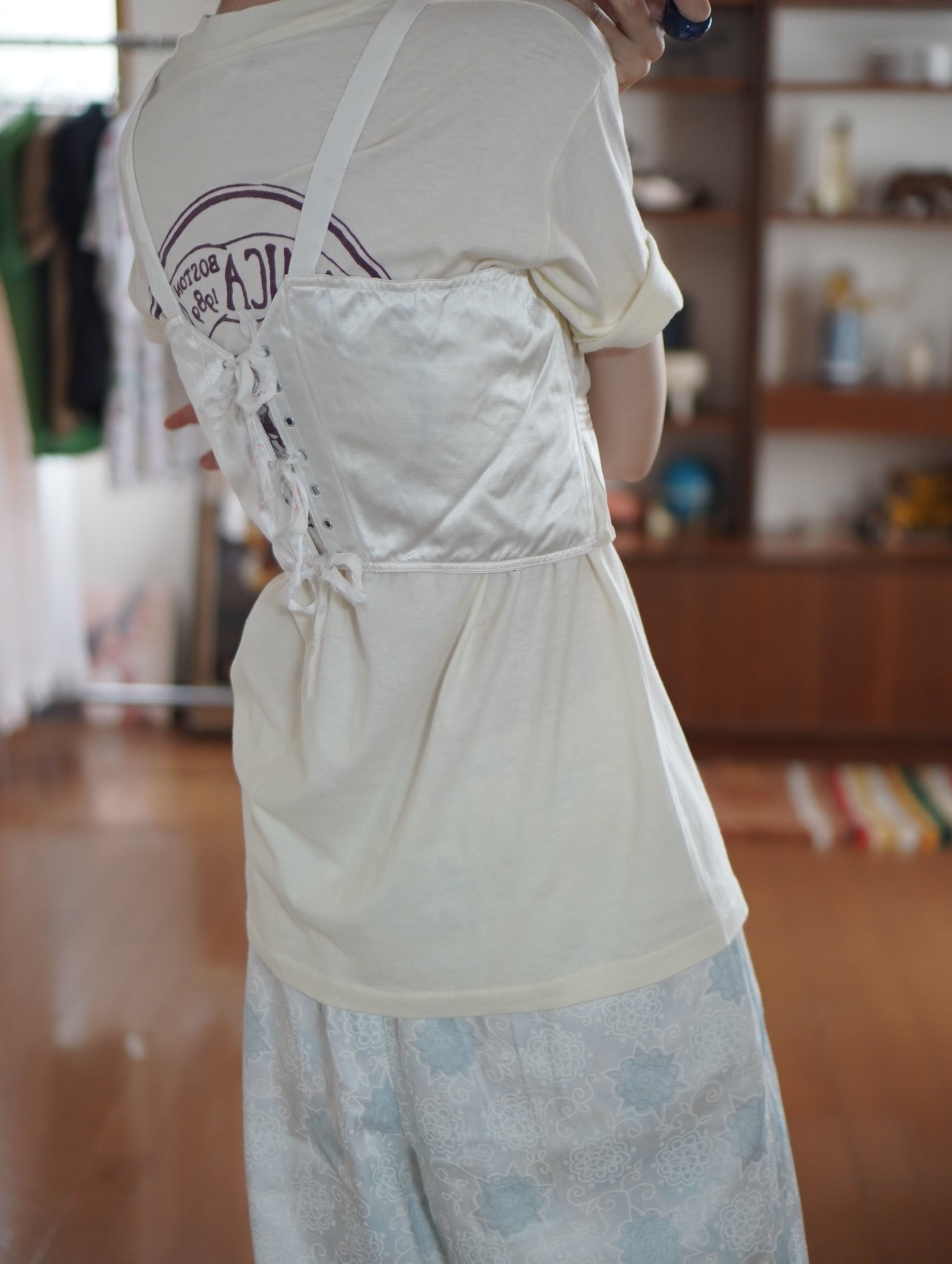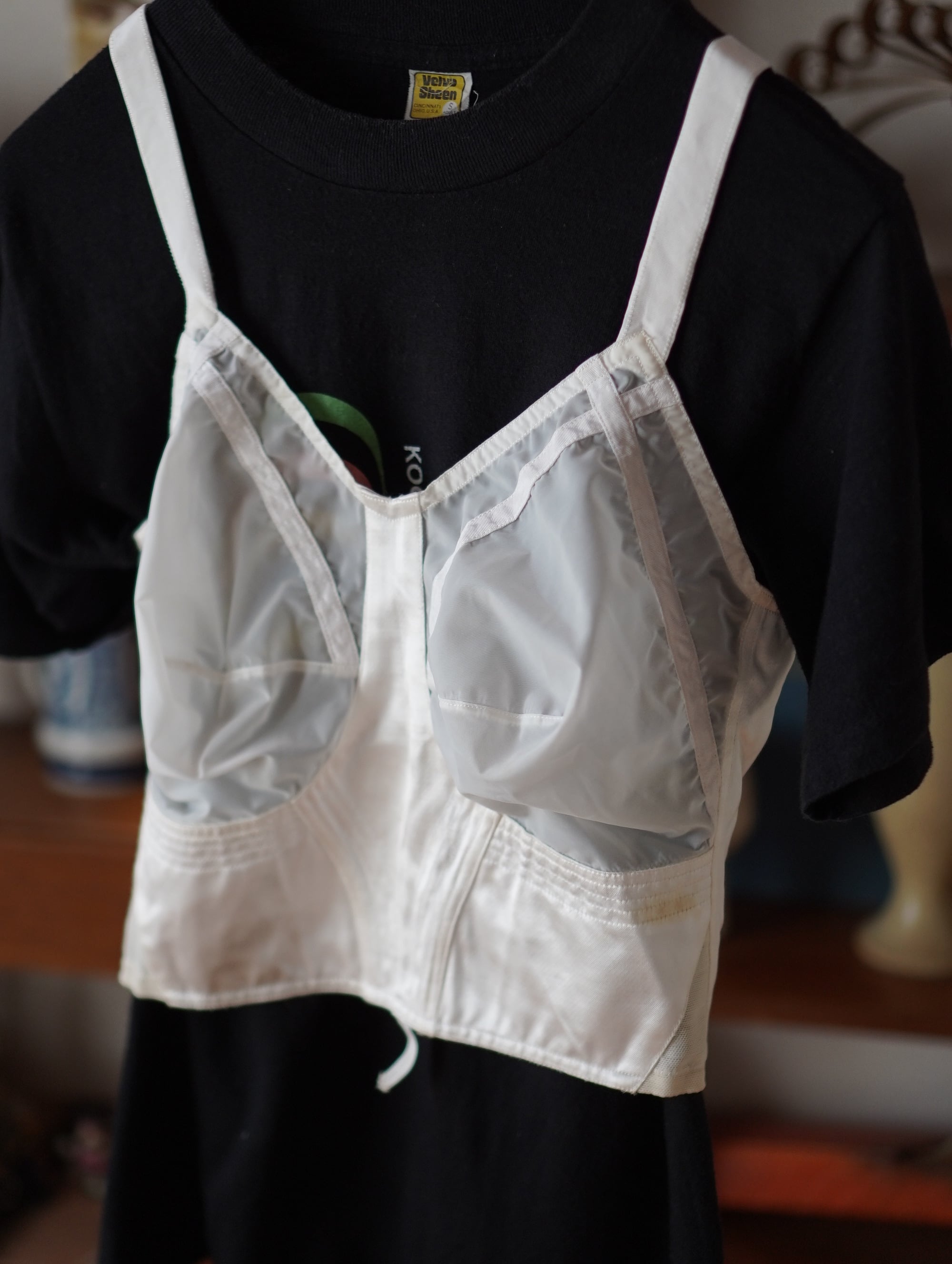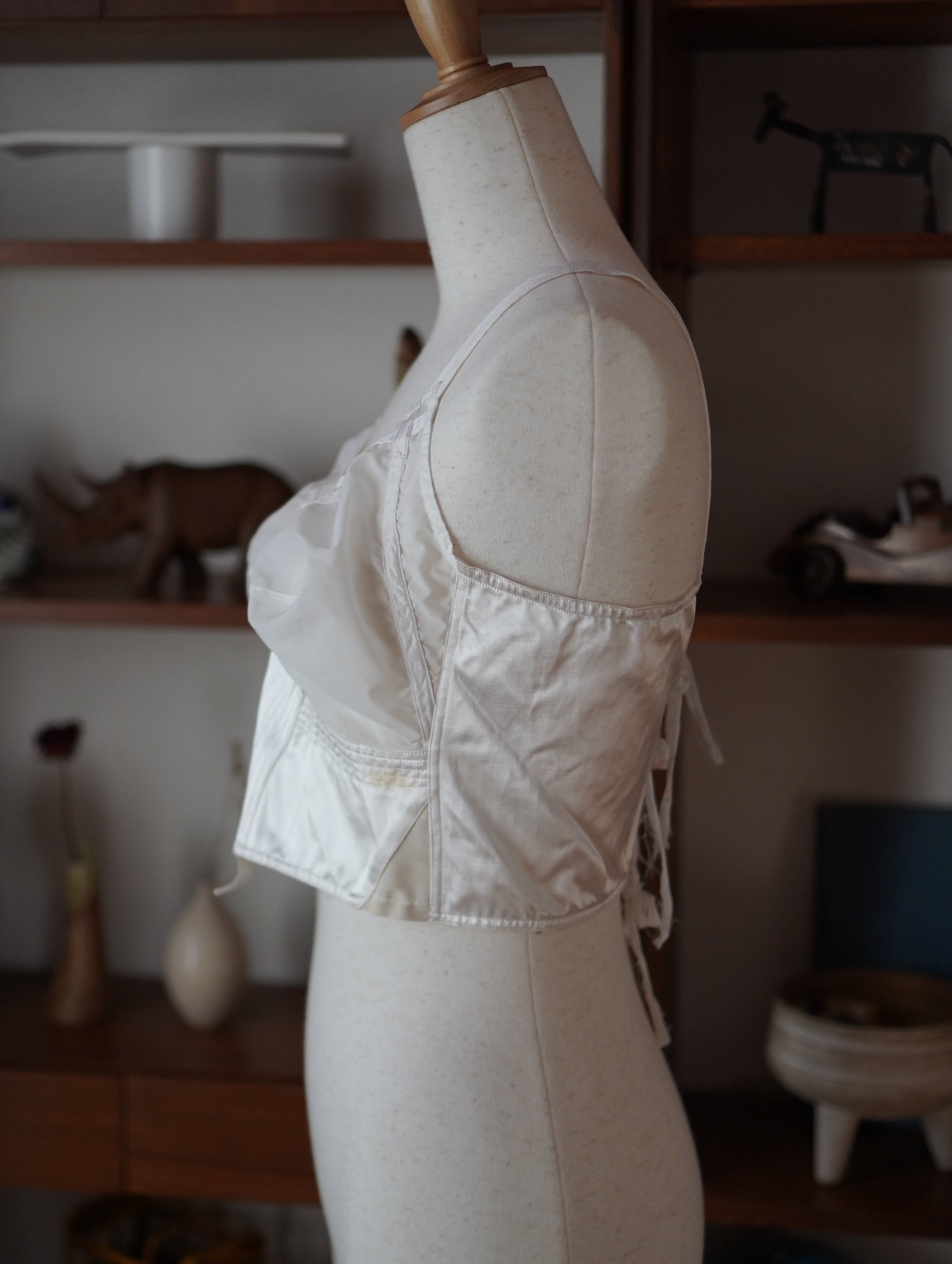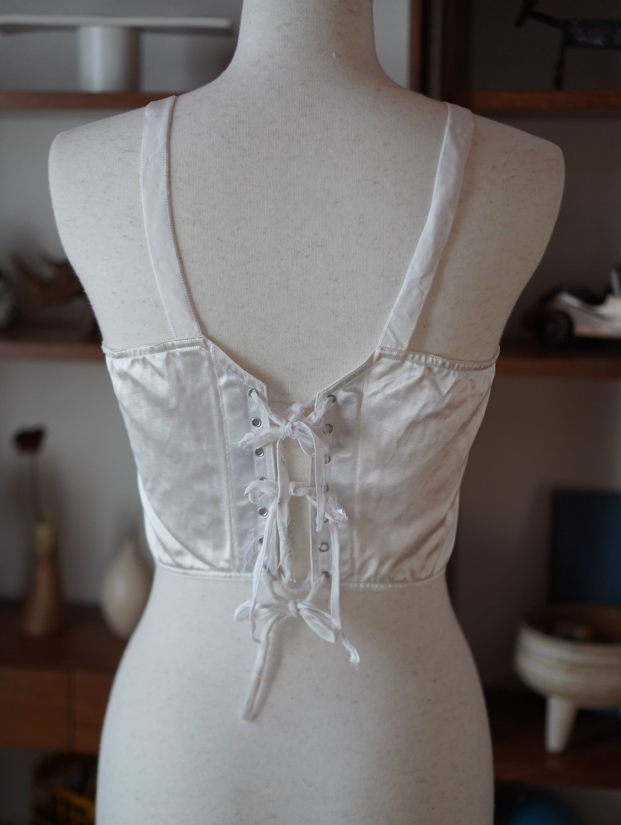 バスト部分がほんのり透けるデザインがチャームポイントな、50's∼60's頃のヴィンテージビスチェトップ。古いタグが残ってくれているところもうれしいポイント。バックはレースアップ仕様。もともとの紐がなかったため、ヴィンテージの紐を組み合わせ、リボン結びで仕上げています。