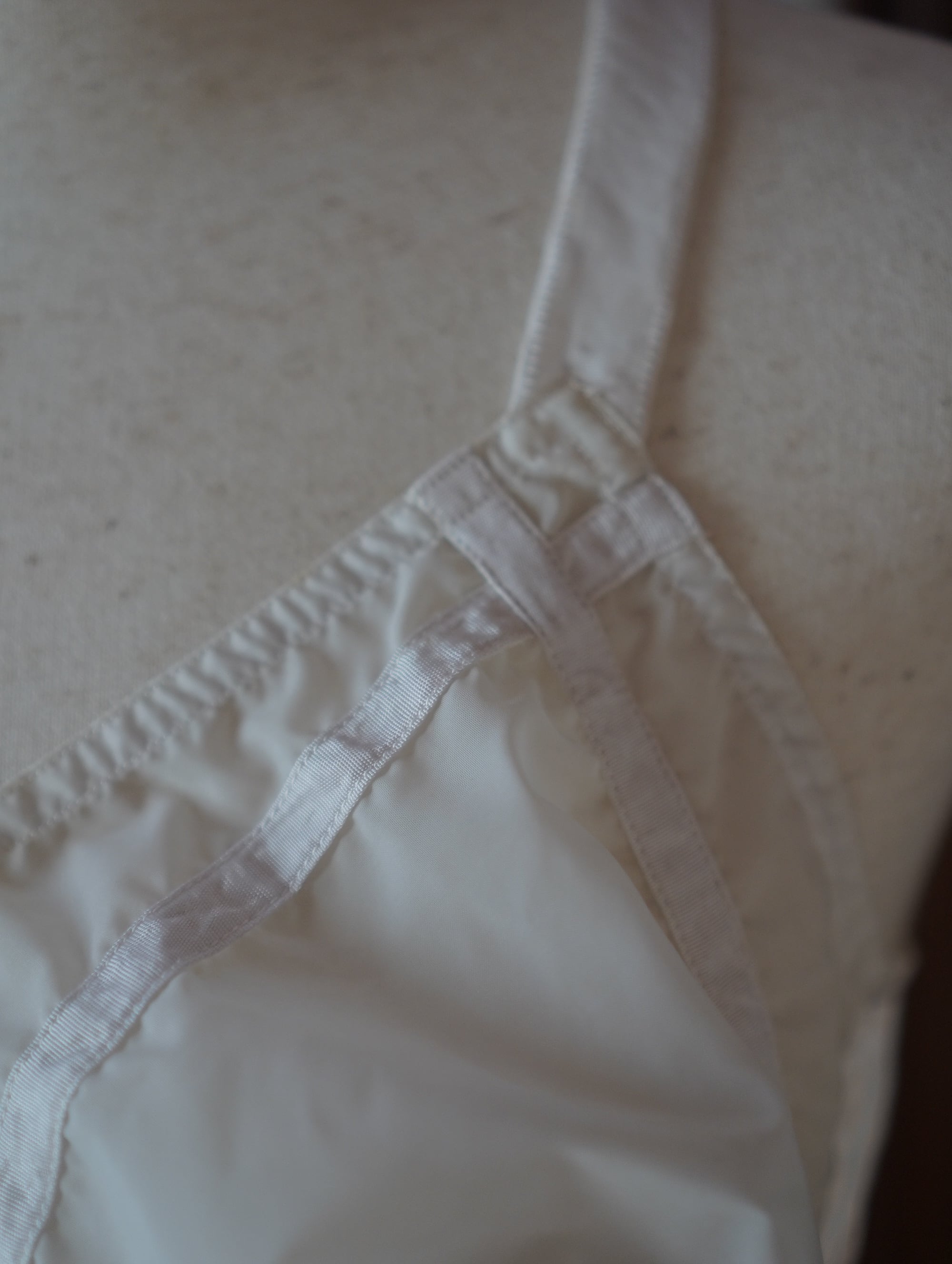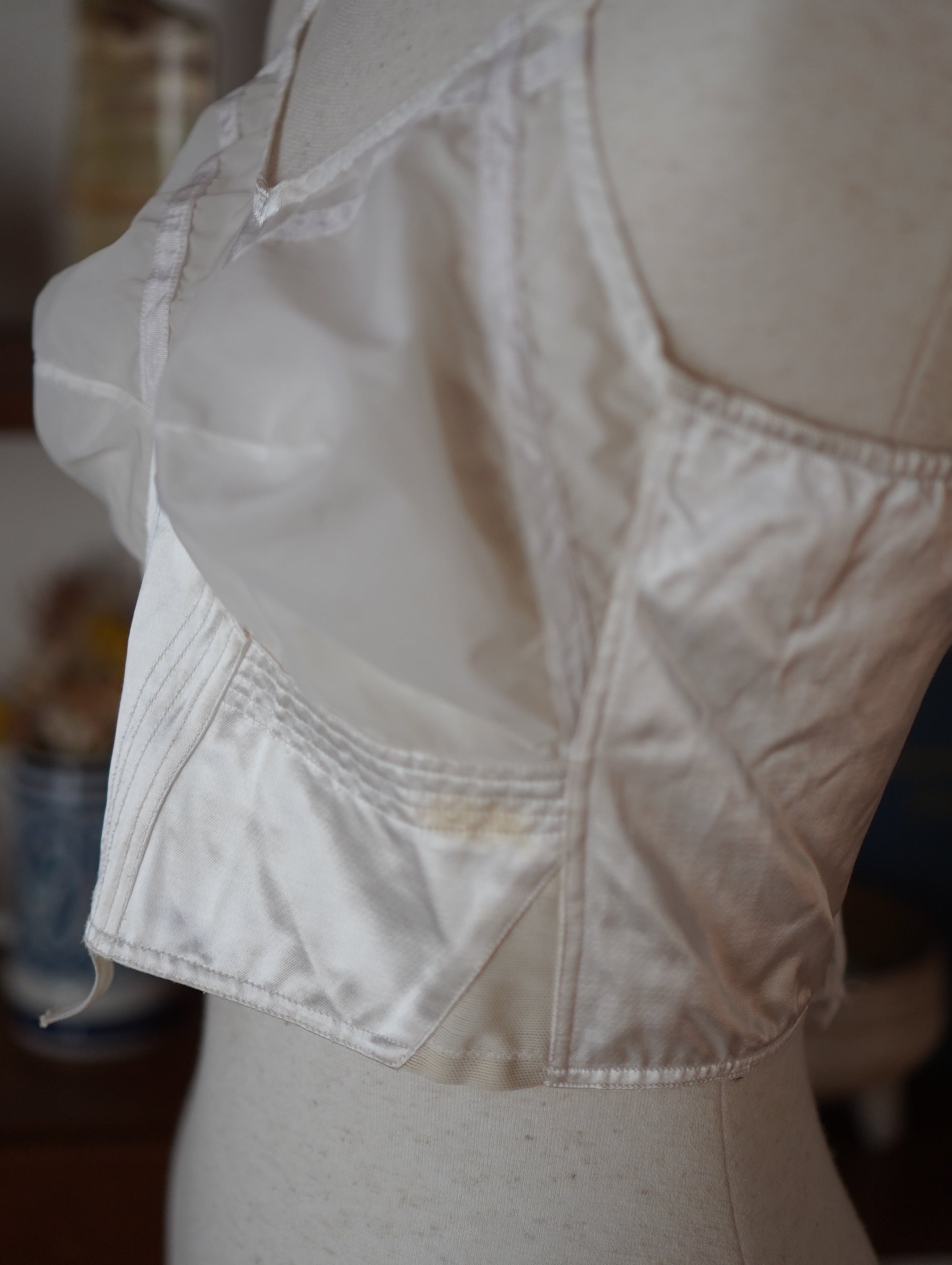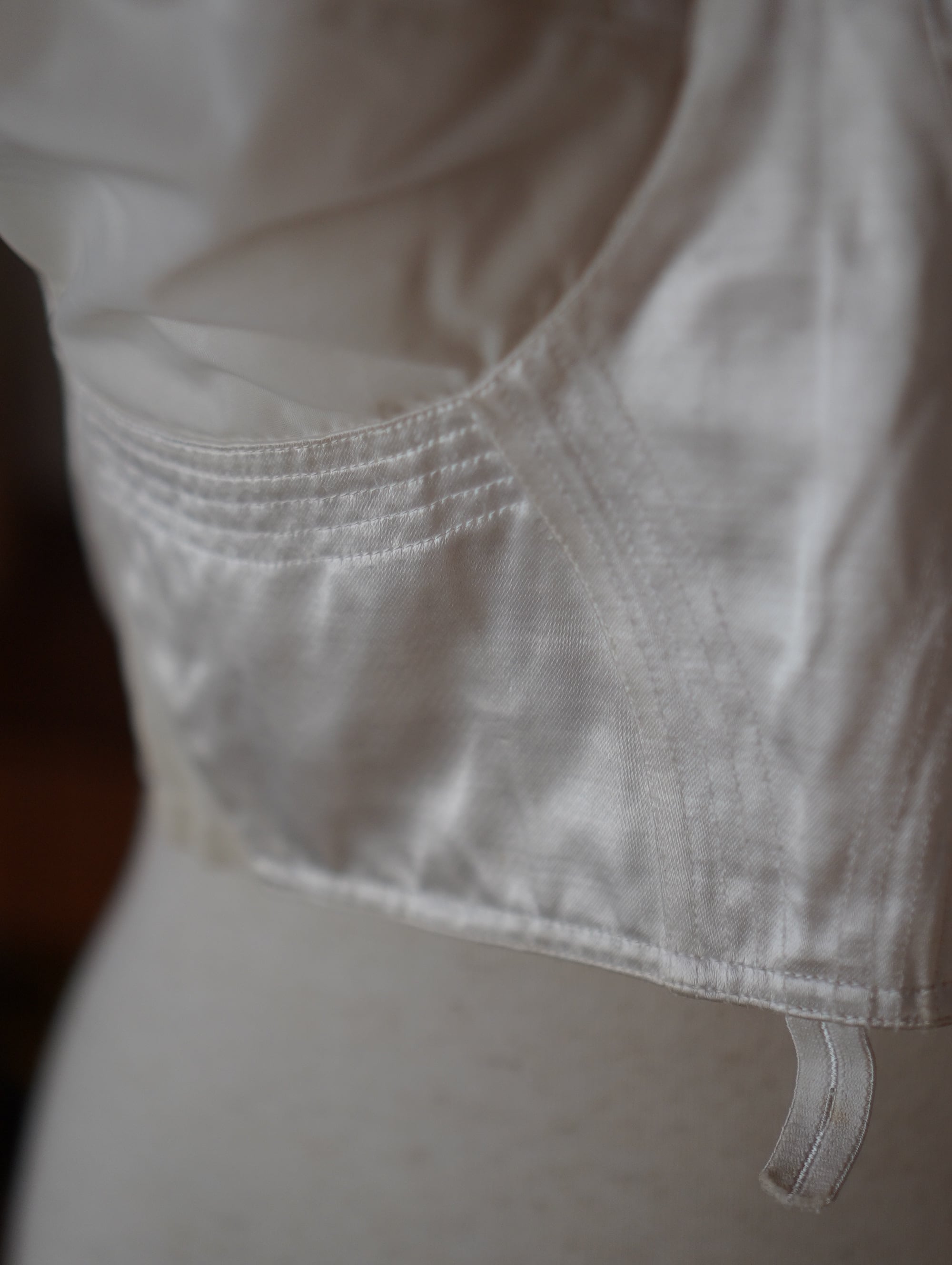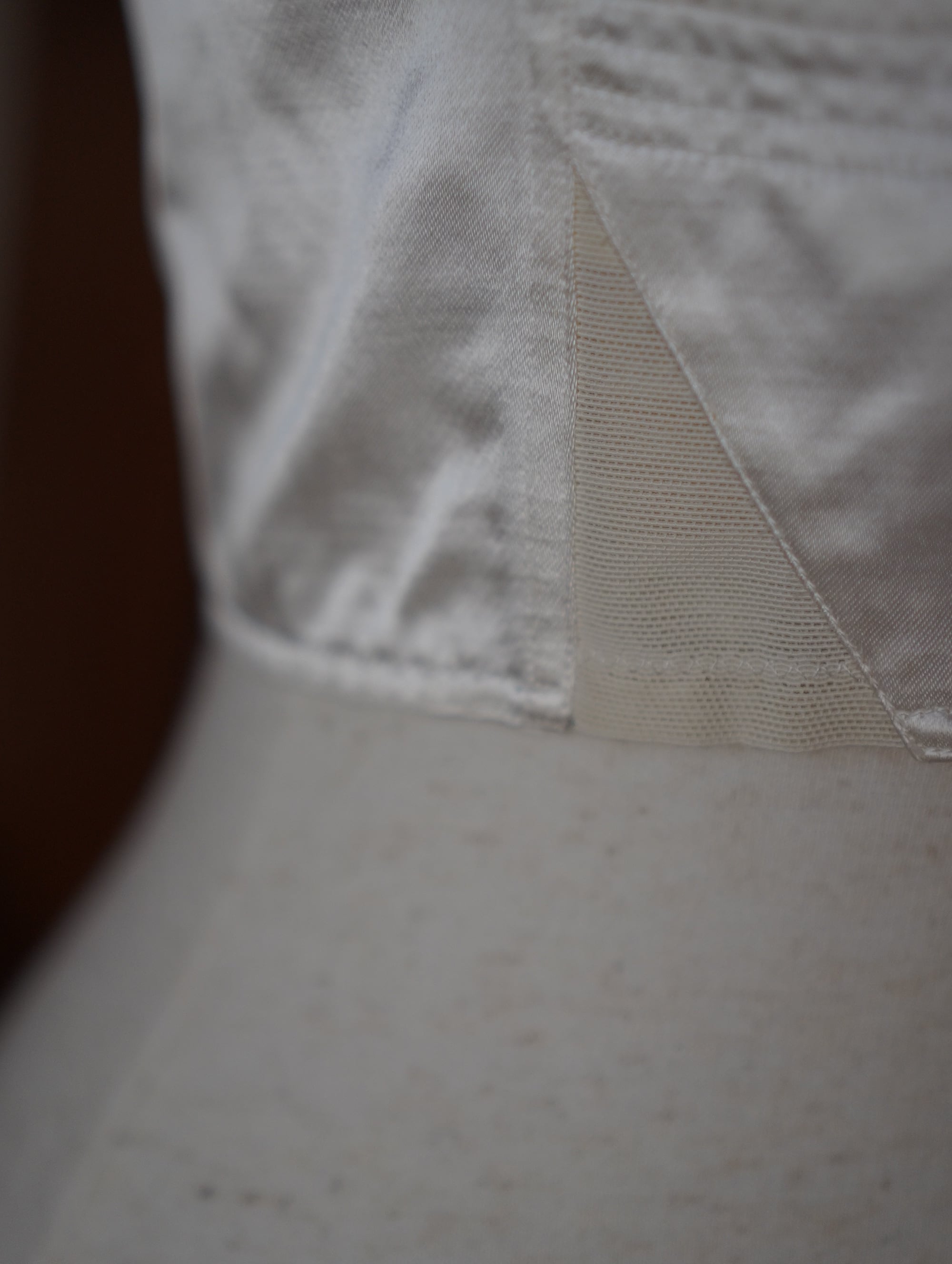バスト部分がほんのり透けるデザインがチャームポイントな、50's∼60's頃のヴィンテージビスチェトップ。古いタグが残ってくれているところもうれしいポイント。バックはレースアップ仕様。もともとの紐がなかったため、ヴィンテージの紐を組み合わせ、リボン結びで仕上げています。