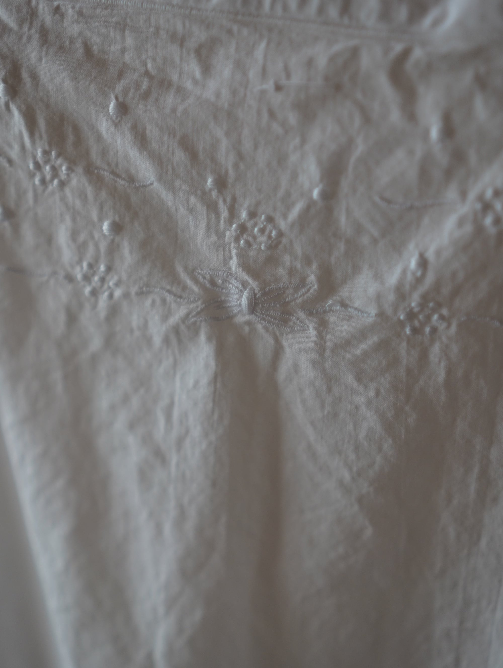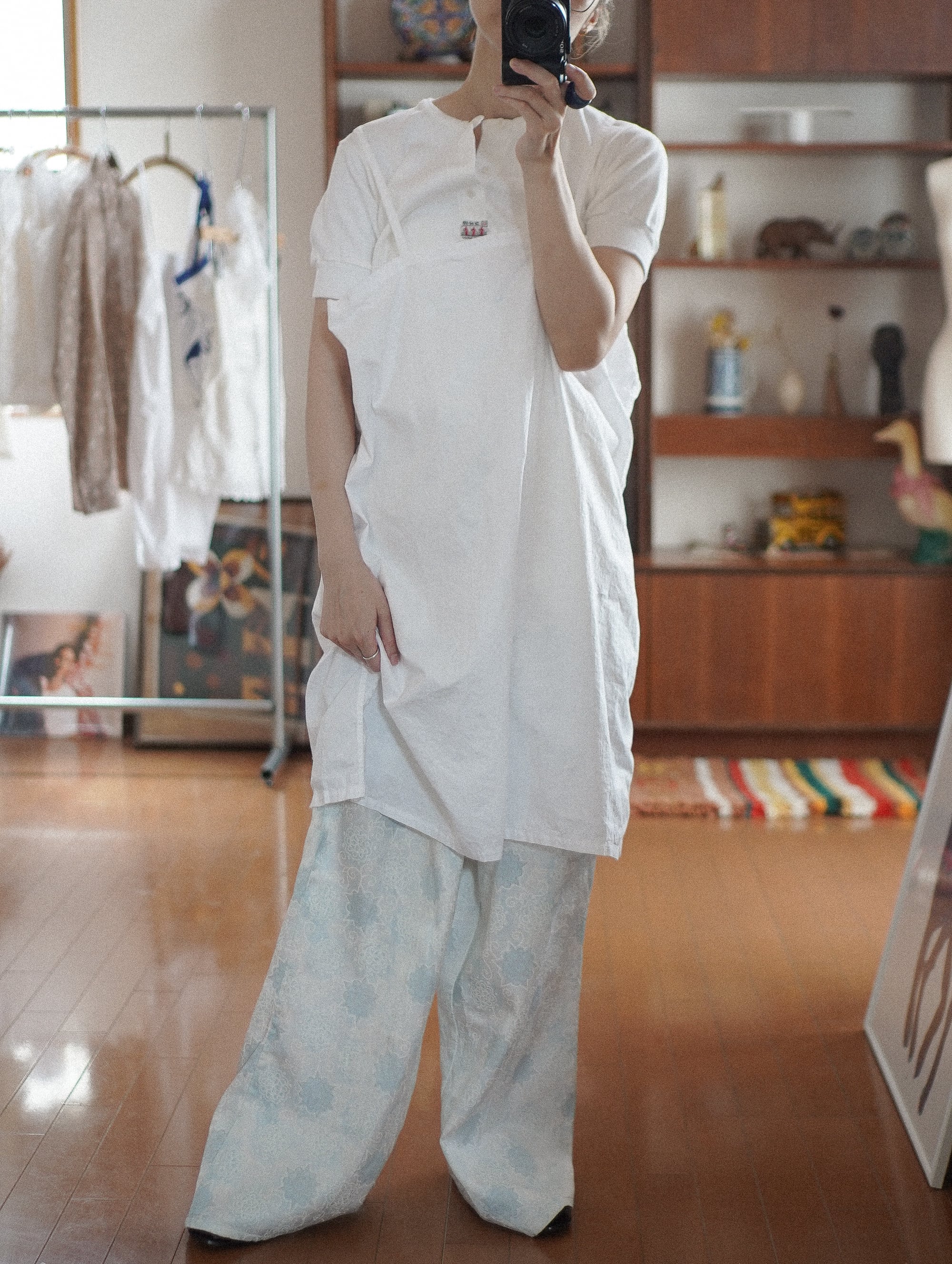 身幅おおきめでゆるっとしたシルエットと、さりげない刺繍がやさしくきゅんとさせてくれるところがチャームポイント。