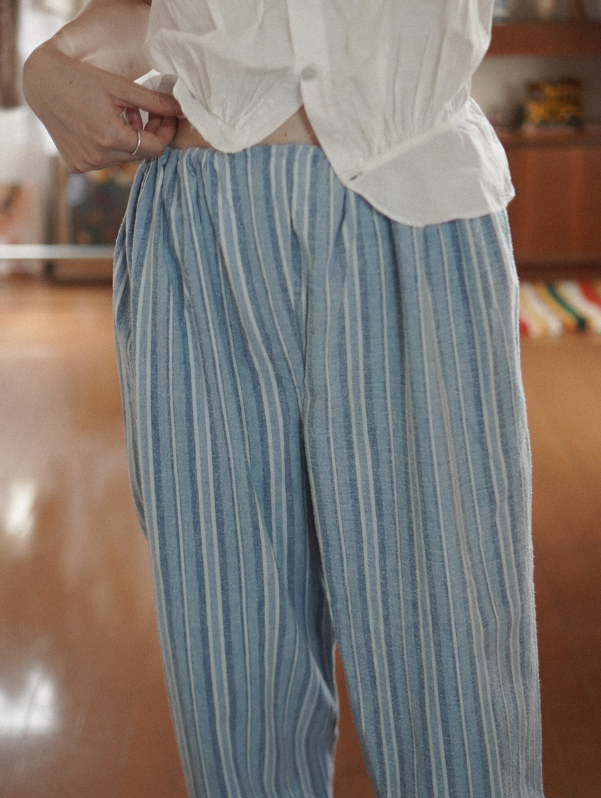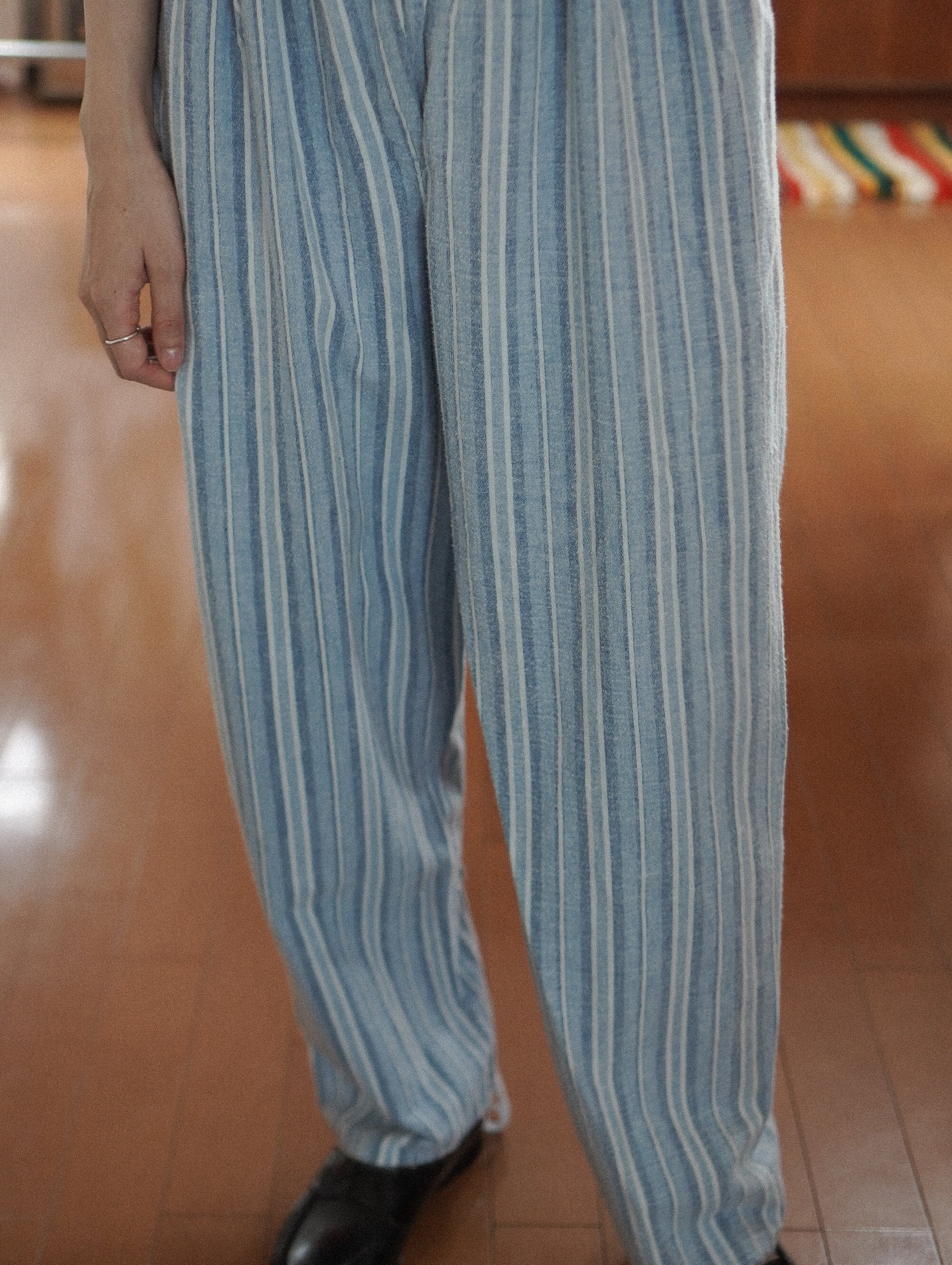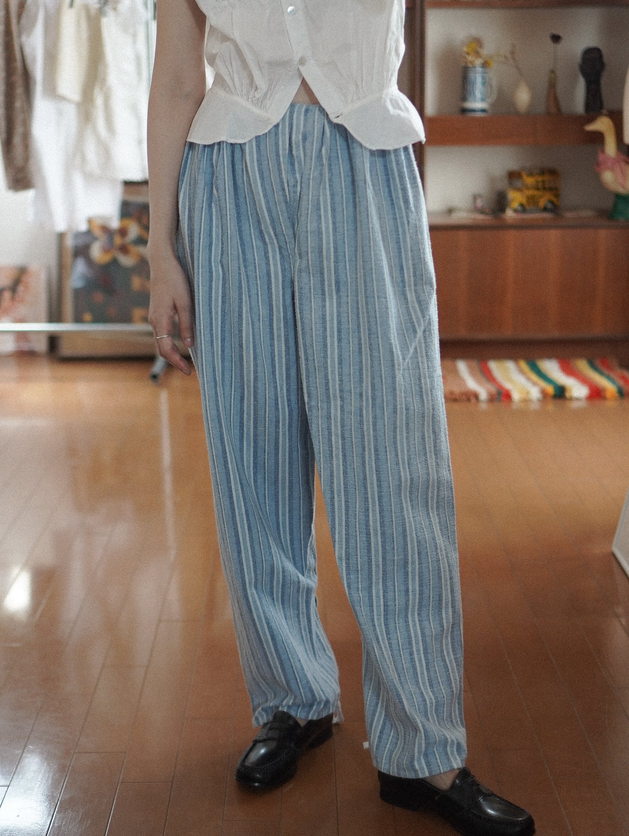 ヴィンテージならではの絶妙な淡いブルーにホワイトのストライプがキュートなパジャマパンツ。