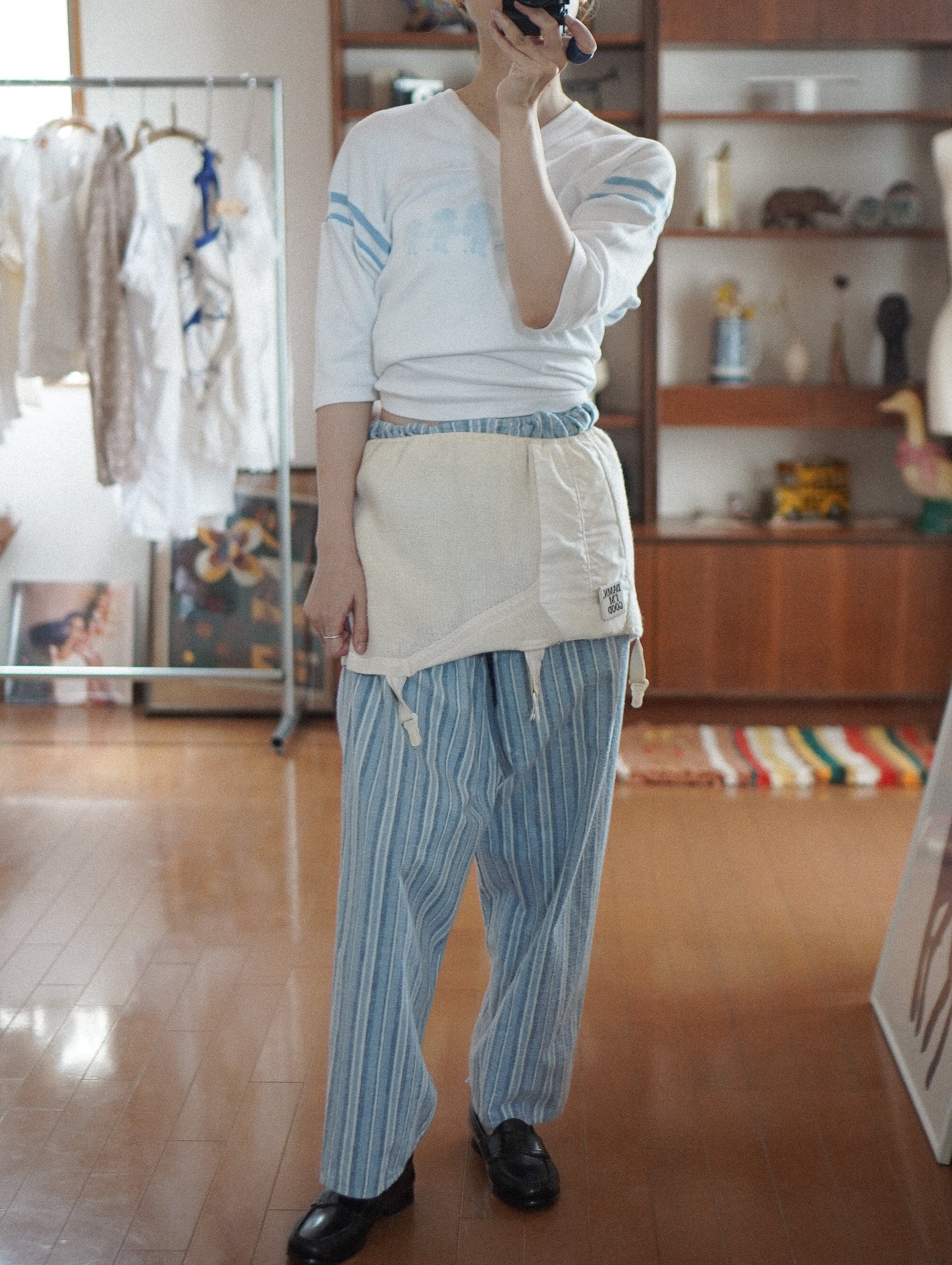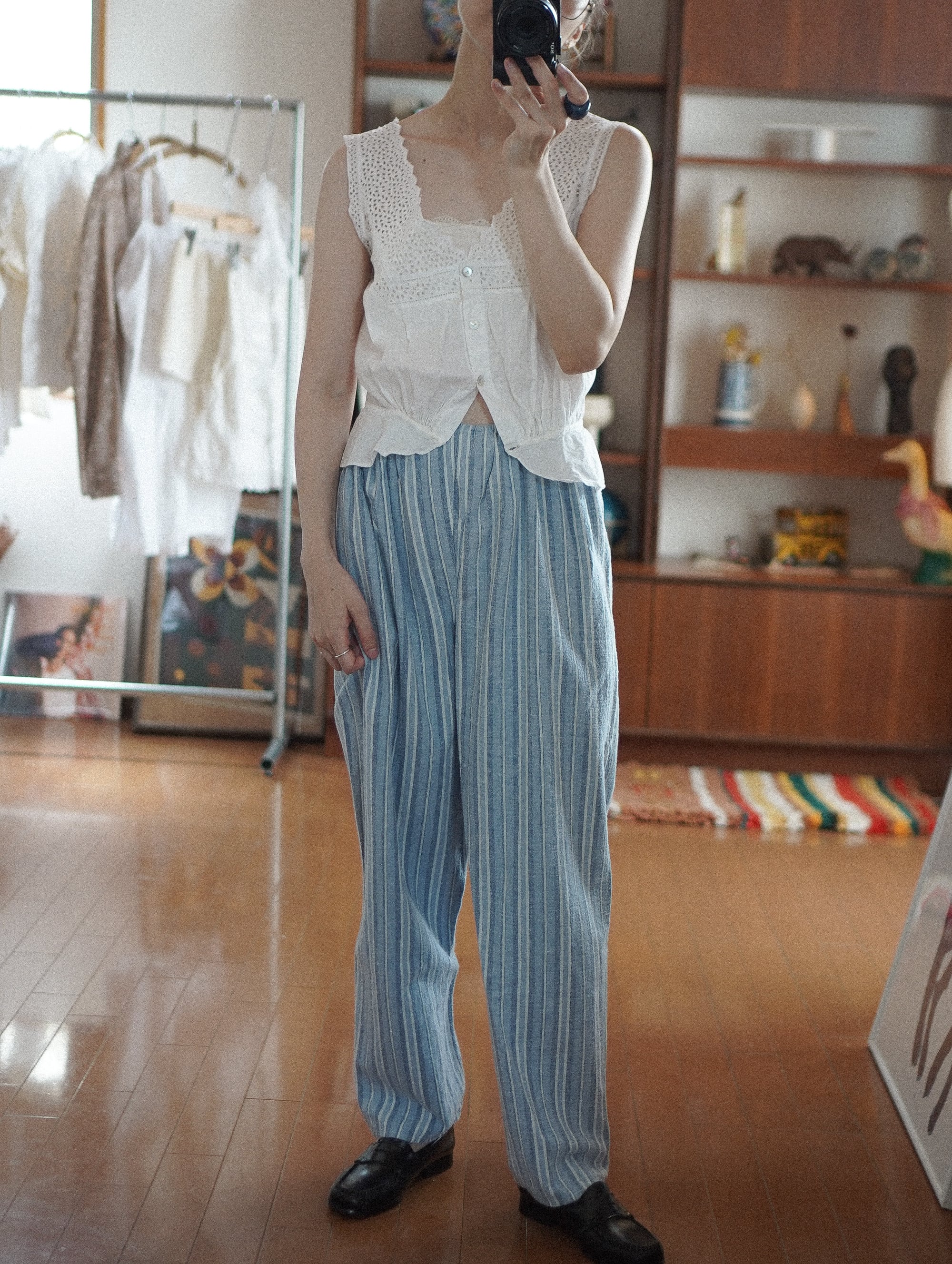 裾にはさりげないスリットとリボン紐が施されていて、動いたときにちらっと見えるディテールがきゅんポイント。デイリーに取り入れやすく、つい手に取りたくなる一着です。/ vintage striped pajama pants