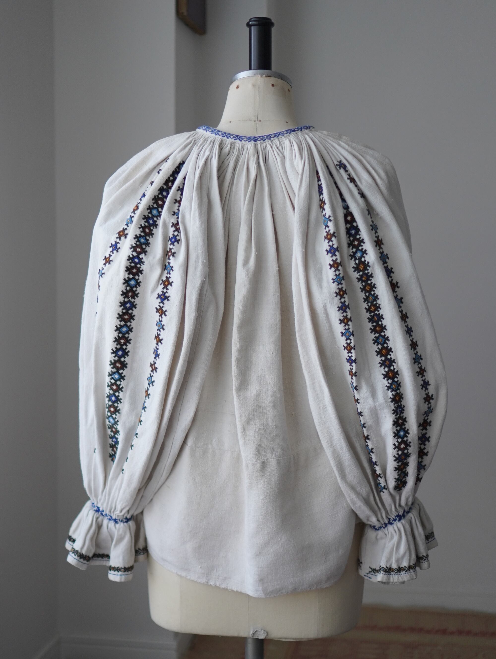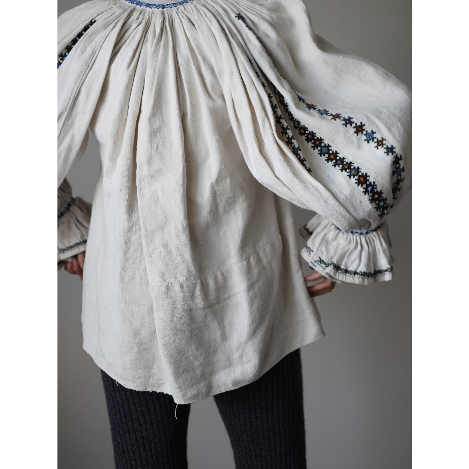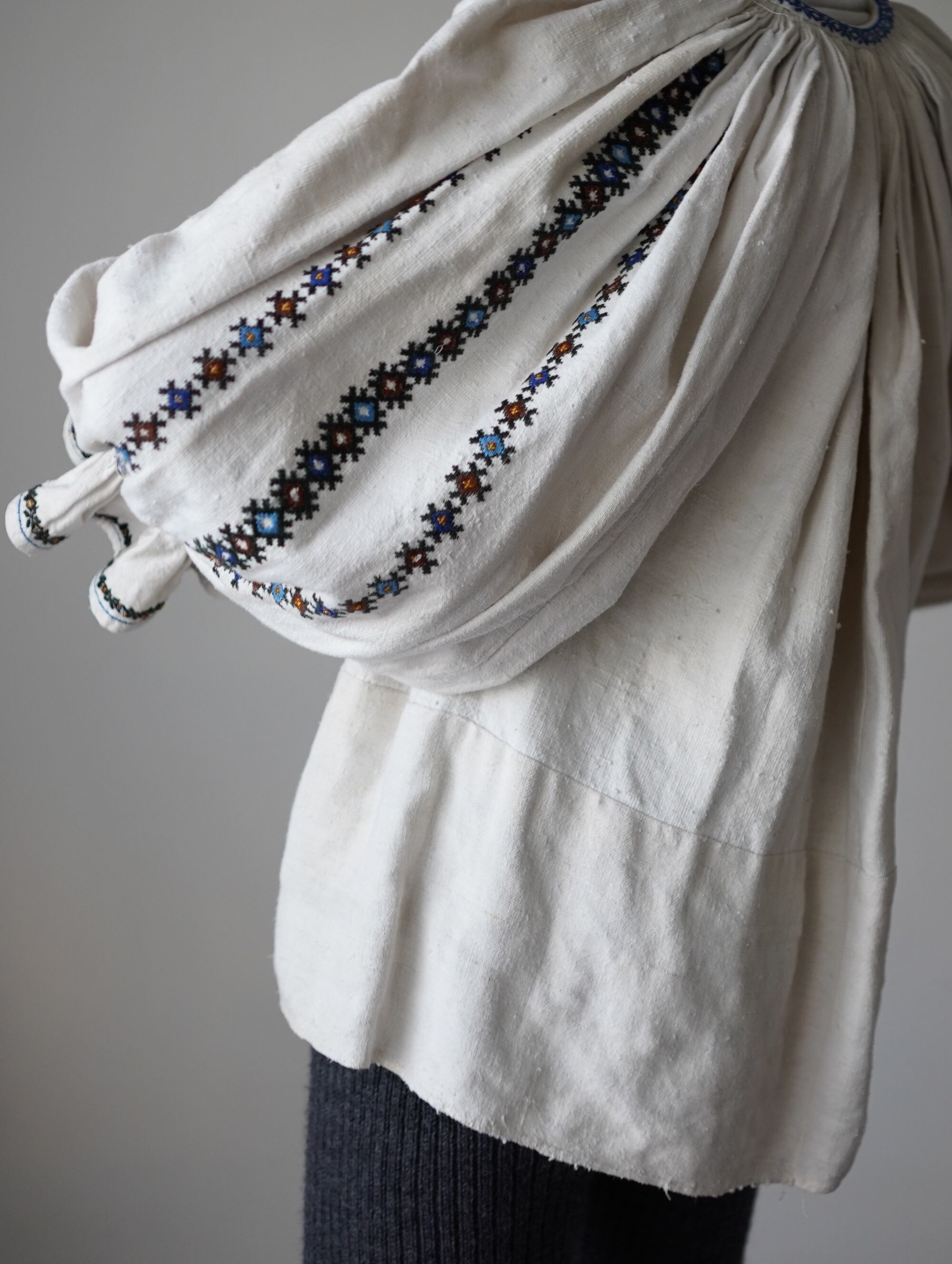 ルーマニアの現地で出会った、刺繍ブラウス。圧巻の手刺繍から、強さと愛情を感じます。そで口や首元の丁寧な刺繍は、外見から身を守る意味もあるそう。手織りの厚手コットン地に、袖たっぷりのプリーツがチャームポイント。裏側の写真(28枚目)も載せておりますので、すこしでも手仕事の美しさが少しでも伝わればと思います。