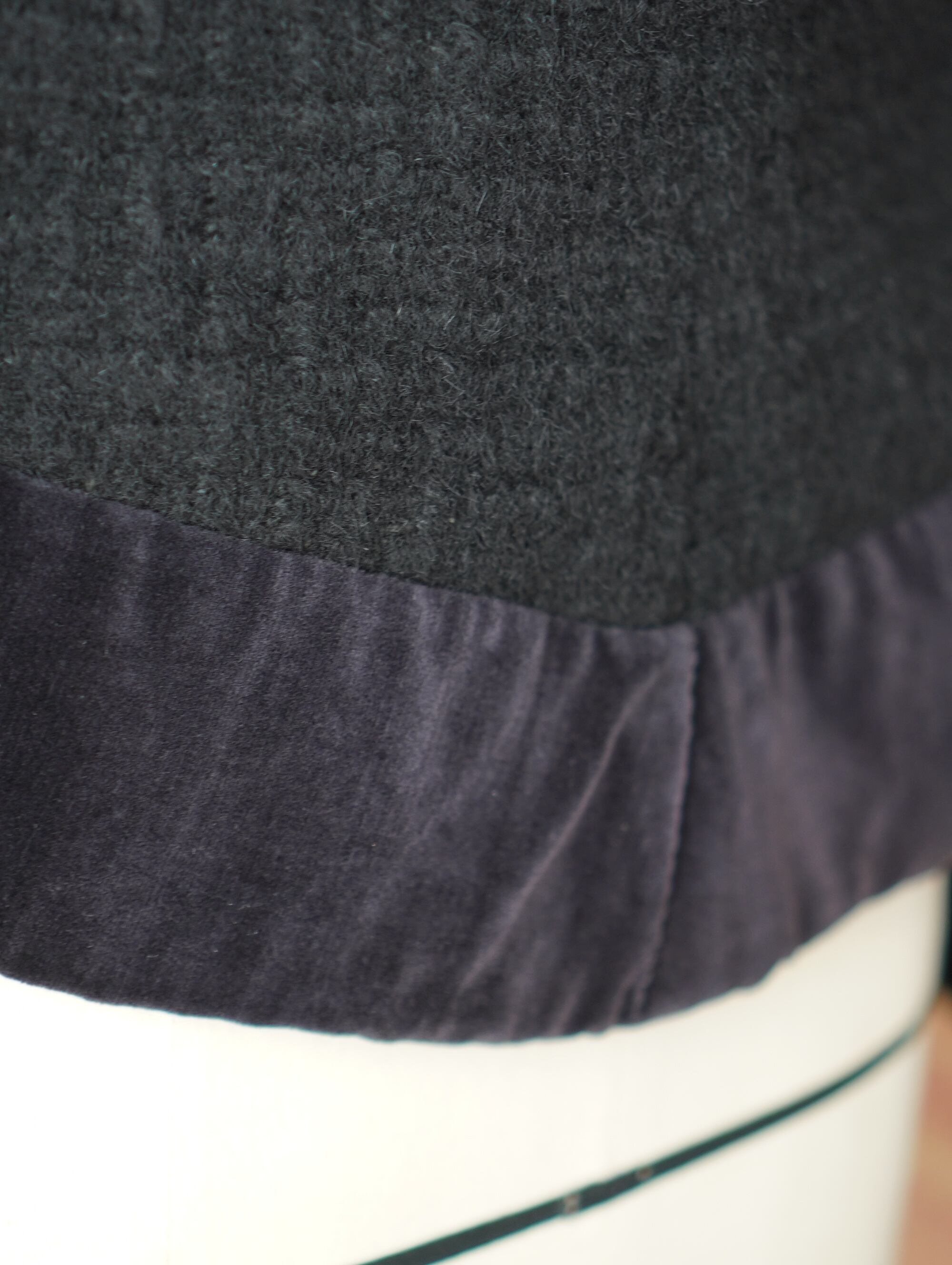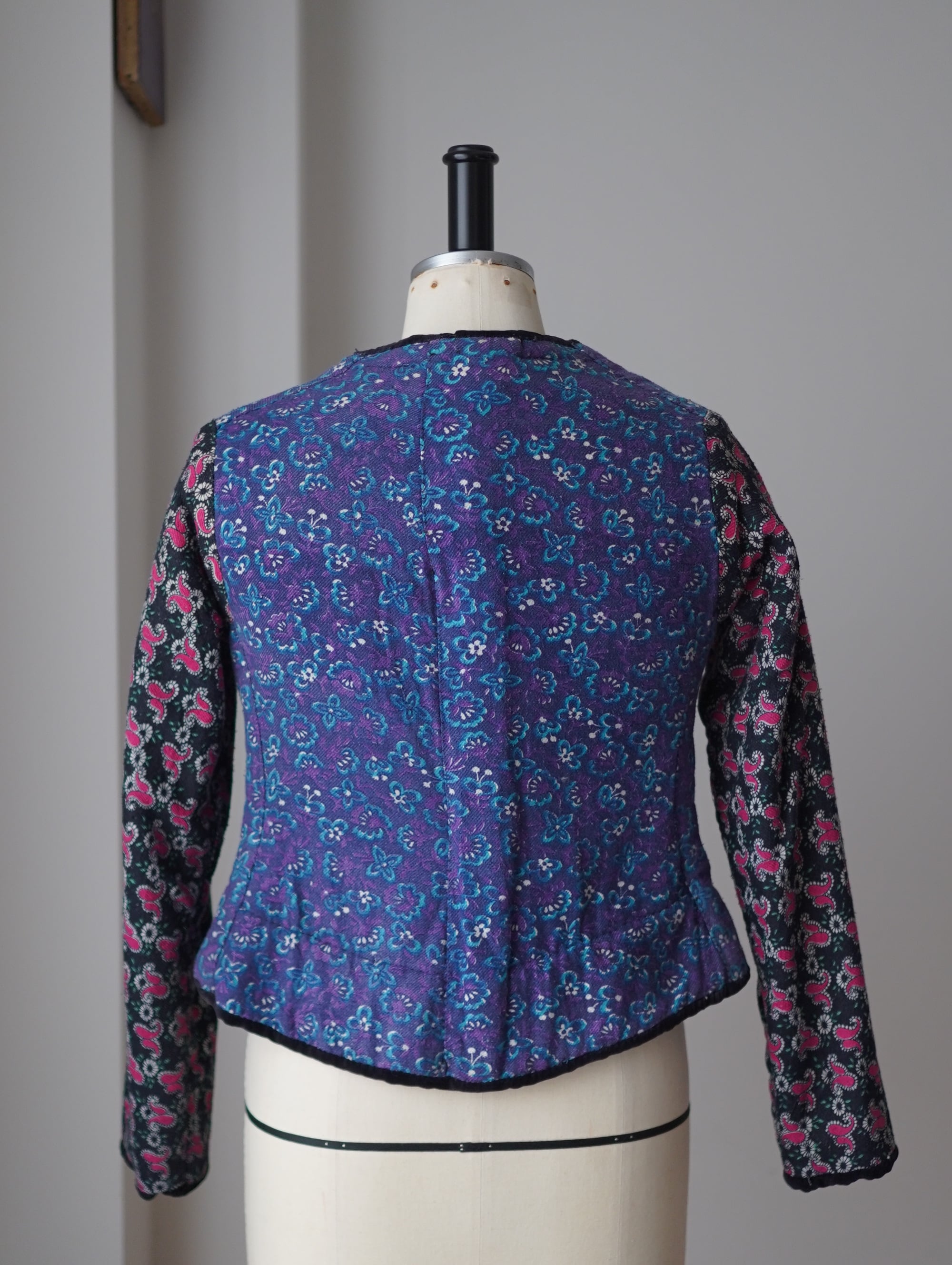 ルーマニアで出会った優しいおばあちゃまのお手製。お子様のために作ったというウールジャケットだそう。すべて愛情のこもった手縫いです。裏側はパープルとブルーのお花柄、袖部分にはピンクのペイズリー柄。表側は品のあるブラック。タイトなシルエットで丈も短め。ボリュームのあるコートやジャケットを上から重ねてもバランス良さそうです。普段XS~Sを着用される方や、kidsの150、160sizeも着ちゃいますという大人の方におすすめのサイズ感です。