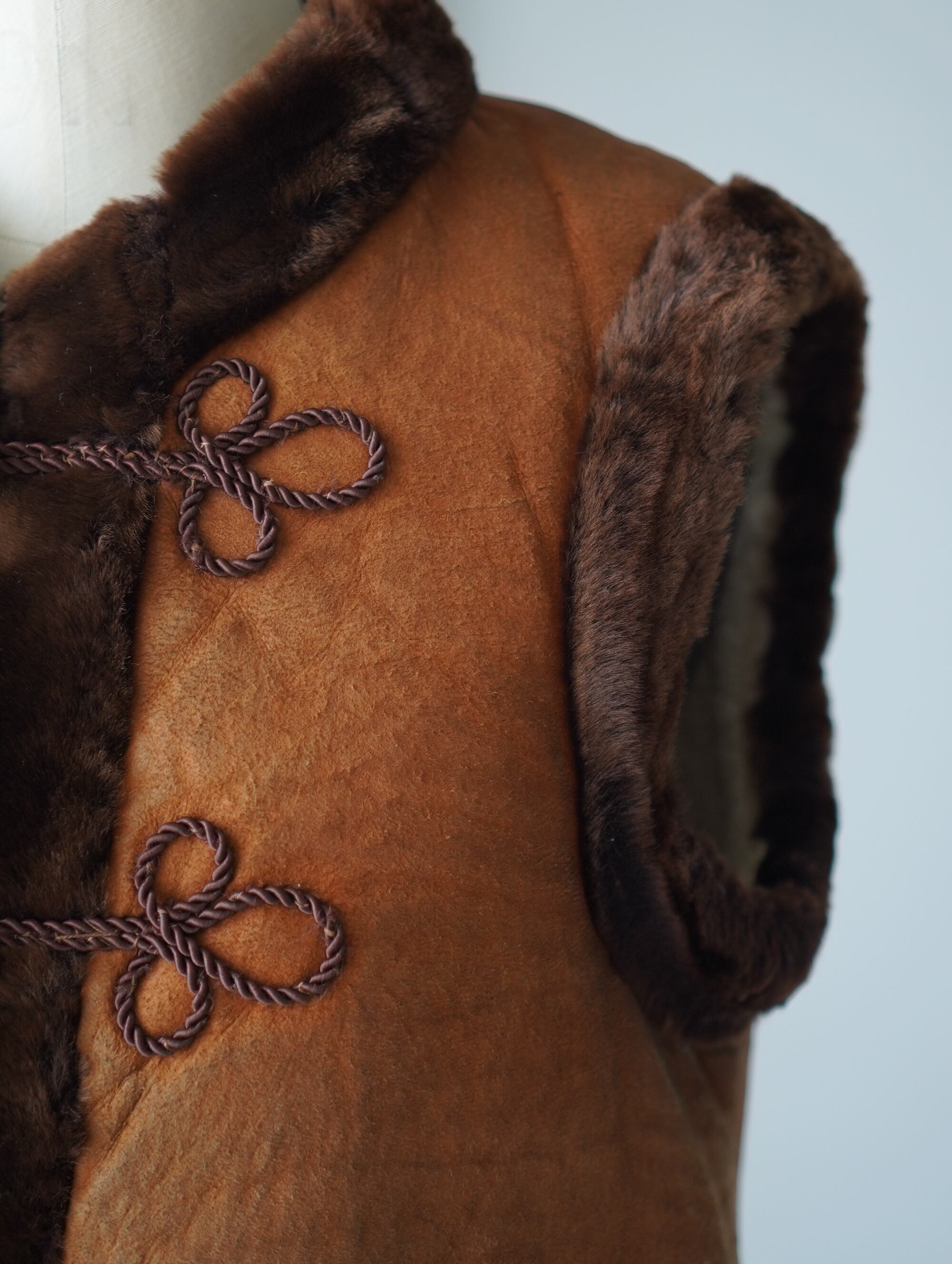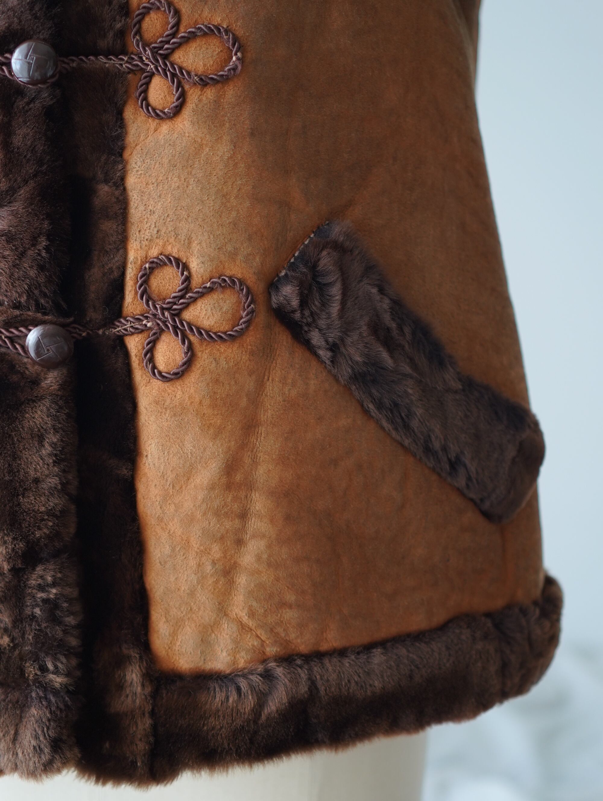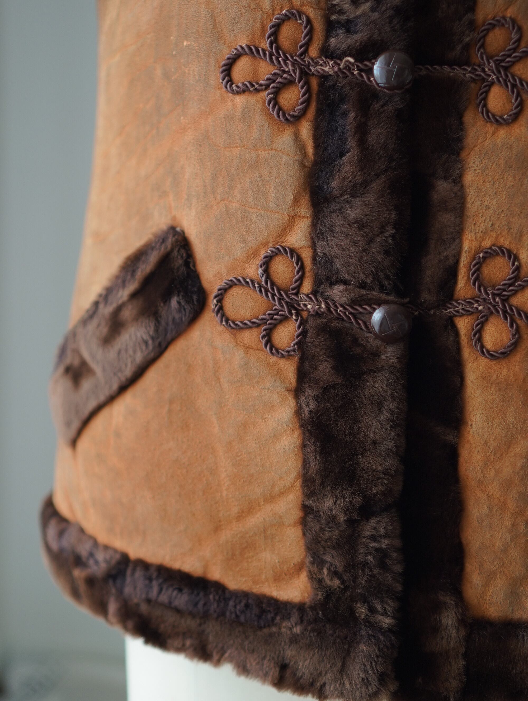 刺繍を愛好するマダムからお譲りいただきました、フォークダンス用のムートンベスト。ボタンまわりにあるツイストコードの装飾がチャームポイント。オーバーサイズなシルエットもまたチャーミングさが増します。使い古されている感じがまた雰囲気が良いです。古着をよく着用される方におすすめいたします。柄物のワンピースやレースとも相性良いです。