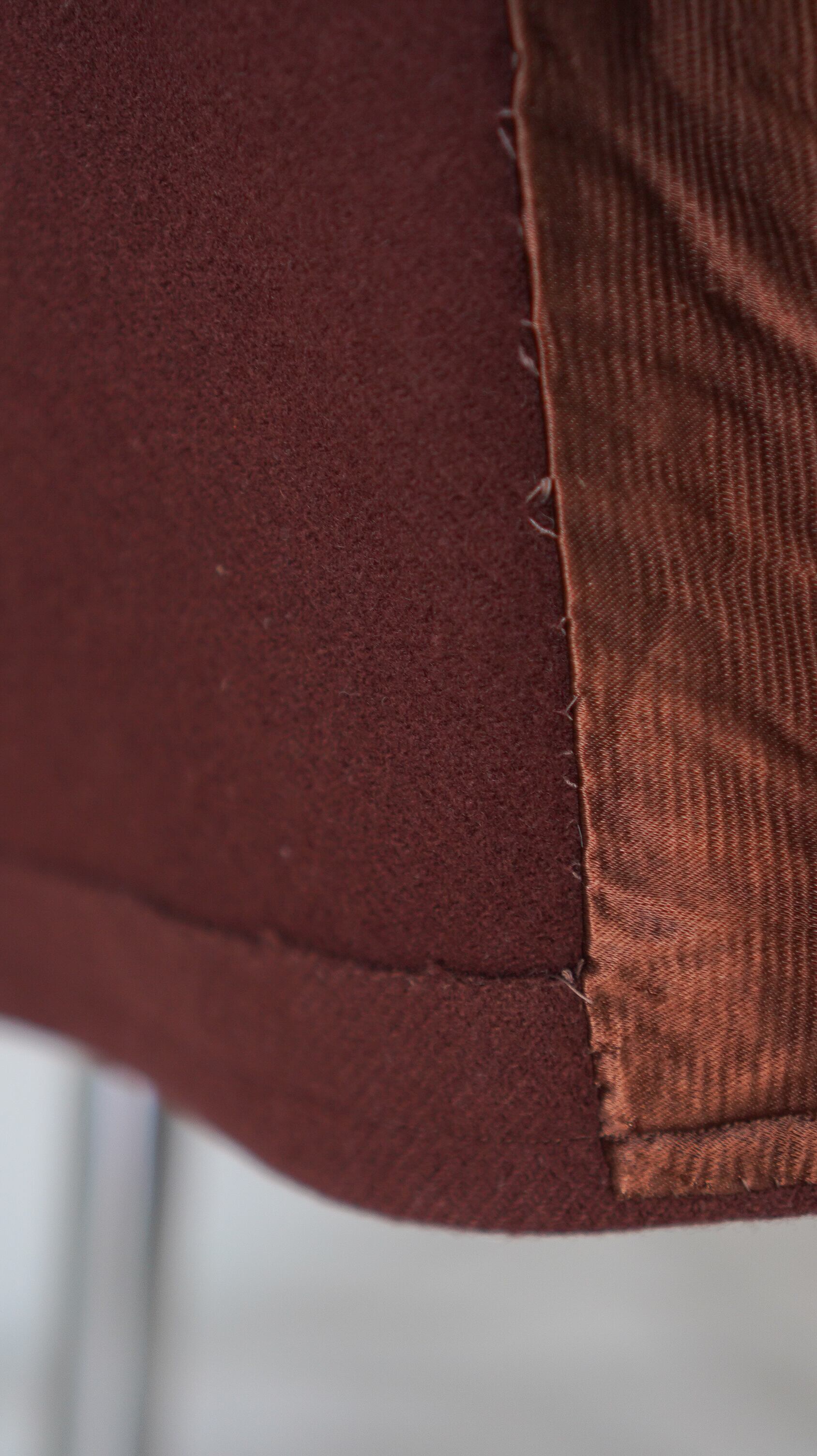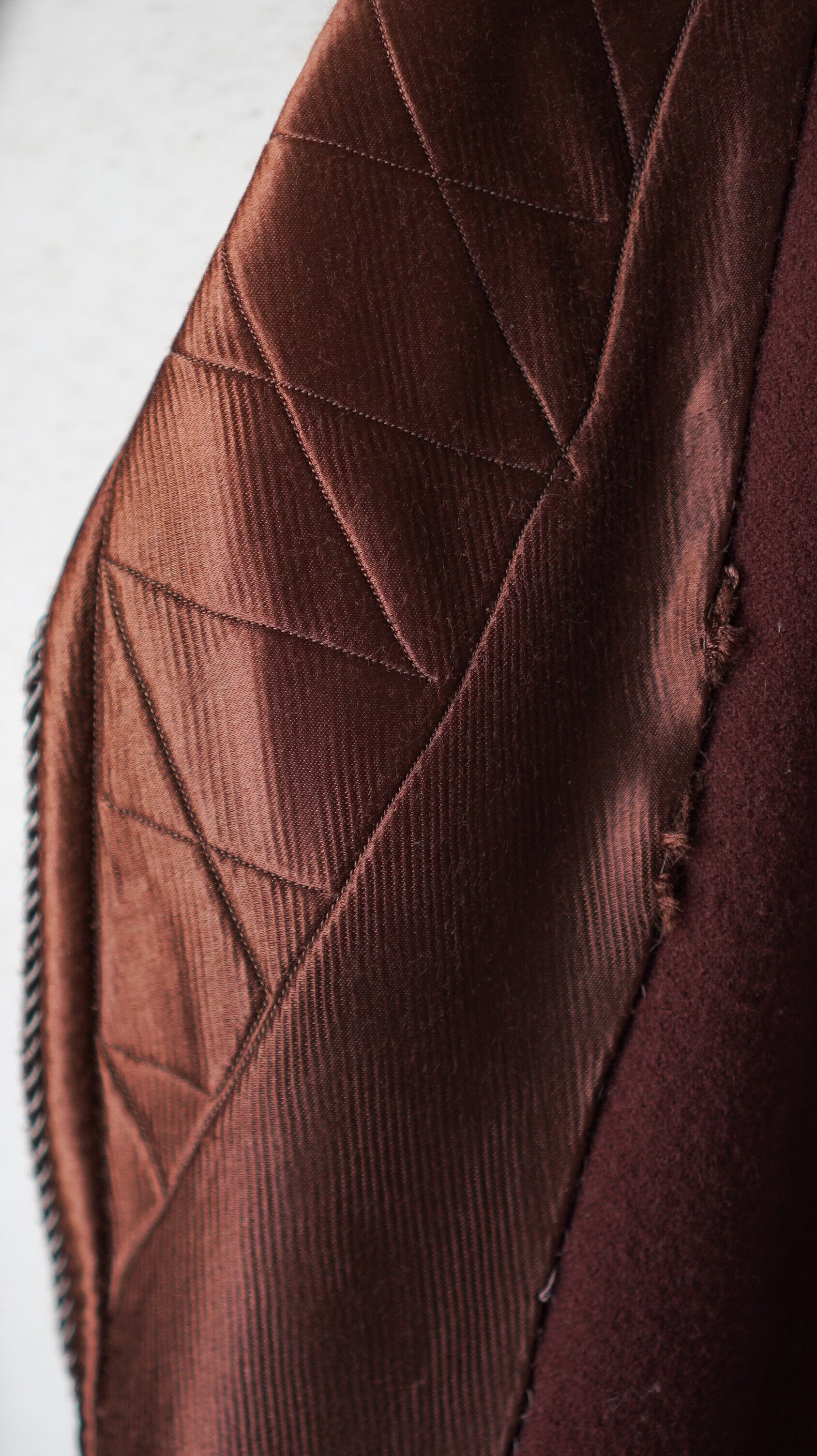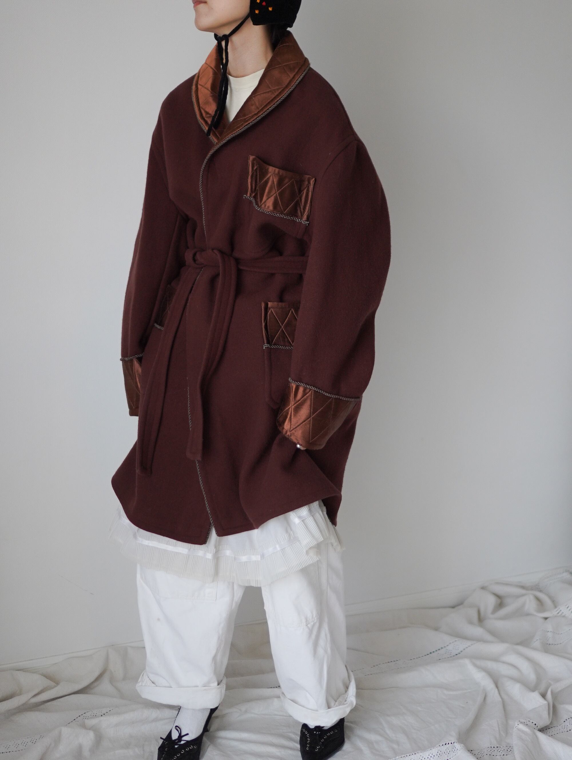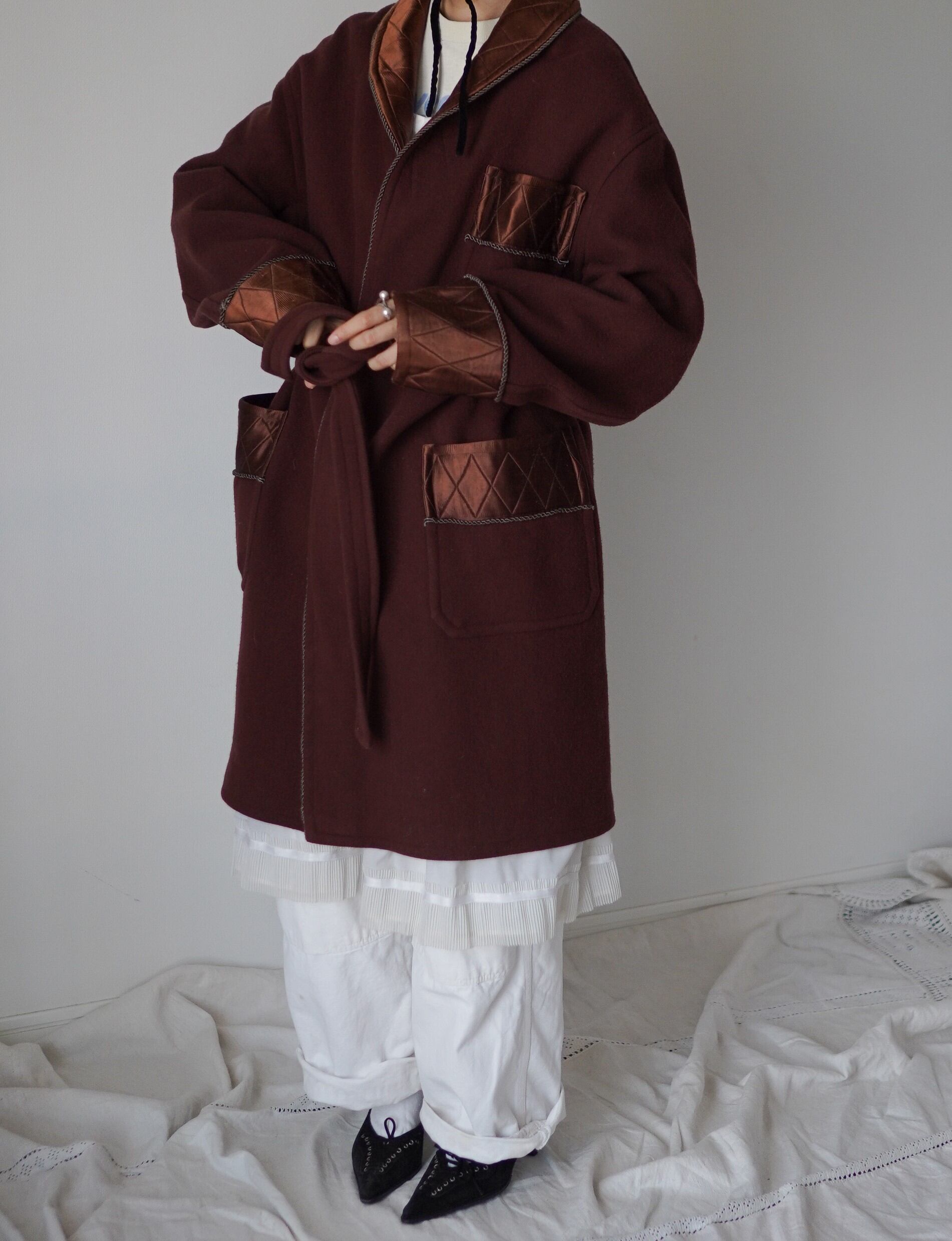 1950代頃に実際にご家族が着用されていたメンズ用のガウンだそう。襟、ポケット、袖口に施されたシルク素材が高貴な雰囲気を漂わせます。絶妙なバーガンディーカラーがとにかくかっこいい。さくっと羽織りたいときに重宝いただけるアイテムかと思います。
