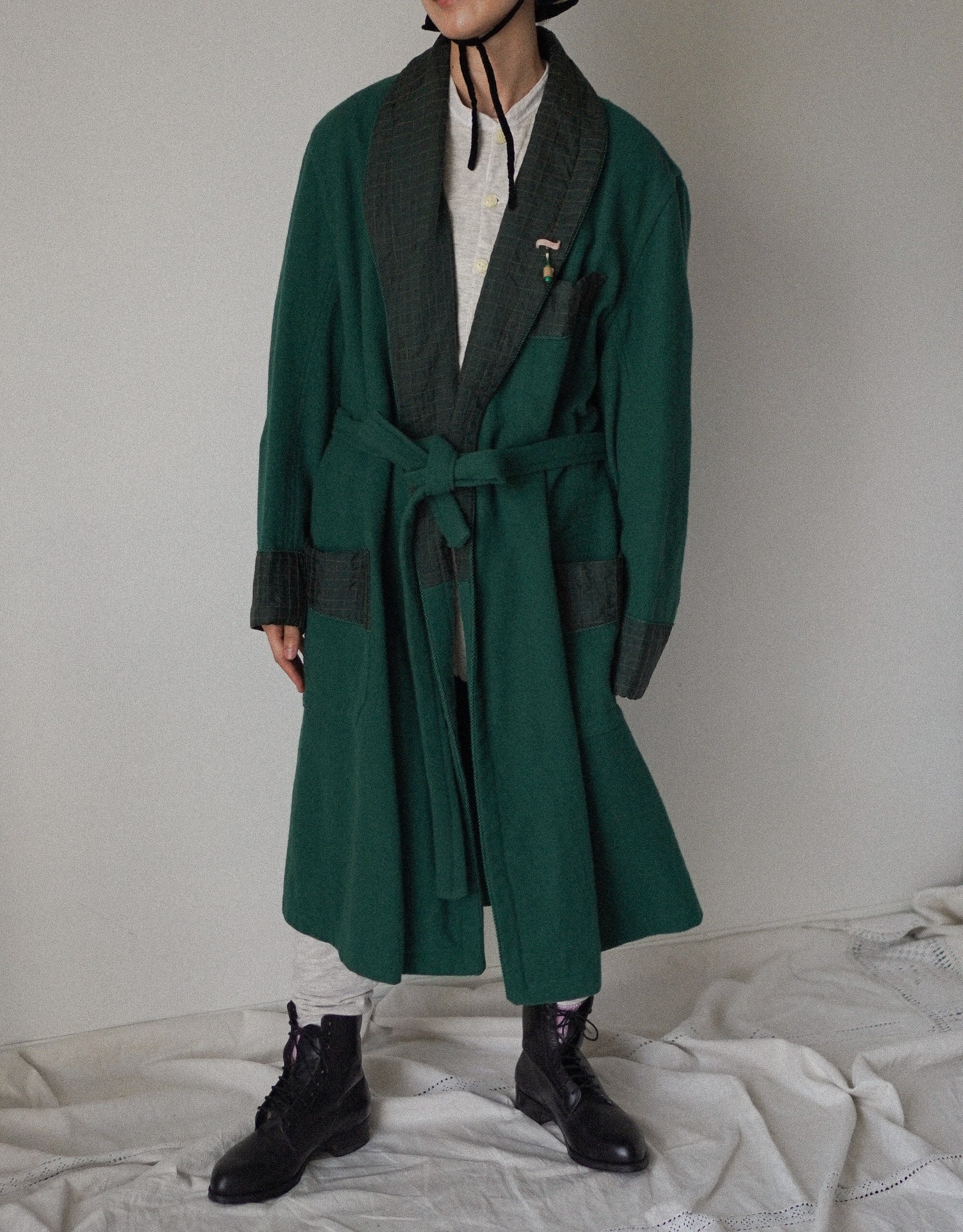 1950代頃に実際にご家族が着用されていたメンズ用のガウンだそう。左袖に一箇所キャラメル色に染まっているところがございますが、状態は良好です。華やかなグリーンカラーが新鮮でスタイリングが楽しくなりそう。オーバーサイズなところも少年っぽさがプラスされてかわいい。さくっと羽織りたいときに重宝いただけるアイテムかと思います。